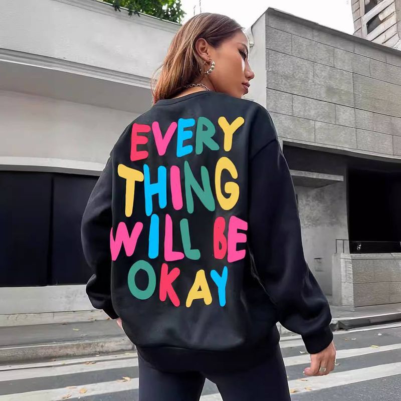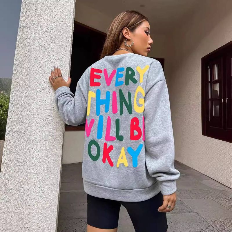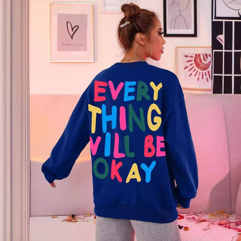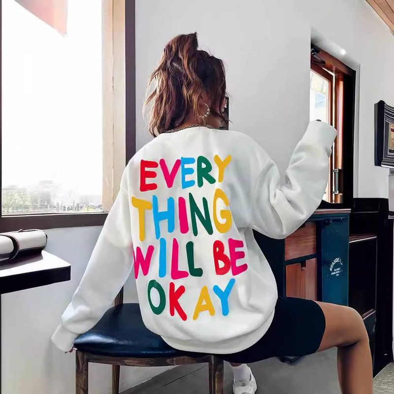بلوزة رياضية أنيقة للنساء كل شيء سيكون بخير طباعة أحرف تي شيرت فضفاض دافئ برقبة مستديرة مع هودي مقاسات كبيرة ملابس نسائية