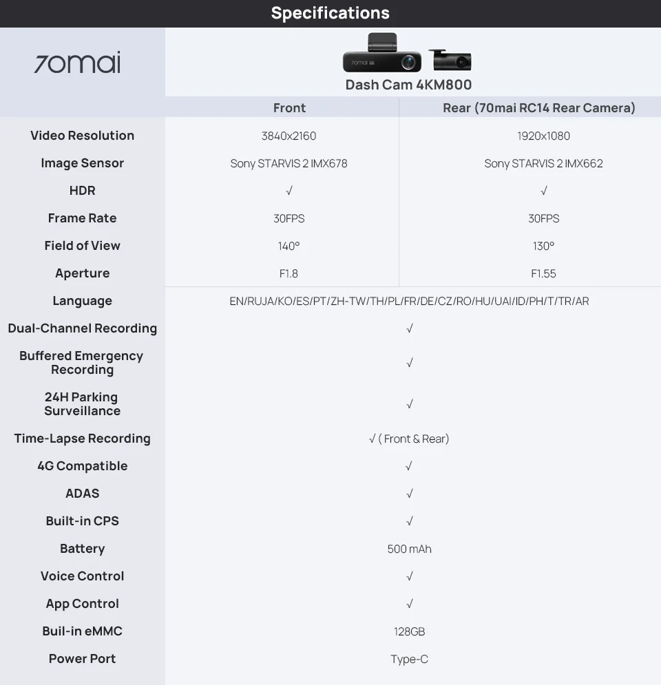 70mai Dash Cam 4K M800 2160P eMMC المدمج في 128GB GPS ADAS يدعم 24H وقوف السيارات الحرس 4G متوافق مع نسخة مطورة. من 70mai M500