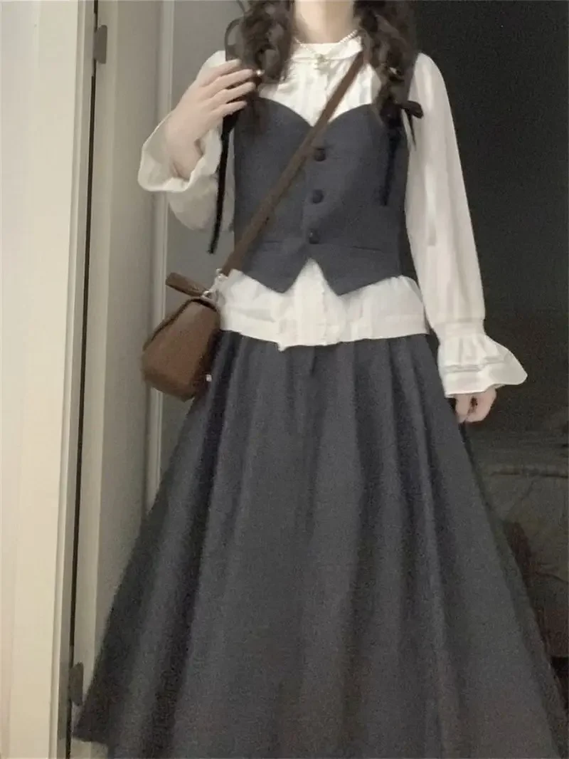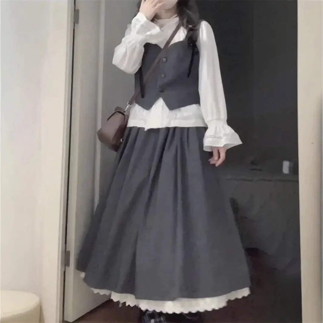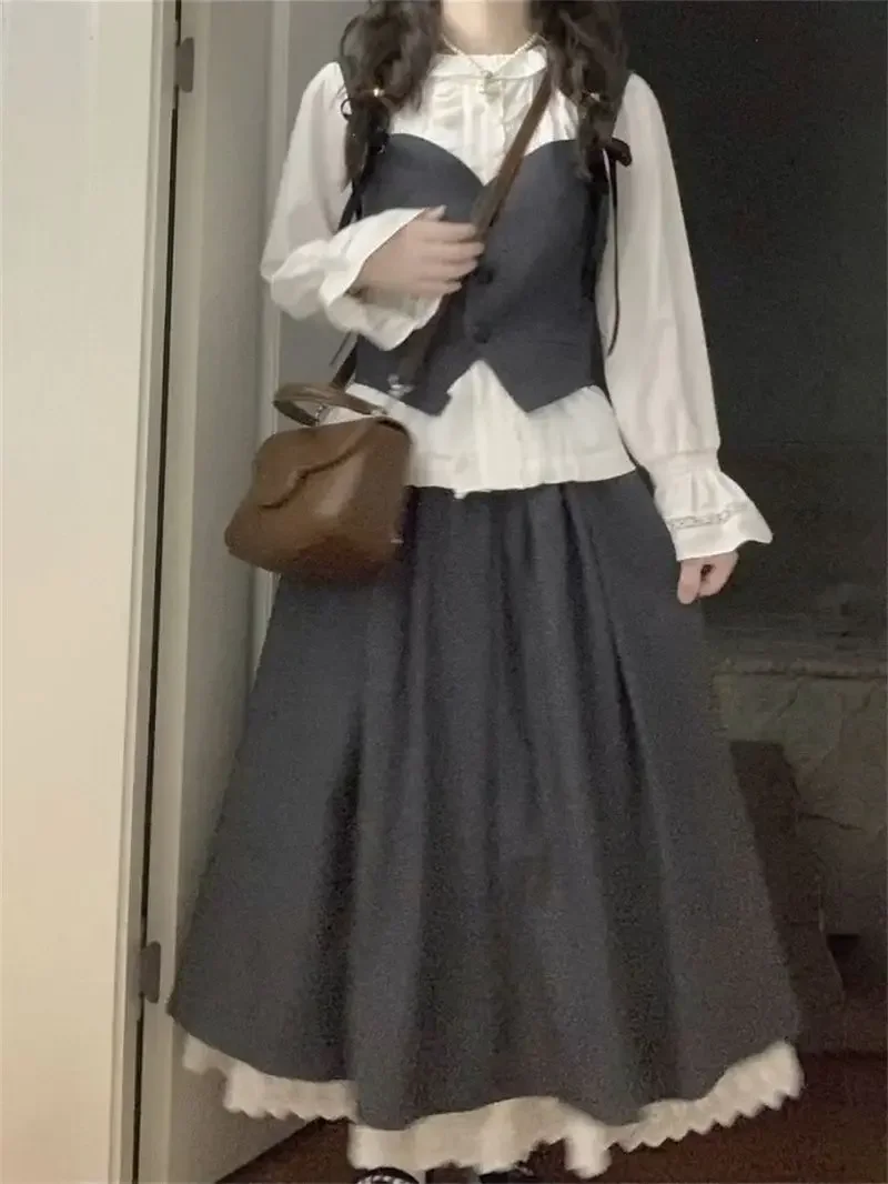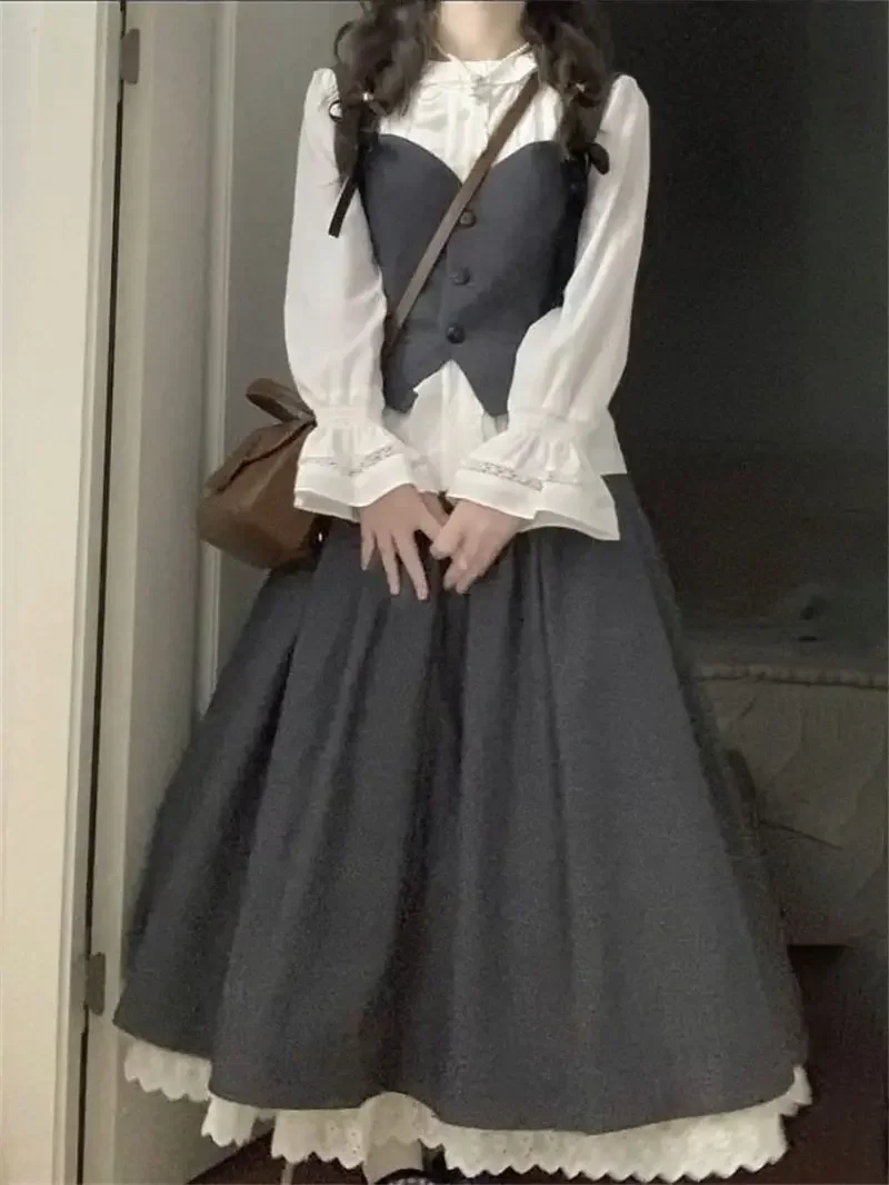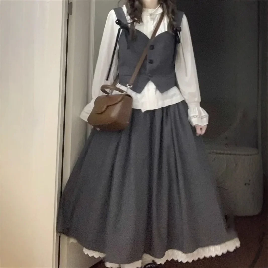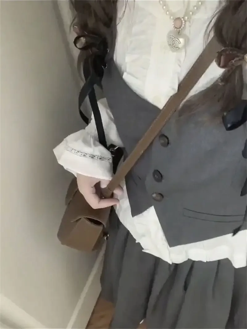 أوائل الخريف ثلاث قطع مجموعة اليابانية كلية نمط فراشة عقدة قصيرة محبوك صديرية دائرية المرأة قميص أبيض عالية الخصر تنورة صغيرة