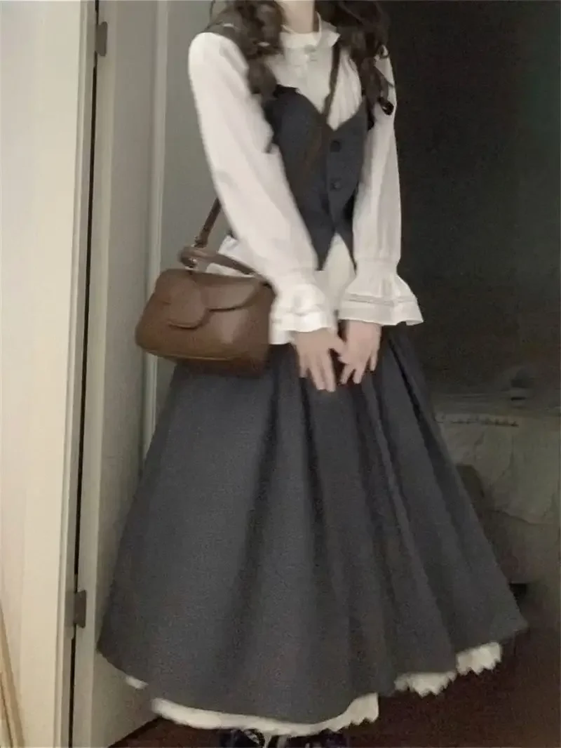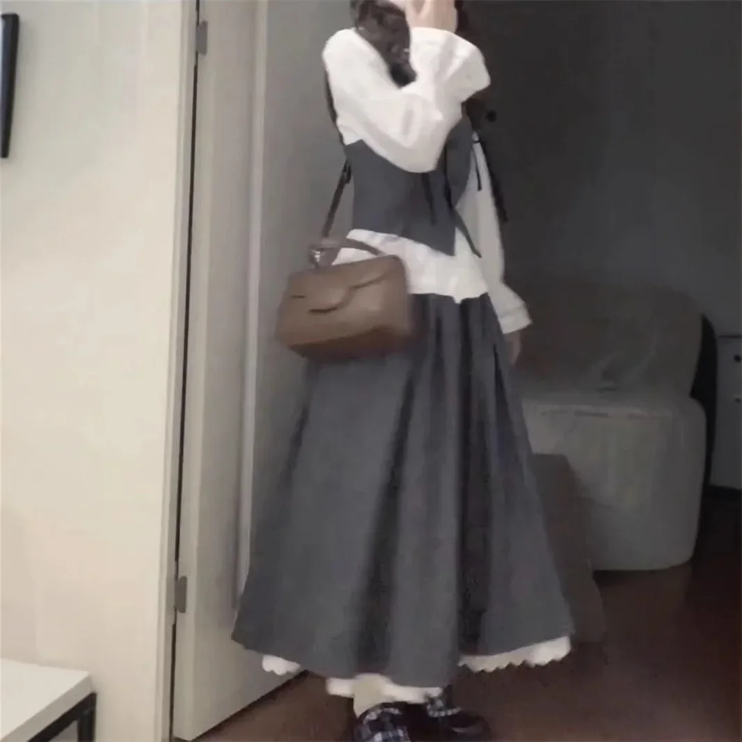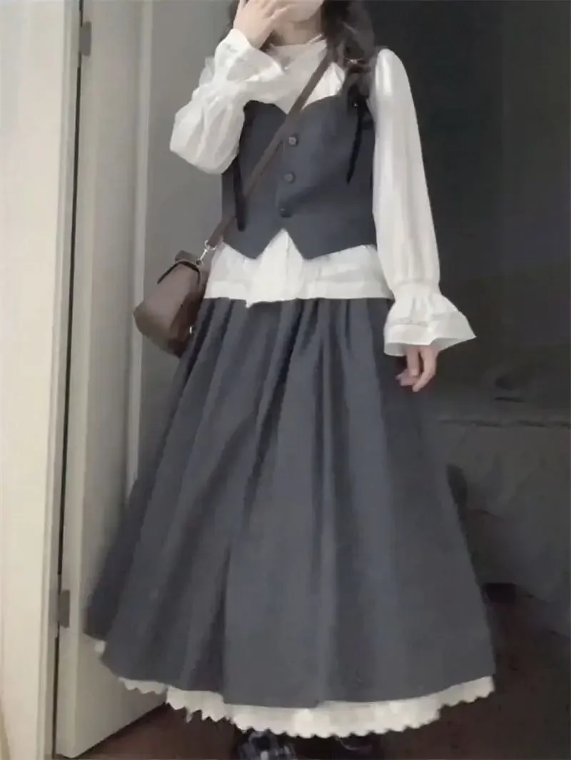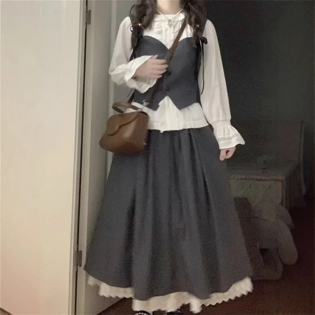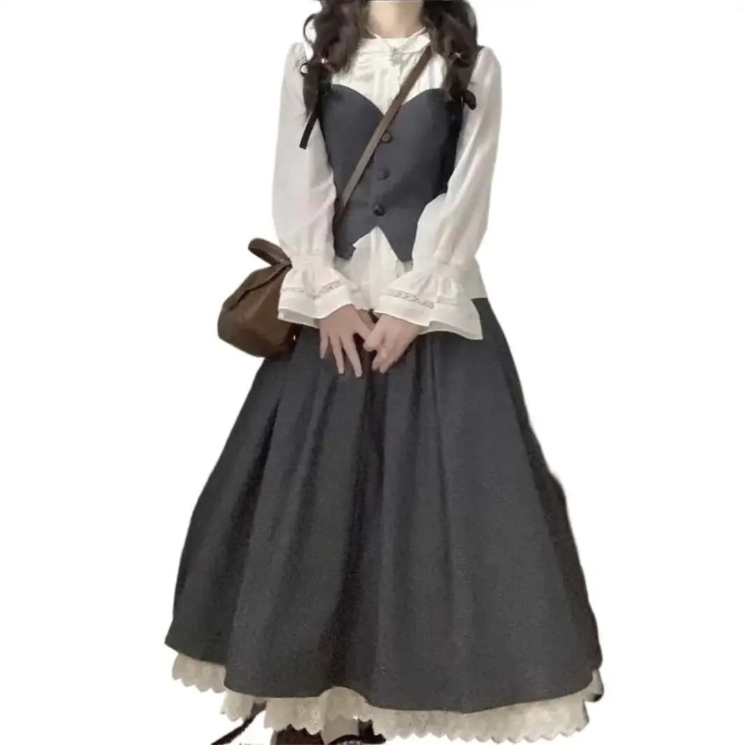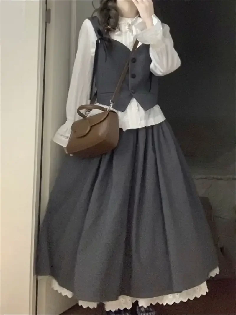 أوائل الخريف ثلاث قطع مجموعة اليابانية كلية نمط فراشة عقدة قصيرة محبوك صديرية دائرية المرأة قميص أبيض عالية الخصر تنورة صغيرة