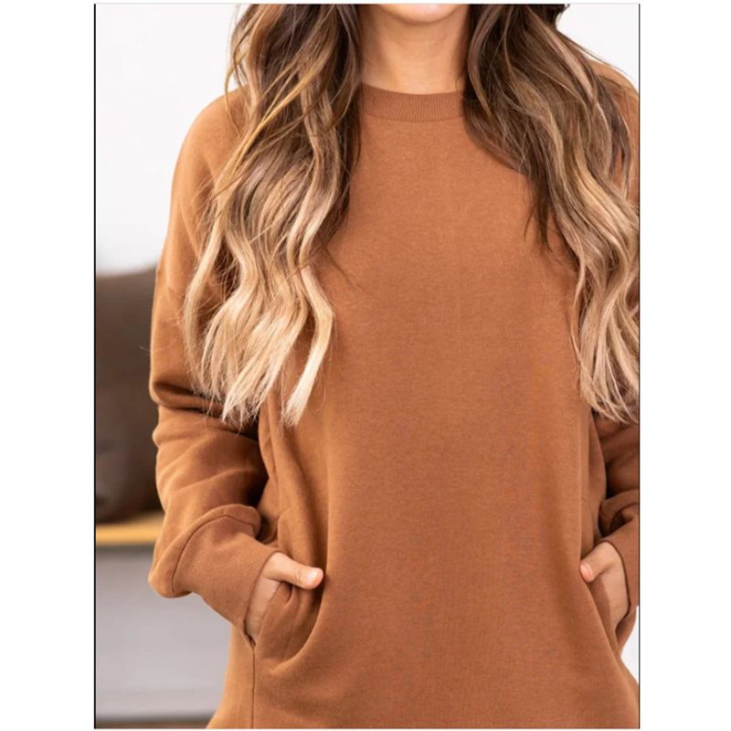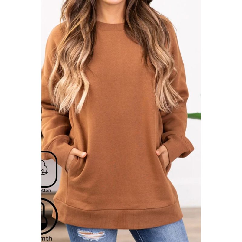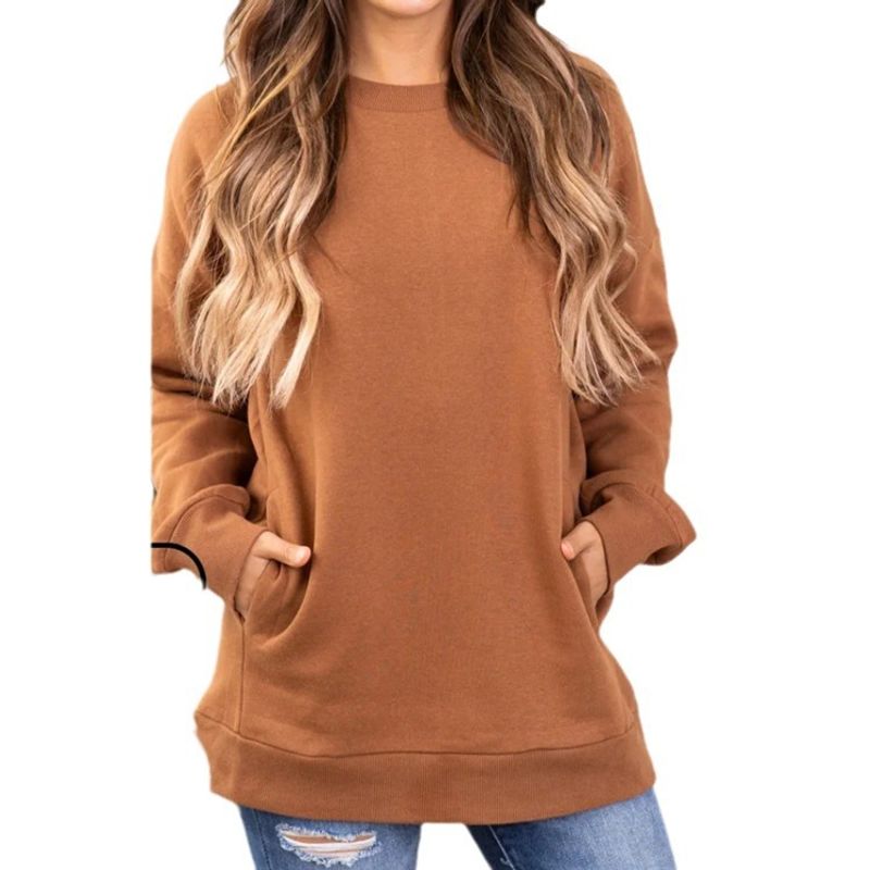 ملابس نسائية سويت شيرت نسائي بلون صلب عنق دائري Sleeves طويلة مع جيوب توب للنساء