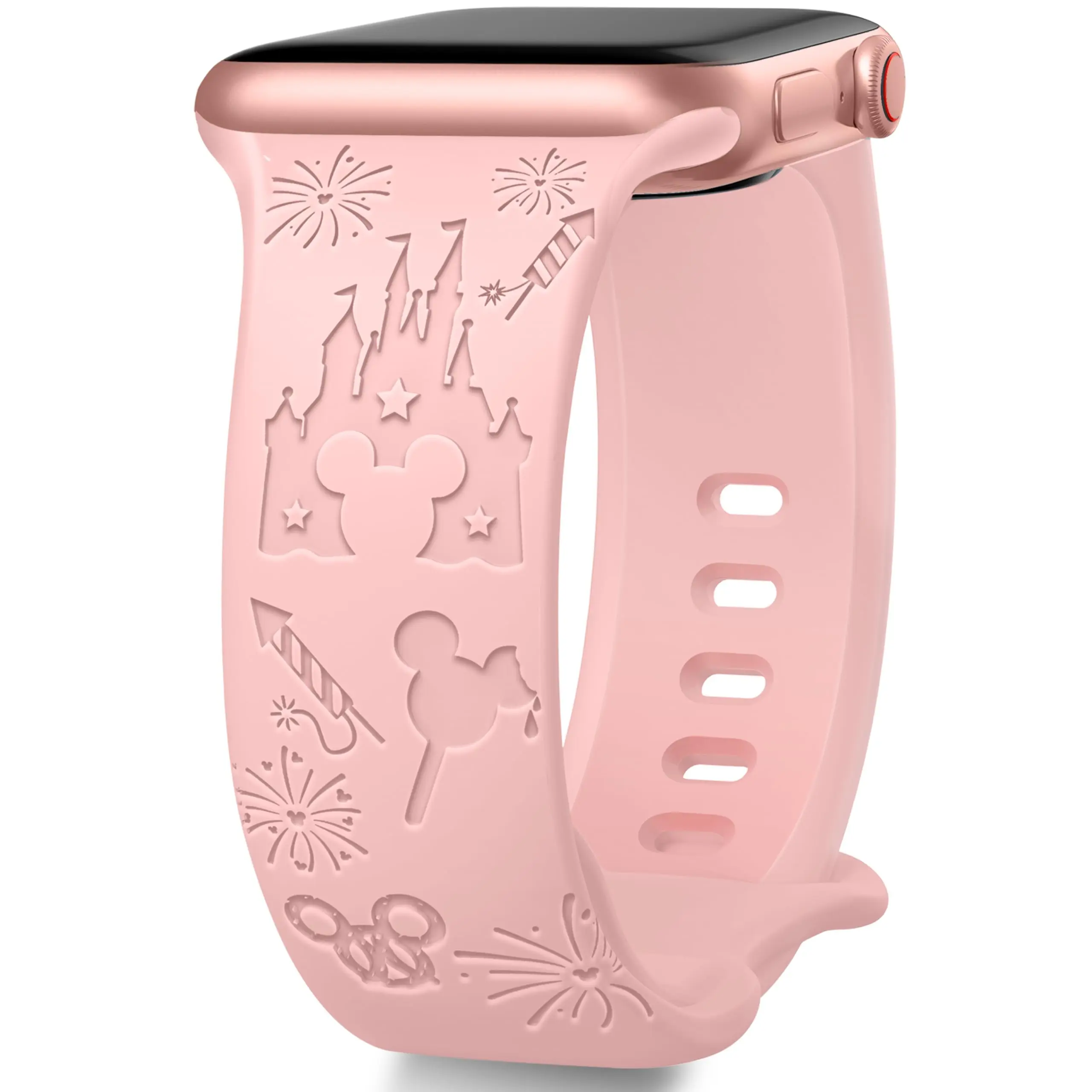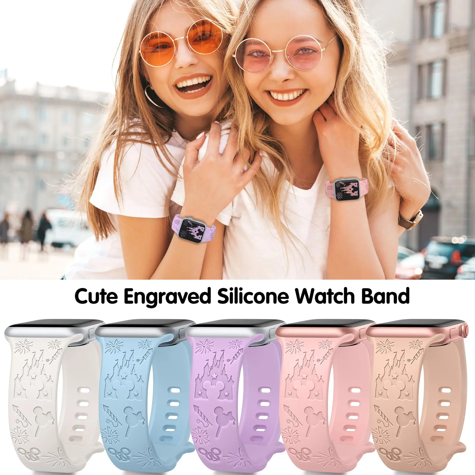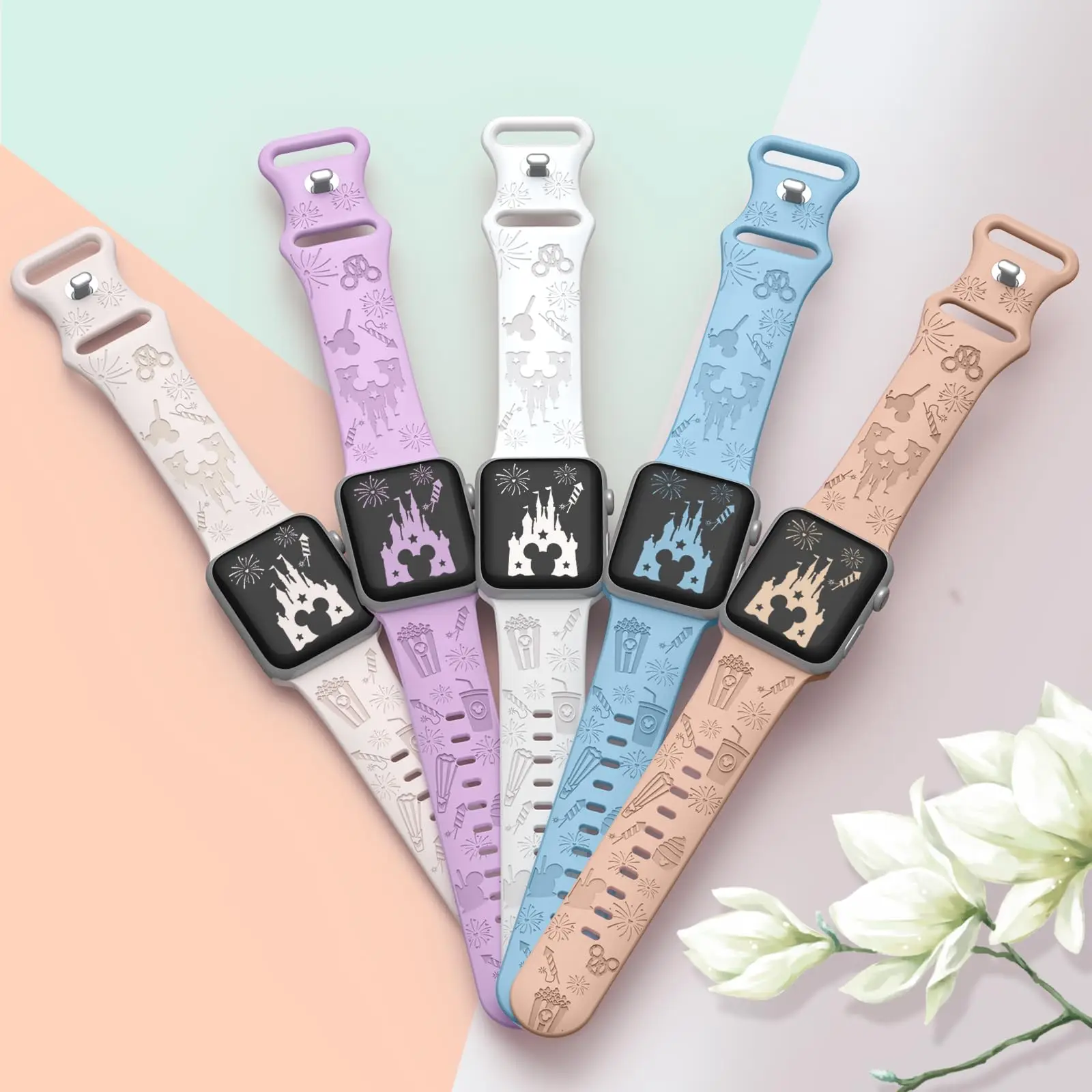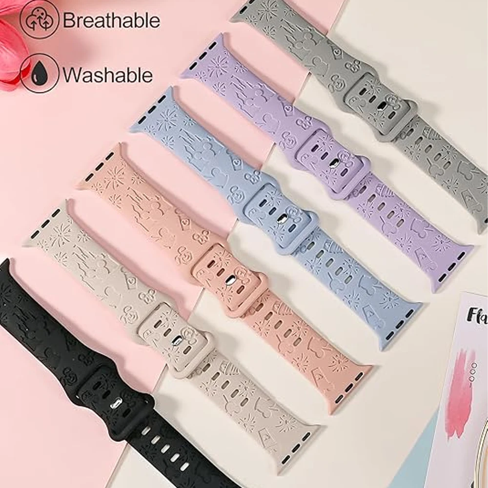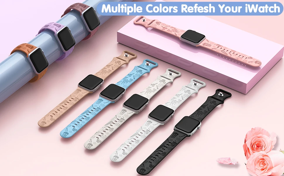 🎀【نمط كرتوني لطيف】تصميم جديد في عام 2024، تصميم منقوش، مظهر لطيف للغاية.تستخدم الأربطة النسائية الأنيقة من iWatch حرفة نحت بالليزر المتقدمة ويتم نقشها بقلاع فريدة ومخصصة وألعاب نارية وآيس كريم وأنماط قلب محببة وما إلى ذلك.