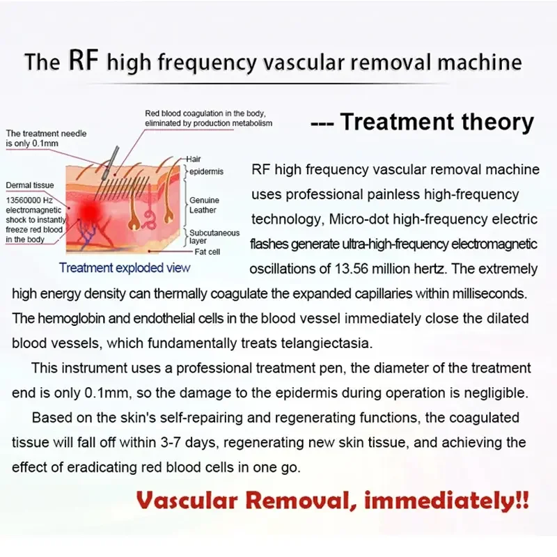 1.تستخدم آلة إزالة الأوعية الدموية عالية التردد تقنية احترافية عالية التردد غير مؤلمة، باستخدام فلاش كهربائي عالي التردد ذو نقطة صغيرة لتوليد 13.تذبذب كهرومغناطيسي عالي التردد بتردد 36 مليون هرتز، باستخدام سلك إبرة ناعم لتوجيه الطاقة المنطلقة أسفل سطح الجلد، عند كسر الهيموجلوبين في غضون 1000 ثانية، ينكسر الهيموجلوبين في الأوعية الدموية إلى جزيئات صغيرة ويمتصها أنسجة الجلد نفسها (الهيموجلوبين له وظيفة حمل الأكسجين، مما يجعل الشعيرات الدموية لدينا تظهر بالليمكن لكثافة الطاقة العالية للغاية للأداة أن تقوم بتخثر خلايا الهيموجلوبين والقصبة الهوائية على الفور في الشعيرات الدموية الموسعة، وبالتالي إغلاق الأوعية الدموية الموسعة على الفور وعلاج توسع الشعريات بشكل أساسي.بناءً على وظائف الإصلاح الذاتي والتجديد للبشرة، سوف يسقط الأنسجة المخروطية خلال 3-7 أيام، 4 أنسجة جلدية جديدة متجددة، لتحقيق تأثير القضاء مرة واحدة على عروق العنكبوت.