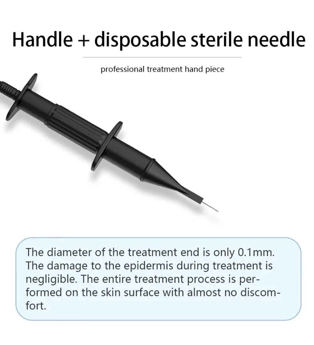 1.المقبض + إبرة معقمة يمكن التخلص منها: يبلغ قطر طرف العلاج 0.1 مم فقط، ويعتبر الضرر الذي يلحق بالبشرة أثناء العلاج أمرًا لا يستهان به.تتم عملية العلاج بأكملها على سطح الجلد دون أي إزعاج تقريبًا.