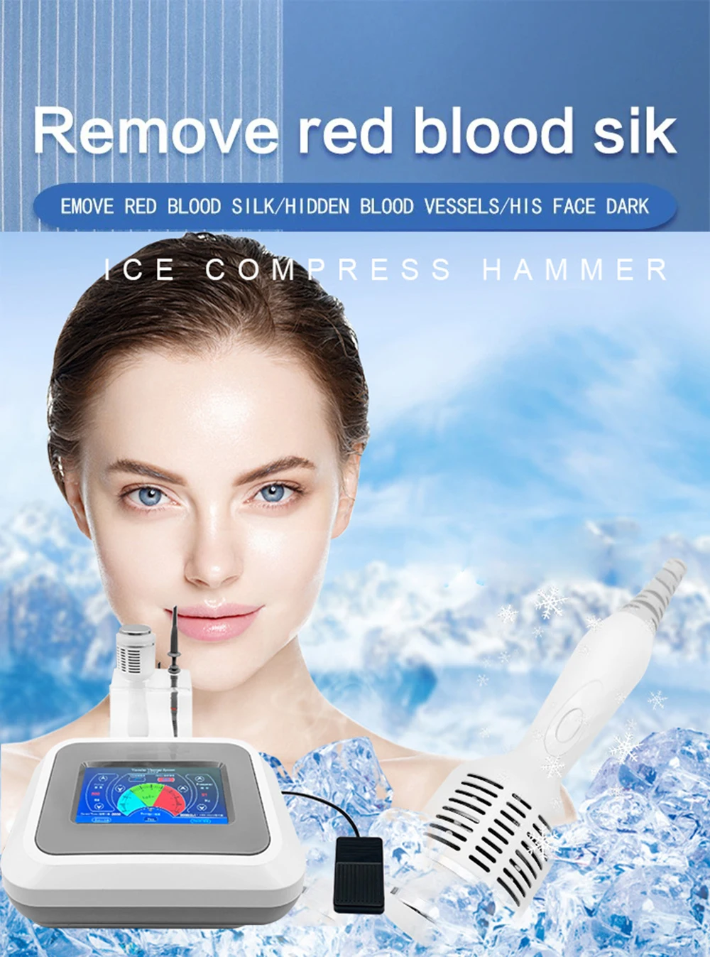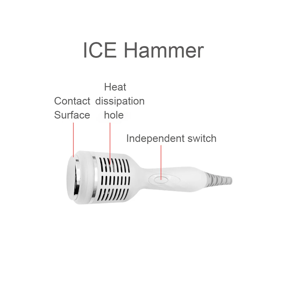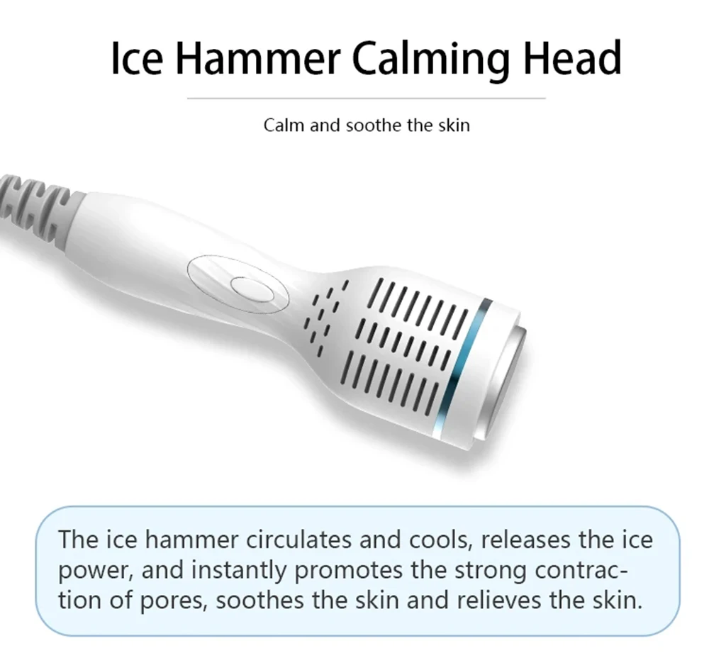 2.رأس مهدئ لمطرقة الثلج: تدور مطرقة الثلج وتبرد، وتطلق قوة الثلج، وتعزز على الفور الانكماش القوي للمسام، وتهدئ البشرة وتريح الجلد.