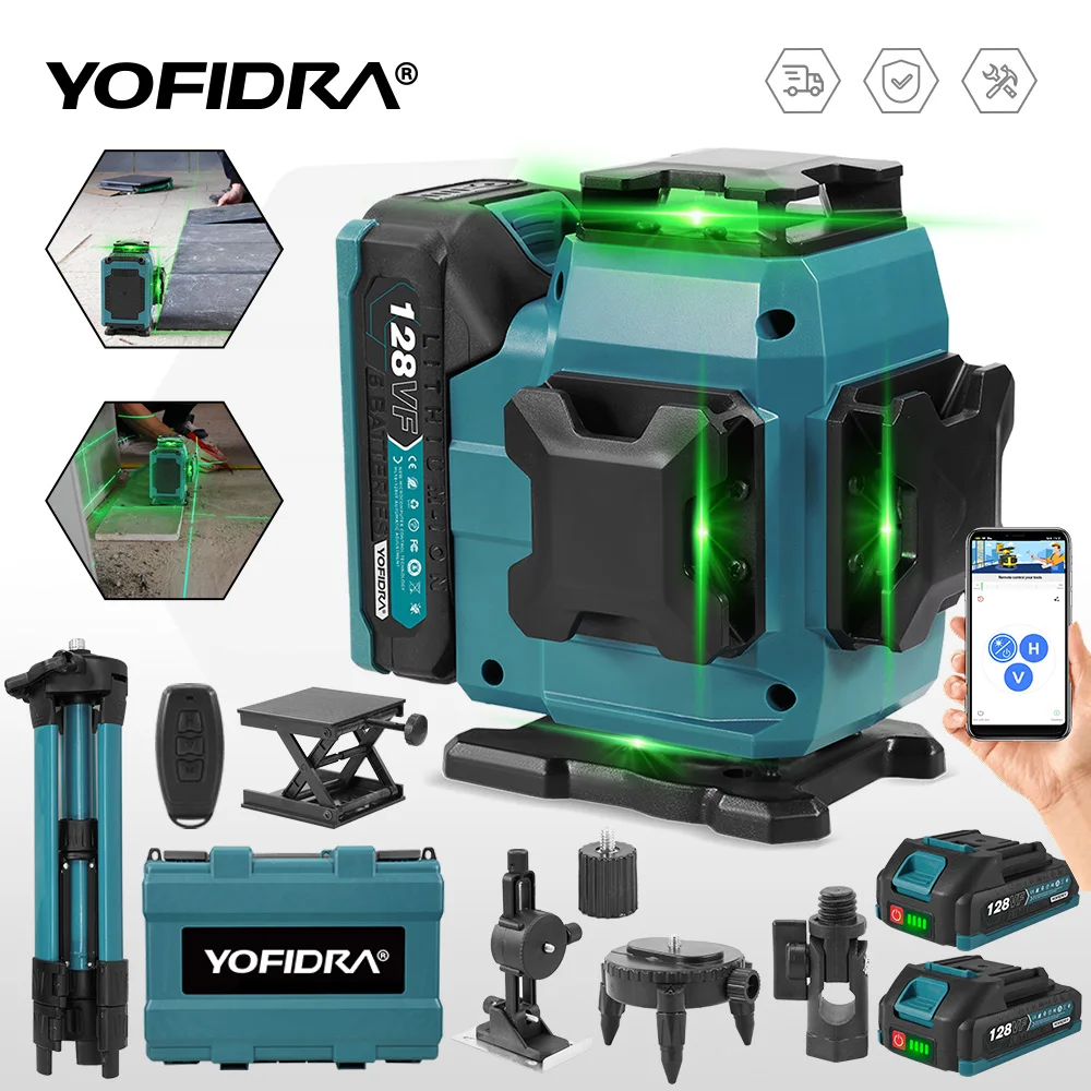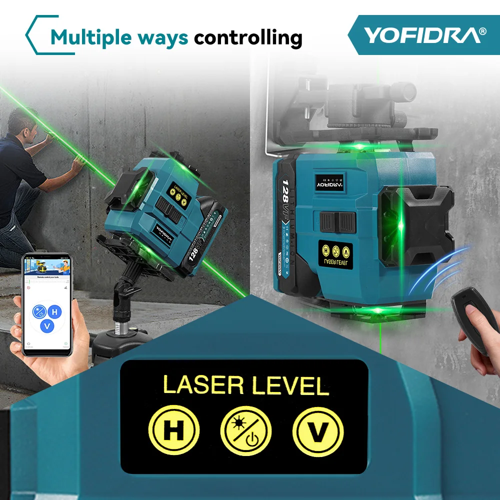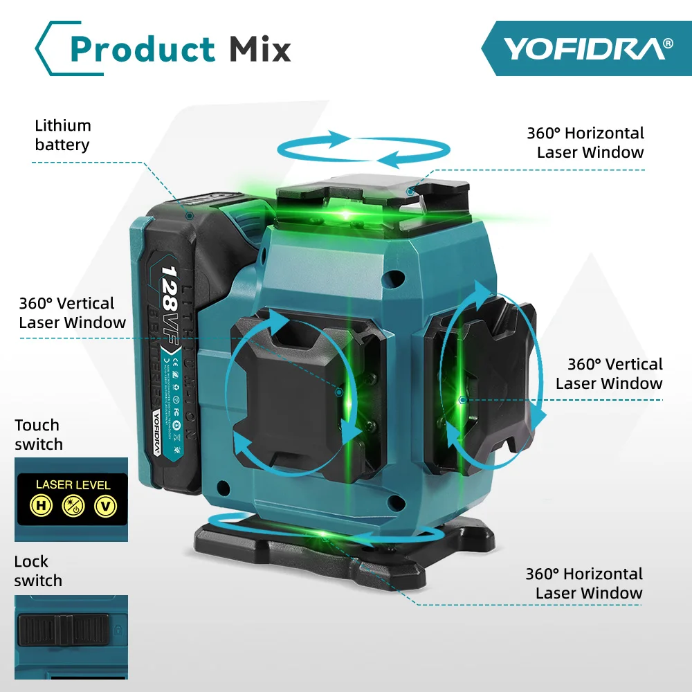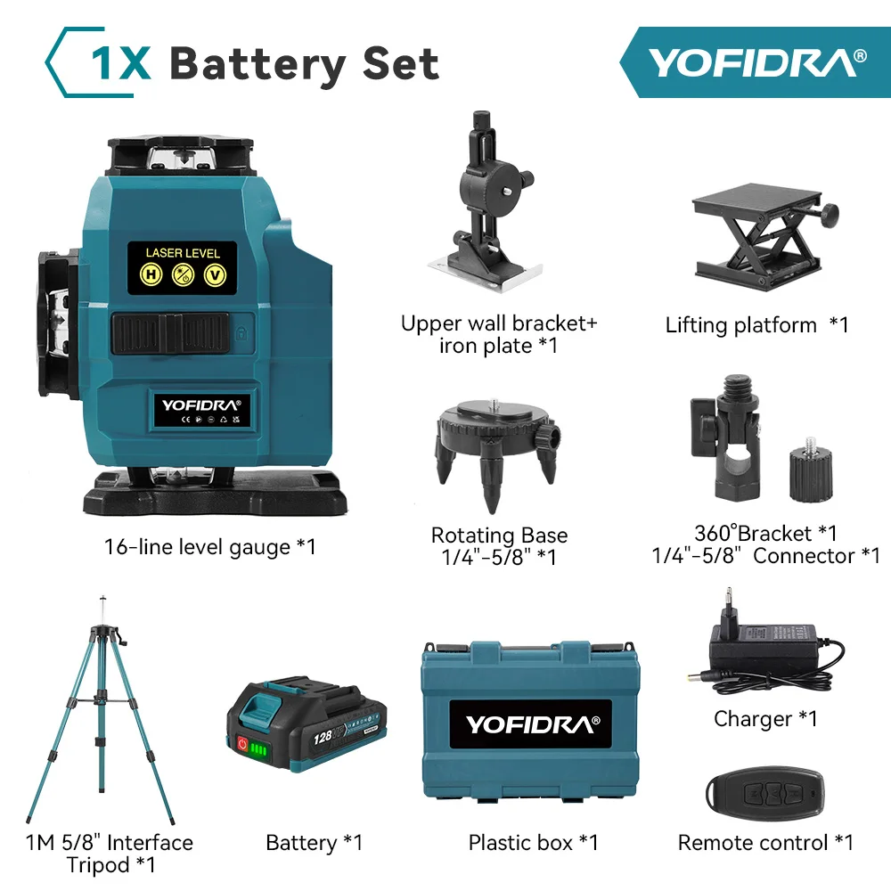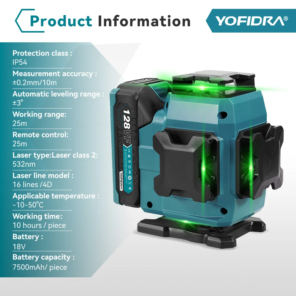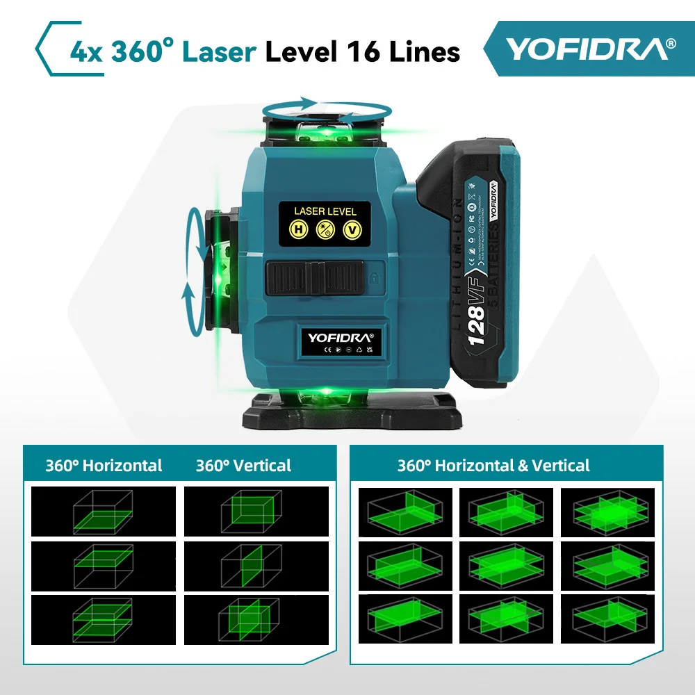 YOFIDRA 16 خطوط 4DLaser مستوى أوتوماتيكي 360 أفقي عمودي ذاتي التسوية قوة فائقة شعاع أخضر لدبوس بطارية ماكيتا 18 فولت