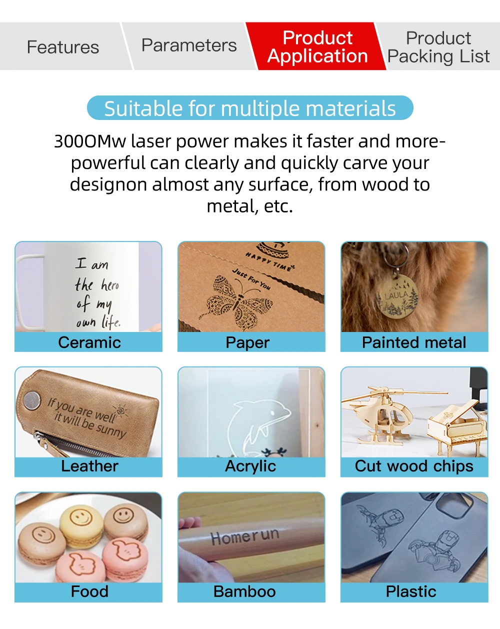 المواد القابلة للتطبيق: الخشب، الورق، البلاستيك، الجلد، الخيزران، ورق الكرافت، المعدن المطلي، إلخ.يمكن قطع الورق والخشب والجلود بقطر 0.2 مم.