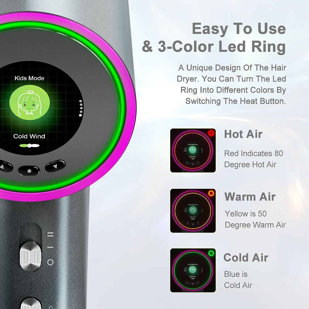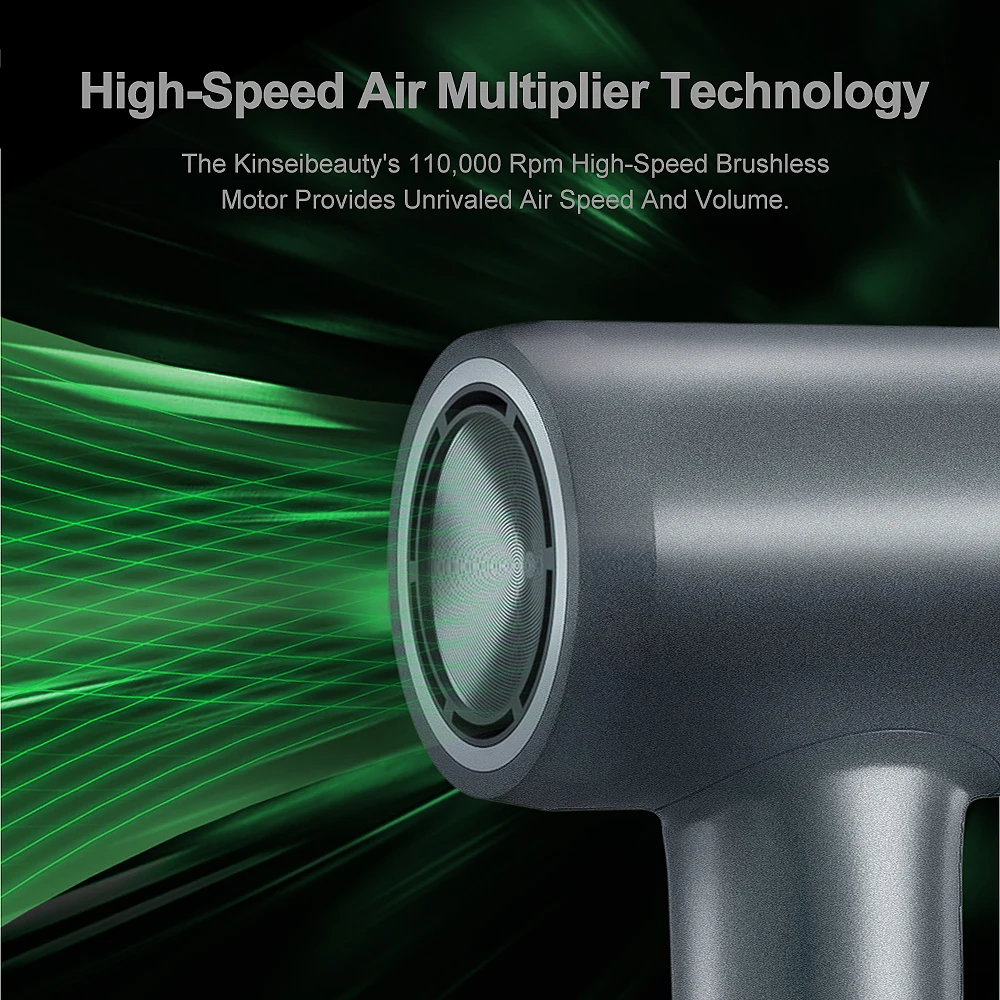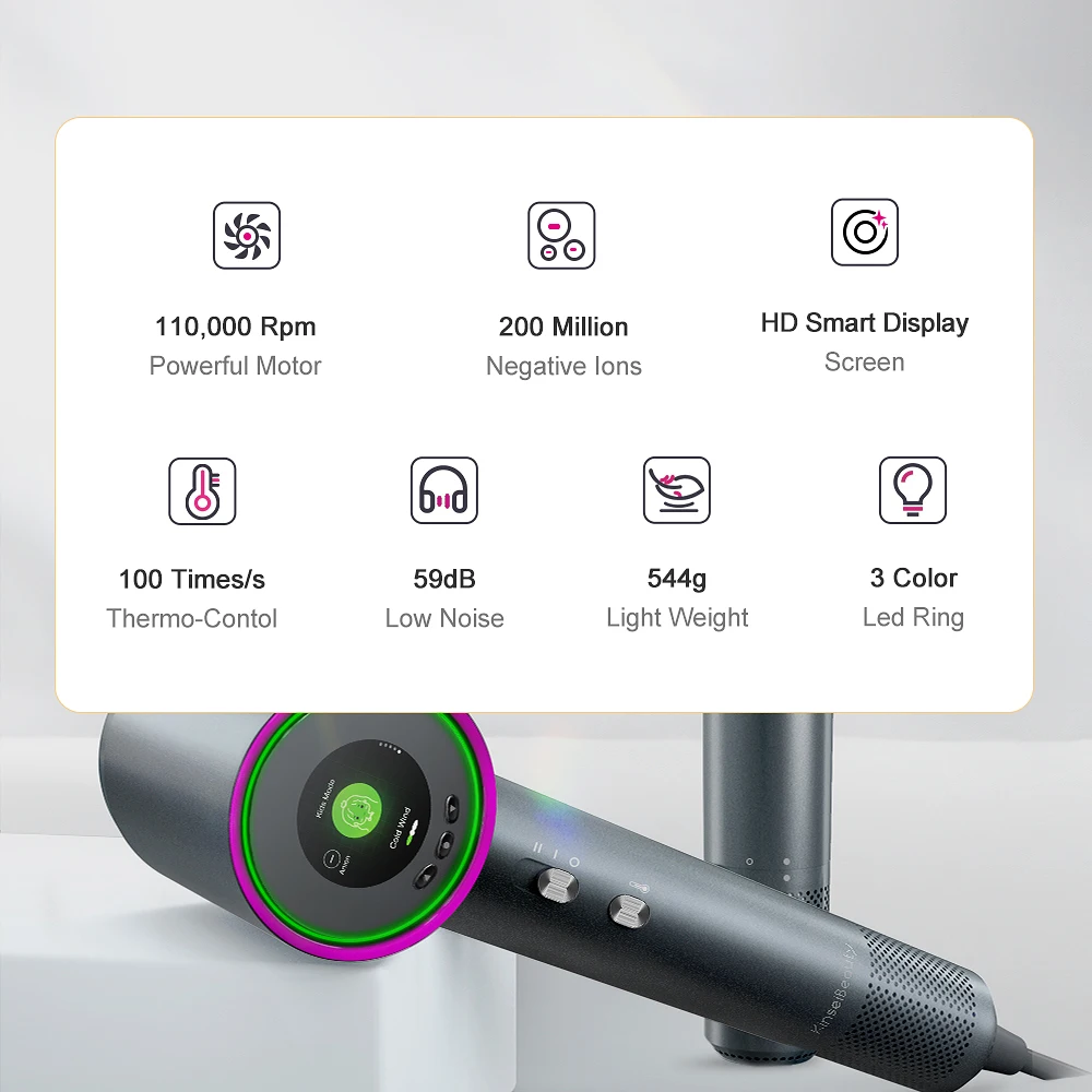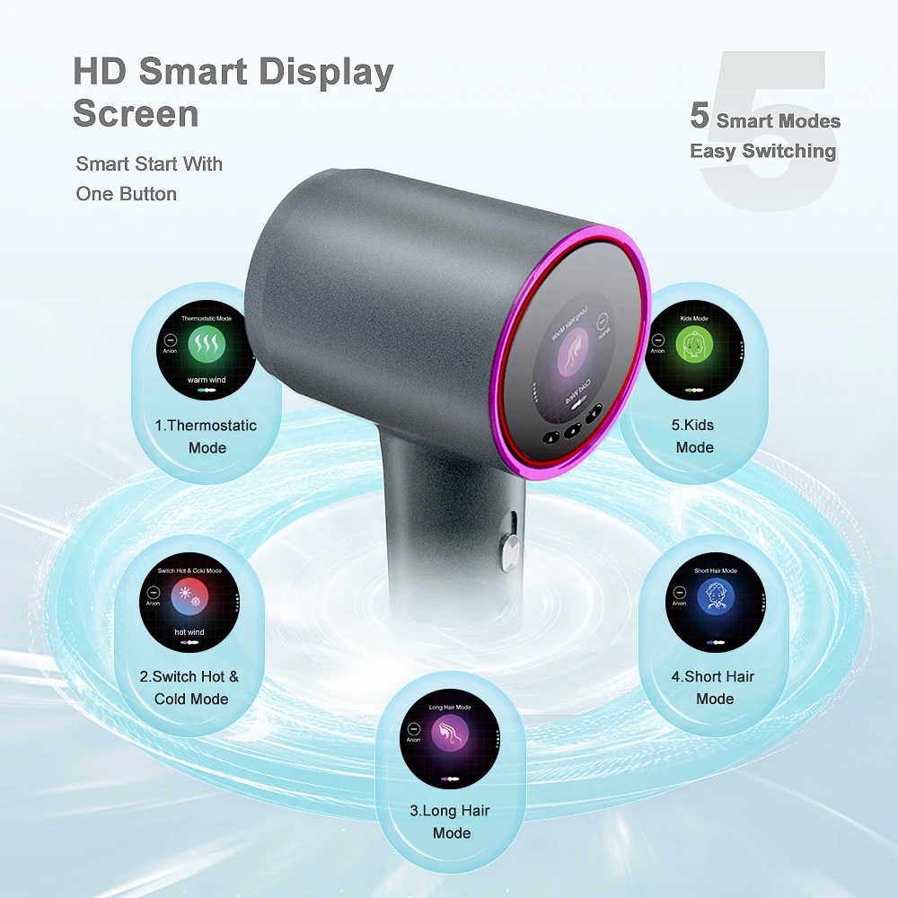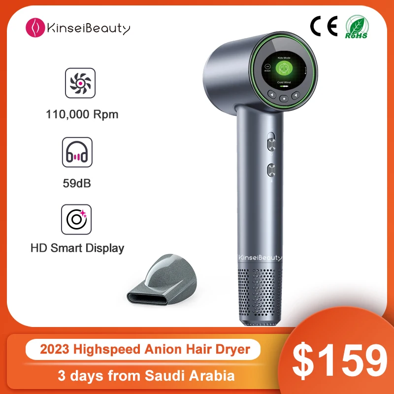 مجفف شعر عالي السرعة بدون أوراق ، العناية بالشعر بالأيون السالب ، سريع الجفاف ، 5 أوضاع ذكية ، شاشة HD ، حار وبارد ، 110000 دورة في الدقيقة