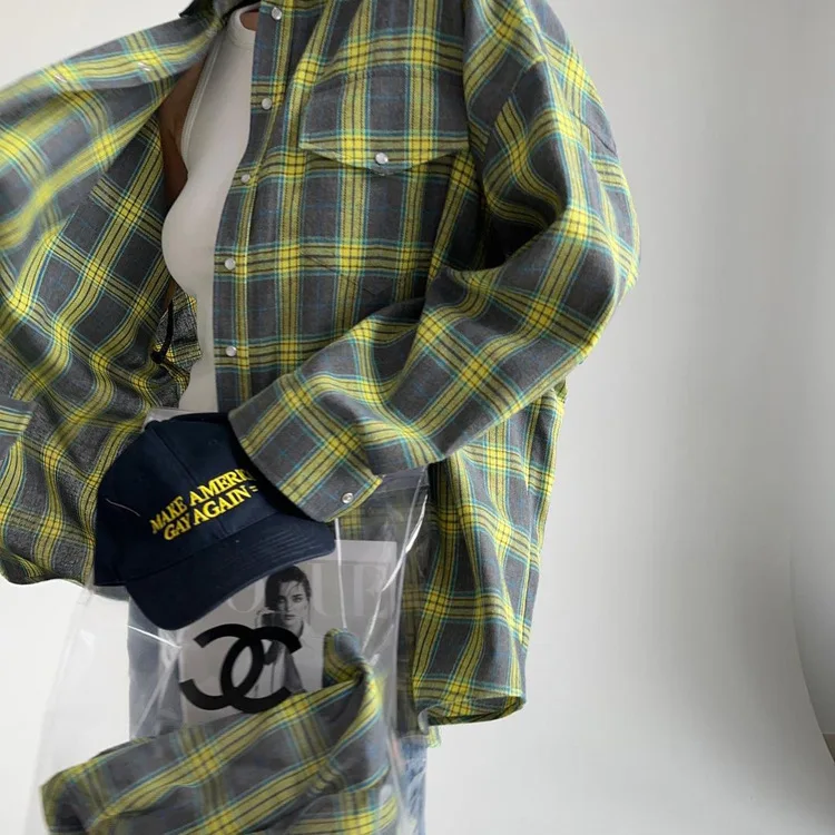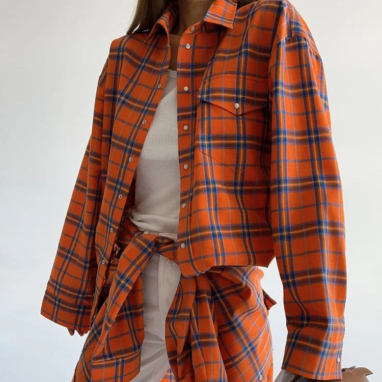 قميص نسائي مطبوع منقوش بأزرار فضفاضة بصدر واحد ، ياقة مطوية لأسفل ، كم كامل ، بلوزة غير رسمية ، قمصان أنيقة ، قمصان خريفية
