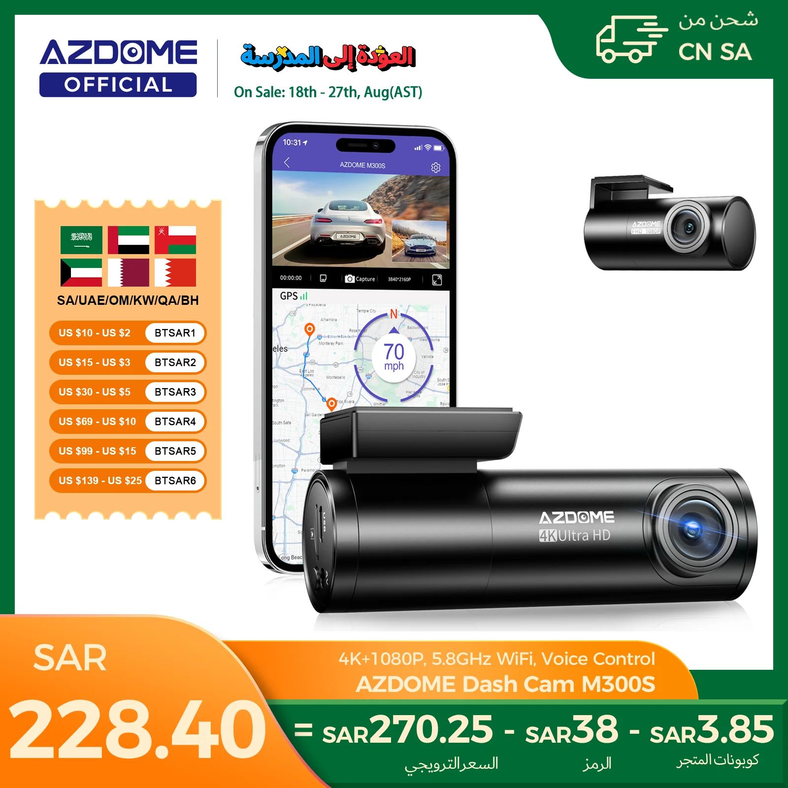 كاميرا داش AZDOME M300S 4K أمامية وخلفية، كاميرا داش WiFi GPS 5.8G للسيارات، بطاقة SD سعة 64 جيجابايت مجانية، تحكم صوتي، رؤية ليلية WDR