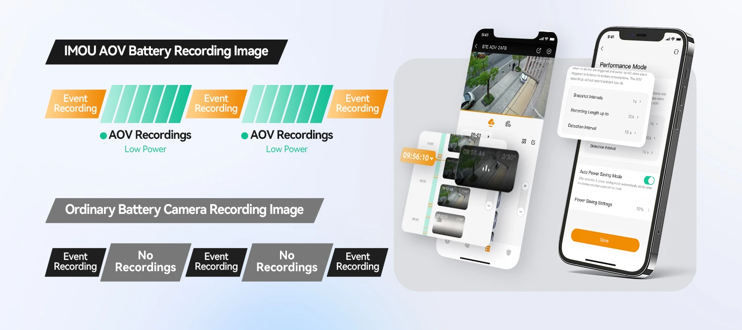 يستخدم AOV PT تقنية الفيديو الدائم التشغيل (AOV) الرائدة في الصناعة من IMOU، والتي تسمح للكاميرا بتسجيل إطار واحد كل ثانيتين للحفاظ على الذاكرة والطاقة في حالة عدم وجود حدث، ولكن يتحول على الفور إلى تسجيل كامل الإطار عند حدوث حدث، مما يلبي احتياجات التسجيل طوال اليوم وتوفير الطاقة.