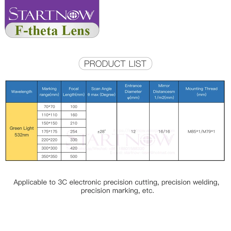 Startnow F-theta عدسة مسح 532 نانومتر ضوء أخضر ليزر آلة وسم نظام غالفو M85 موضوع مسح المجال 70x70 مللي متر عدسة مسح بصري