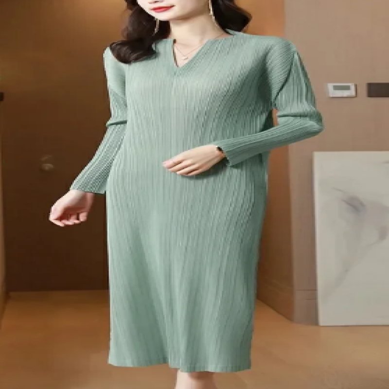 فستان مياكي (مناسب للجميع المقاسات) ذو ثنيات بلون سادة لصيف 2025 فساتين جديدة كبيرة الحجم غير رسمية فضفاضة ومريحة ورقبة على شكل حرف v متوسطة الطول
