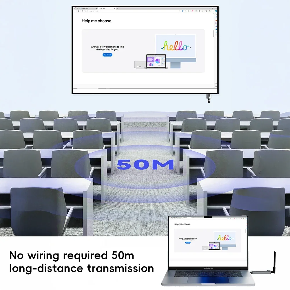 لا يلزم الأسلاك.يمكن إرساله على مسافة 50 مترًا وهو مناسب لغرف المؤتمرات الكبيرة.