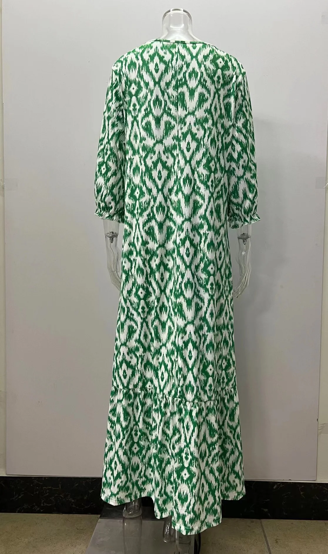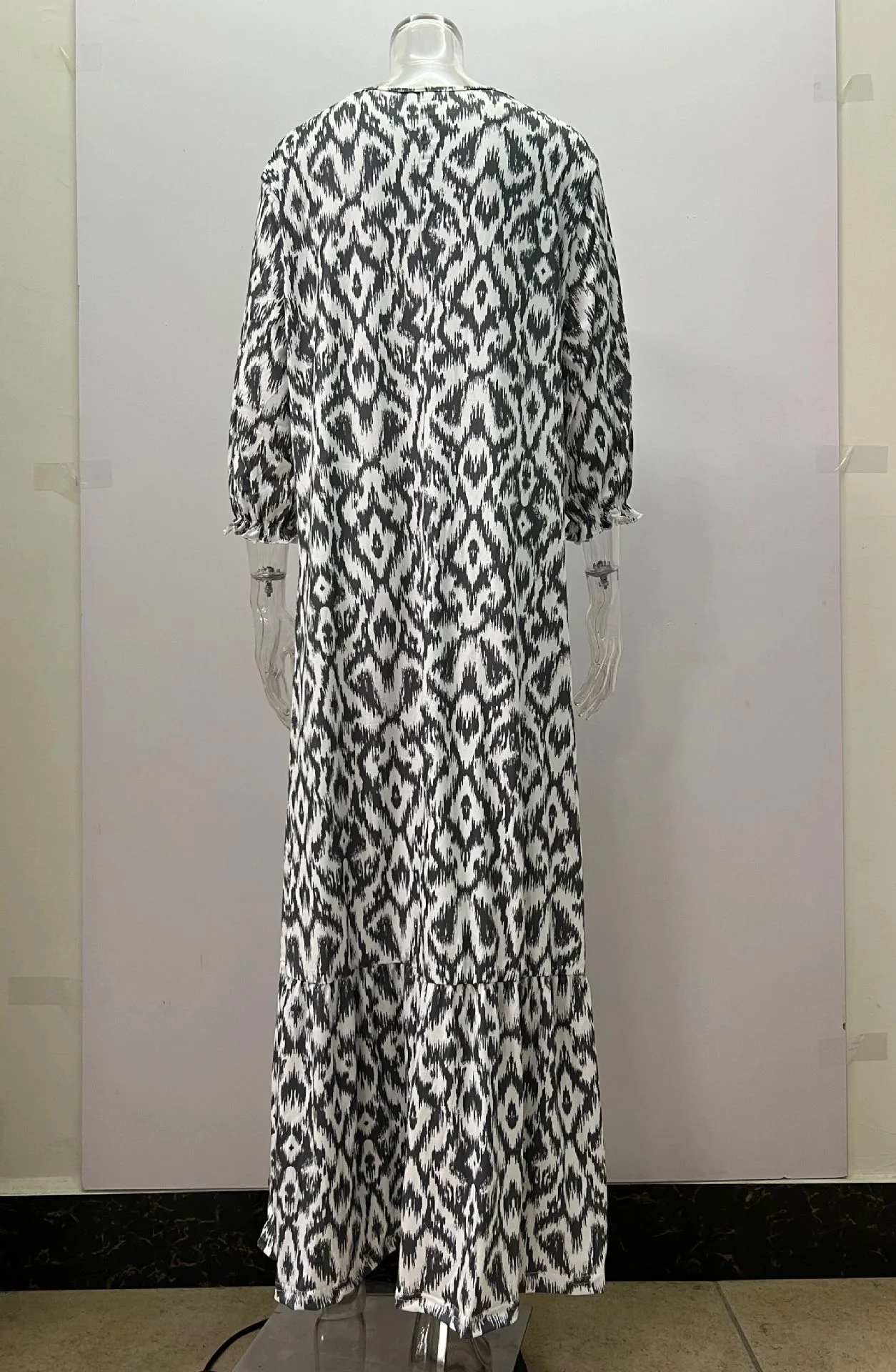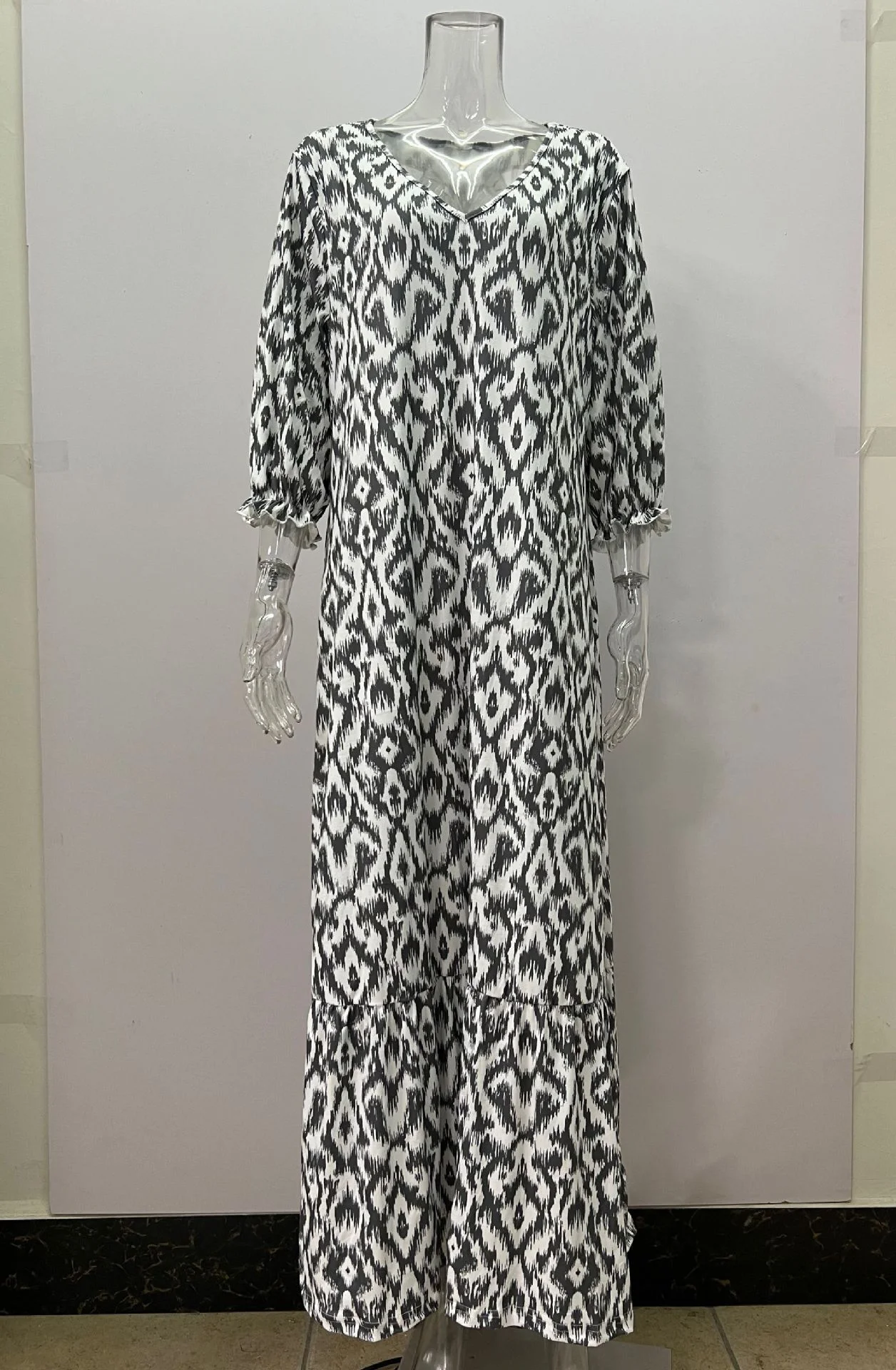 فستان طويل فضفاض برقبة V مطبوع بأكمام متوسطة ، موضة اوربية وأطباق ، عبر الحدود ، الخريف والشتاء ،