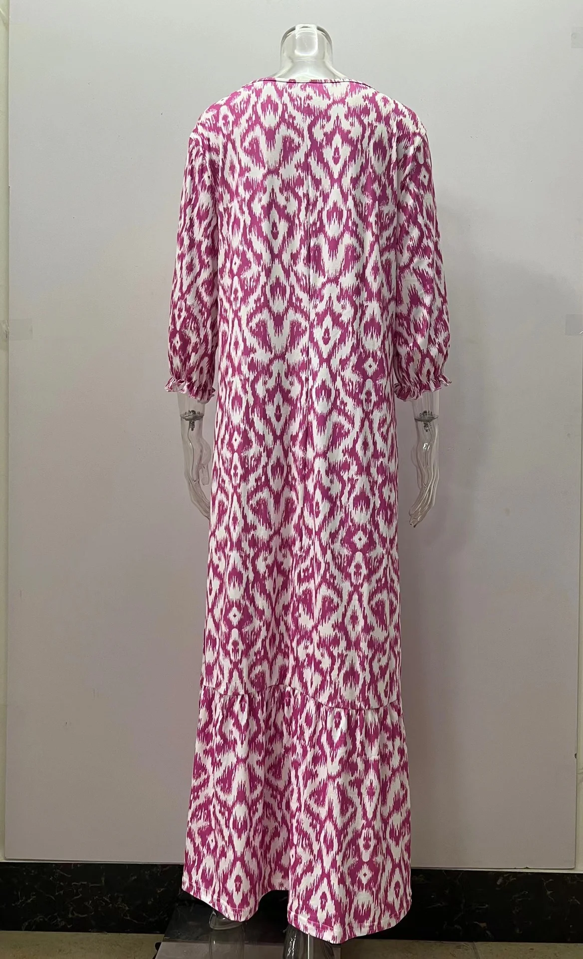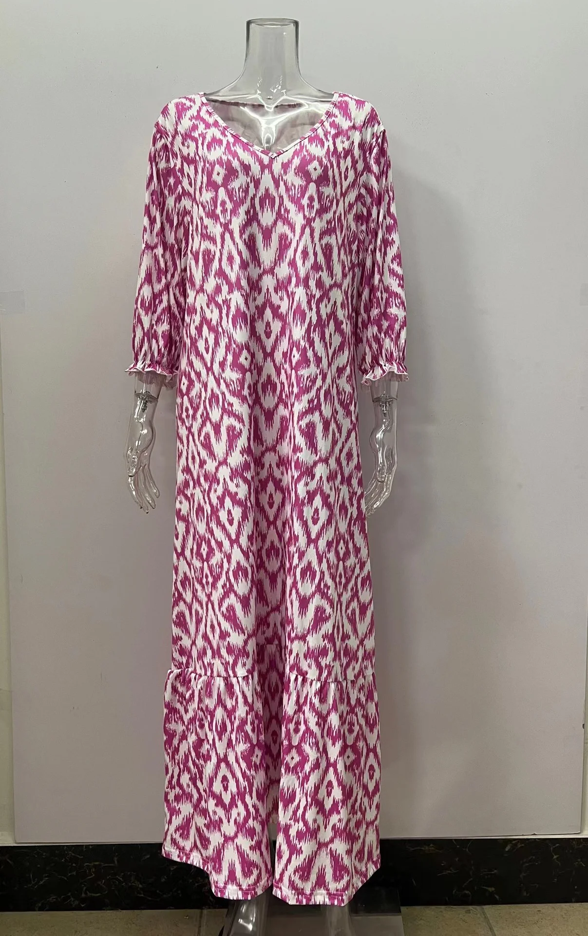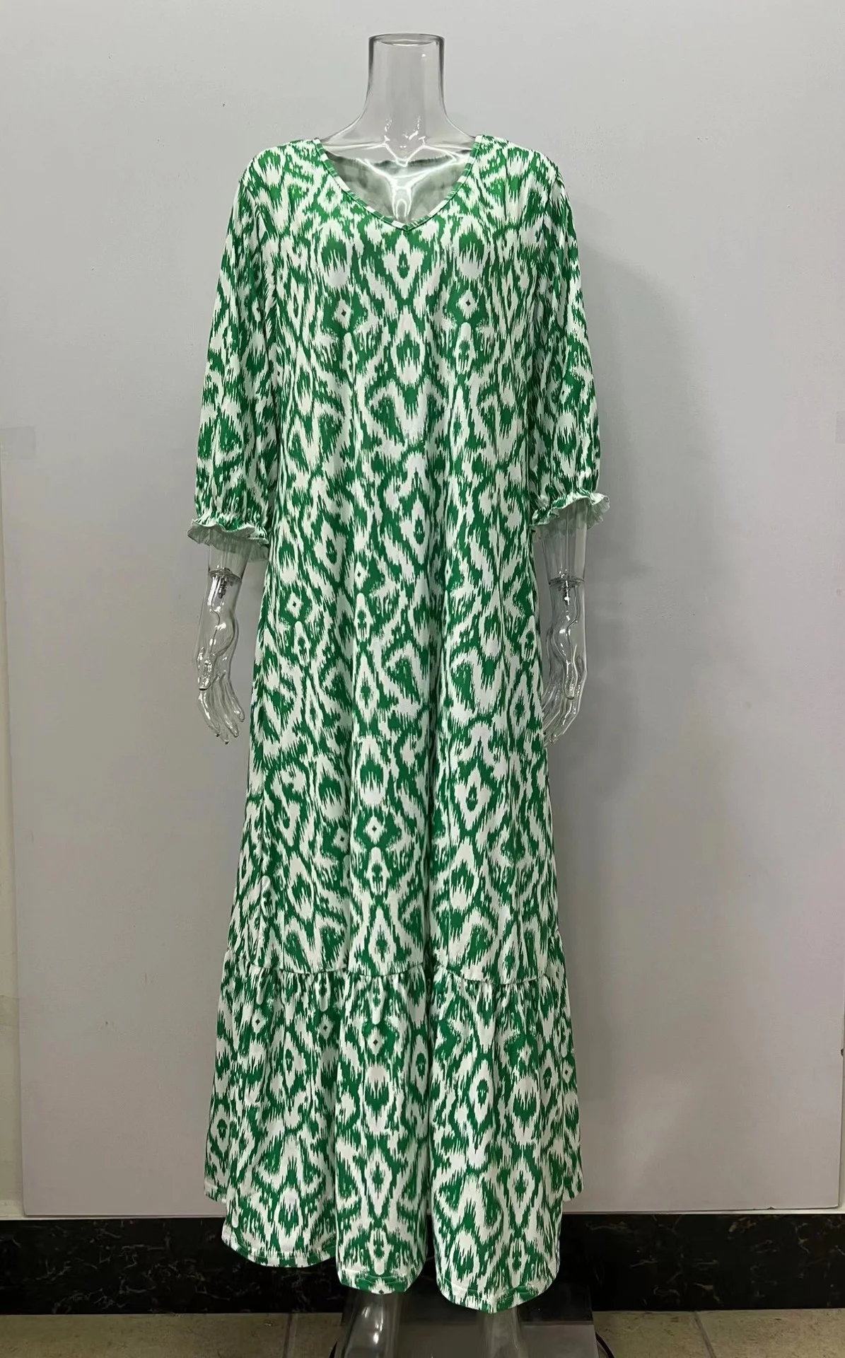 فستان طويل فضفاض برقبة V مطبوع بأكمام متوسطة ، موضة اوربية وأطباق ، عبر الحدود ، الخريف والشتاء ،