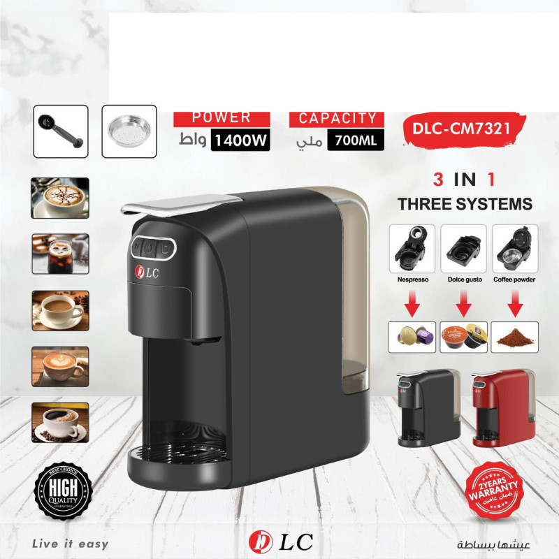 استمتع بتجربة قهوة احترافية في منزلك مع ماكينة القهوة DLC-CM7321 التي تجمع 3 أنظمة تحضير مختلفة في جهاز واحد. صممت لتناسب جميع الأذواق، سواء كنت تفضل كبسولات نسبريسو أو دولتشي غوستو أو القهوة المطحونة.