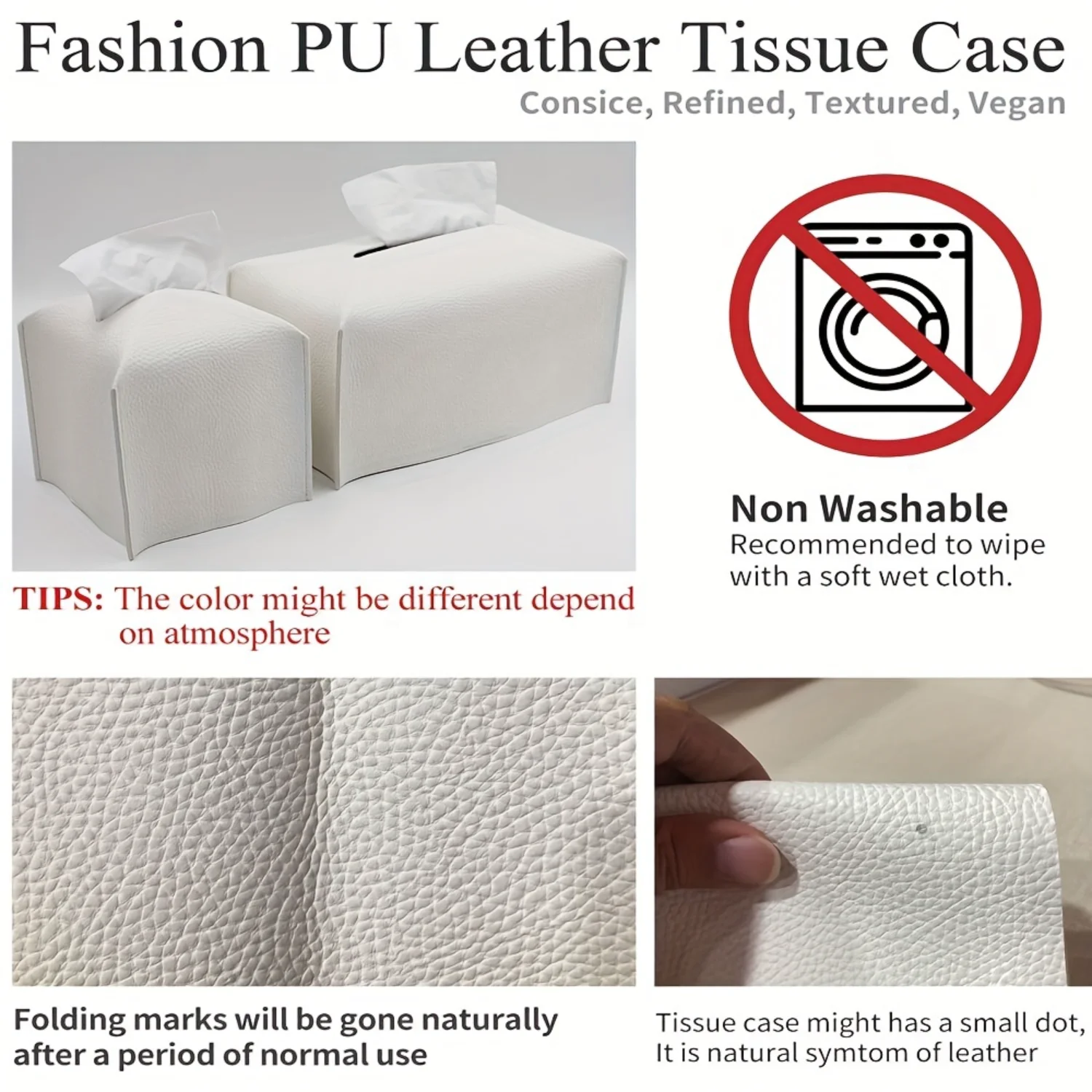 1.أضف لمسة من الأناقة إلى أي غرفة مع غطاء علبة المناديل البسيط هذا.مصنوع من جلد البولي يوريثان العصري المكرر، حامل المناديل المربع هذا هو الإكسسوار الزخرفي المثالي لزي الحمام أو سطح الطاولة أو الحوامل الليلية أو المكتب أو السيارة.مقاس 5 × 5 × 5 بوصة.