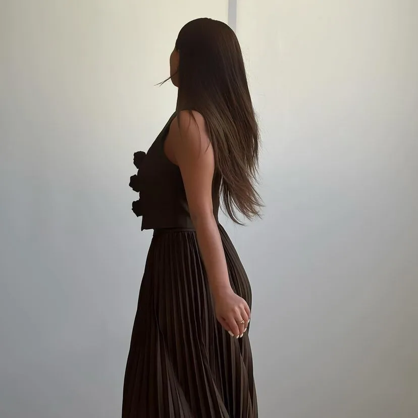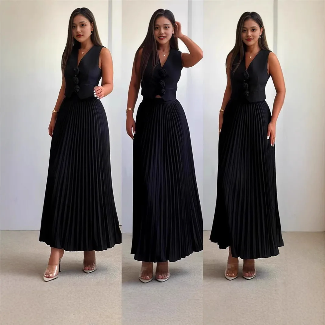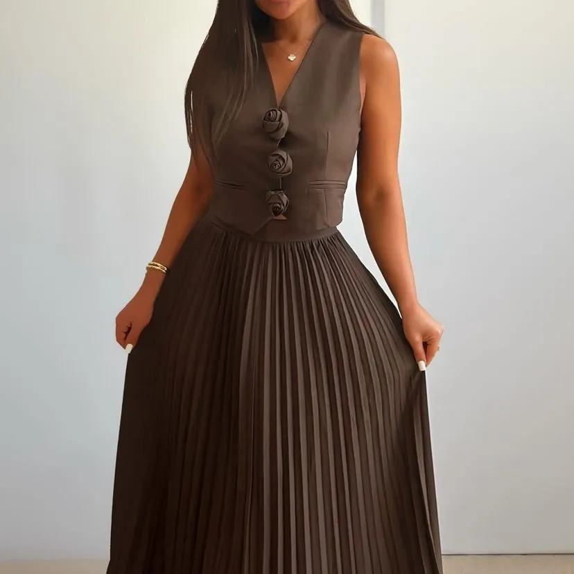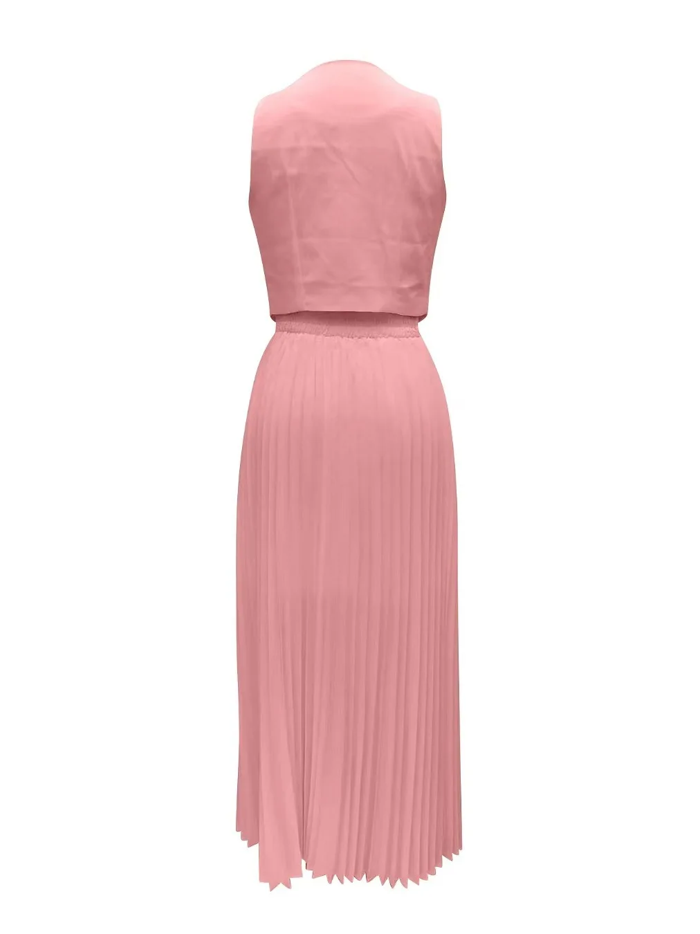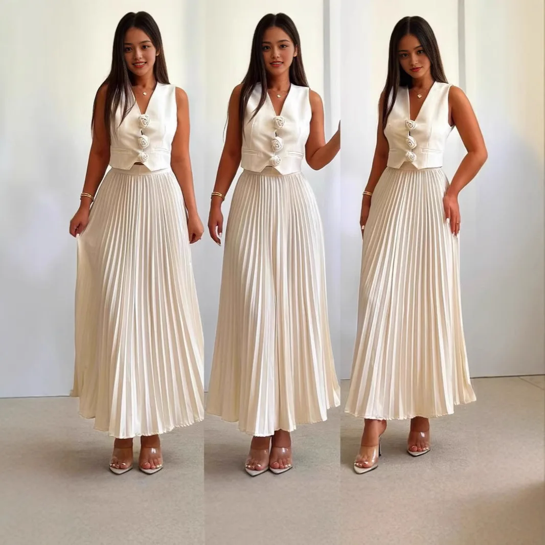طقم ملابس كاجوال للنساء مكون من قطعتين بدون أكمام وأزرار علوية بدون أكمام بلون سادة وتنورة طويلة بطيات