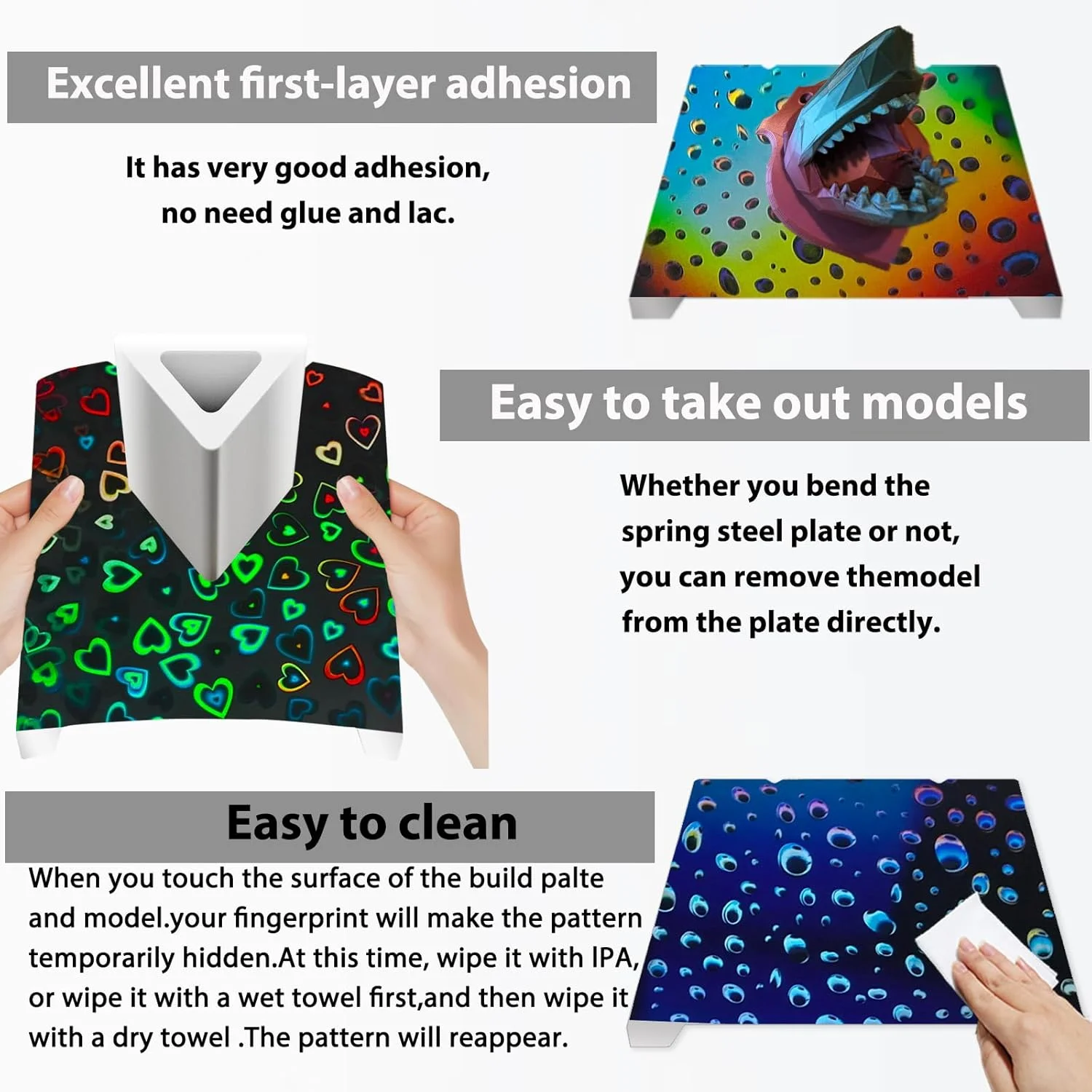 【إزالة سهلة】اللوحة الفولاذية الزنبركية مرنة.عندما تصل درجة حرارة السرير الساخن إلى درجة حرارة الغرفة، تنفصل المطبوعات عن السطح بسهولة.إذا كانت الطباعة لا تزال عالقة، فما عليك سوى ثني لوحة البناء قليلاً لإزالة النموذج.وسوف تعود اللوحة إلى التسطيح.