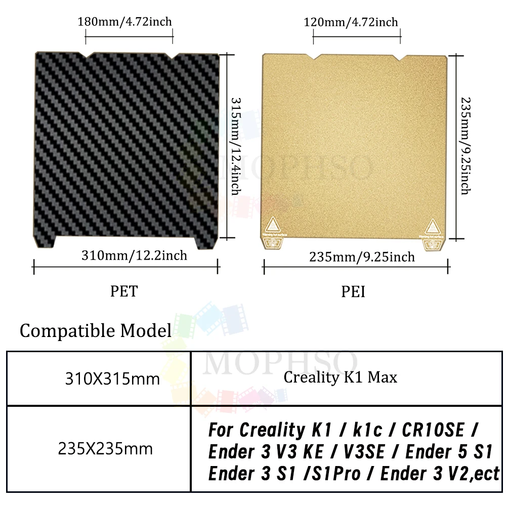 ينطبق على Creality K1 /k1c/أقل من 3 V3 KE/أقل من 3 V3SE/Cr10SE/أقل من 3 S1/أقل من 3 S1 pro/أقل من 3/أقل من 3 Pro/أقل من 3 V2/أقل من 3 نيو/أقل من 3 v2 نيو/أقل من 5/أقل من 5 برو/أقل من 5 S1/Voxelab Aquilaetc وأي طابعة FDM ثلاثية الأبعاد بحجم سرير حراري 235 × 235