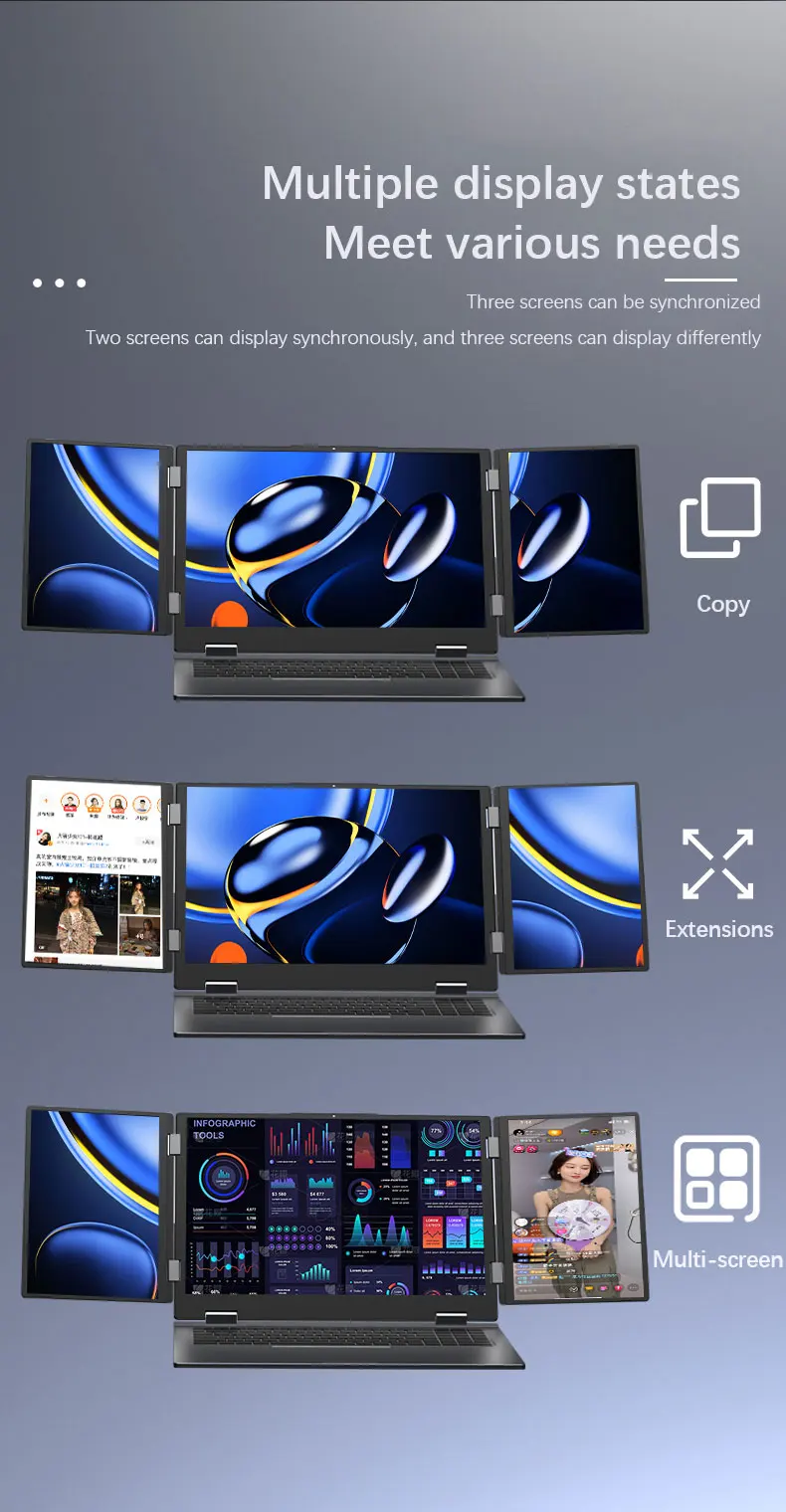 يتم إجراء ثلاث شاشات بشاشات مختلفة، والعمل المكتبي الفعال، وتجارة المخزون، والتصميم، والتحرير والترفيه في وقت واحد، ويتم تحسين كفاءة العمل بسرعة