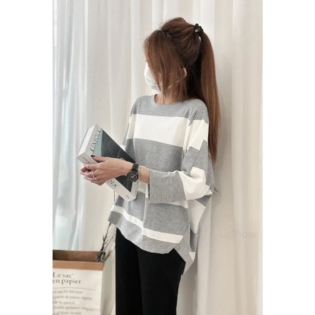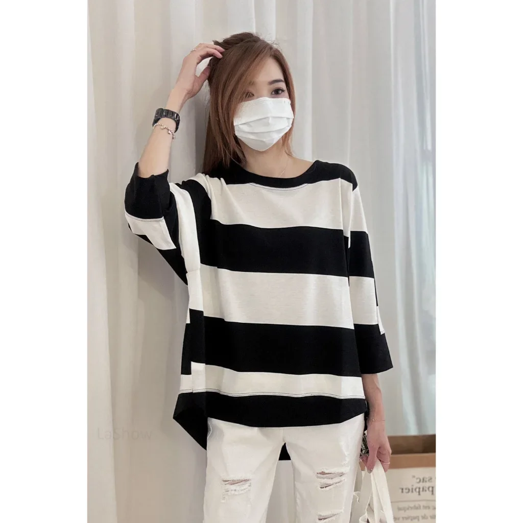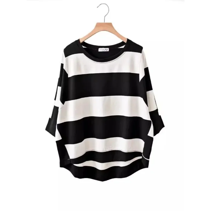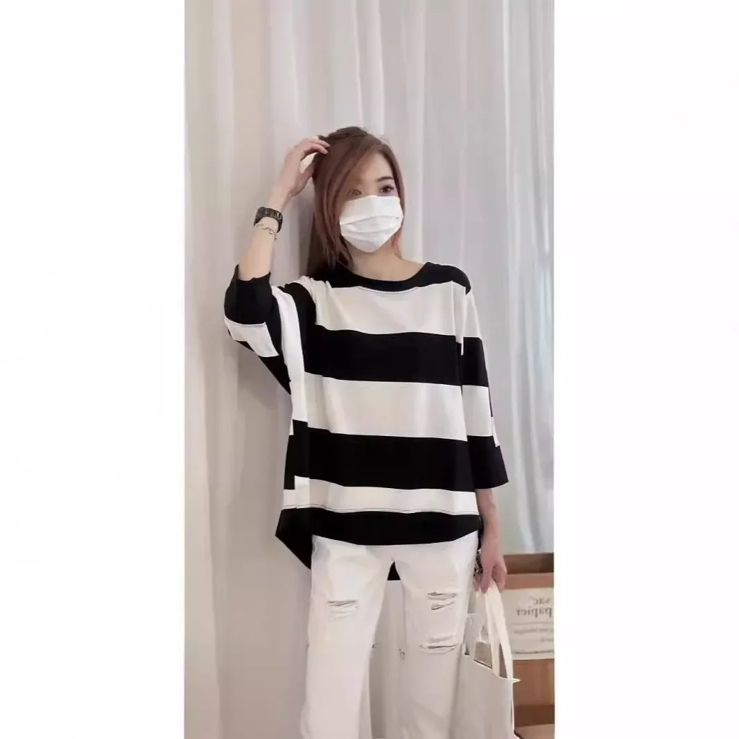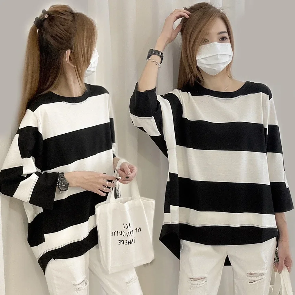رائجة البيع للموسم جديد الترفيه مخطط رقيقة هوديي فضفاض كسول نمط سبعة كم تي شيرت علوي المرأة موضة البوليستر طاقم