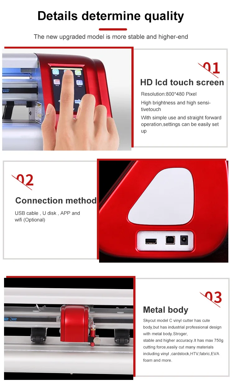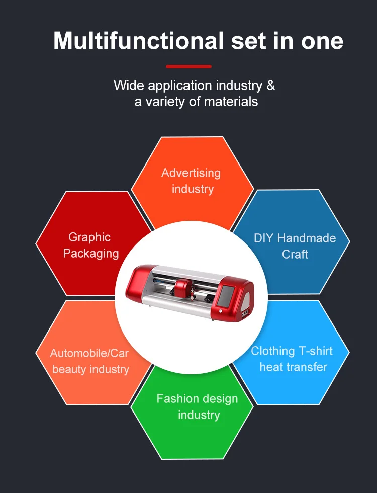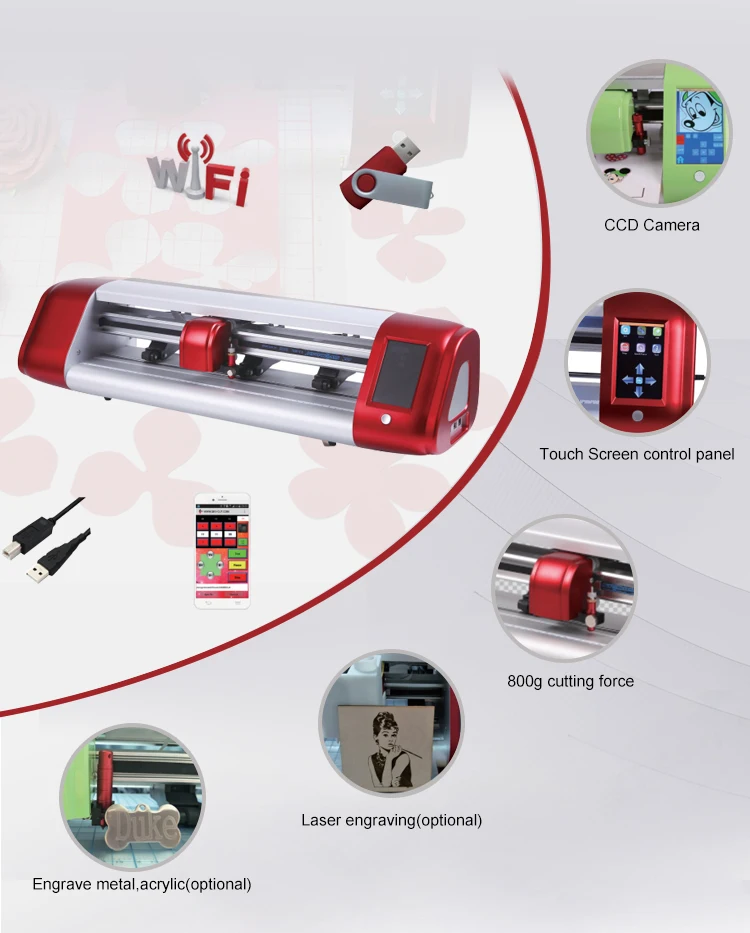 ج10سطح المكتبقطع الفينيلهو قاطع ذكي يستخدم بشكل رئيسي على بطاقات الحرف المنزلية/ملصقات النوافذ وصناعة الهدايا أيضًا تي شيرت قطع طباعة التسامي قبل نقله هذا بدلة راسمة ذكية لقص الورق والملصقات بحجم A3 A4, قوة القطع 800 جراميمكنها قطع ورق 300 جرام وجميع أنواع أفلام الفينيل تقريبًا.