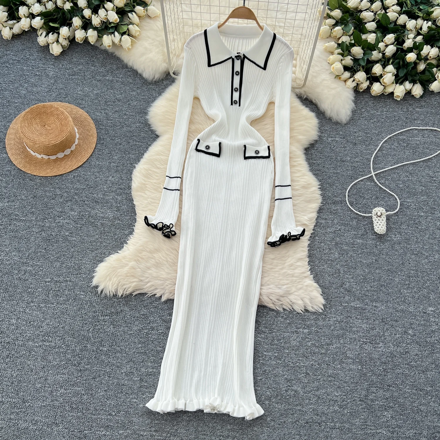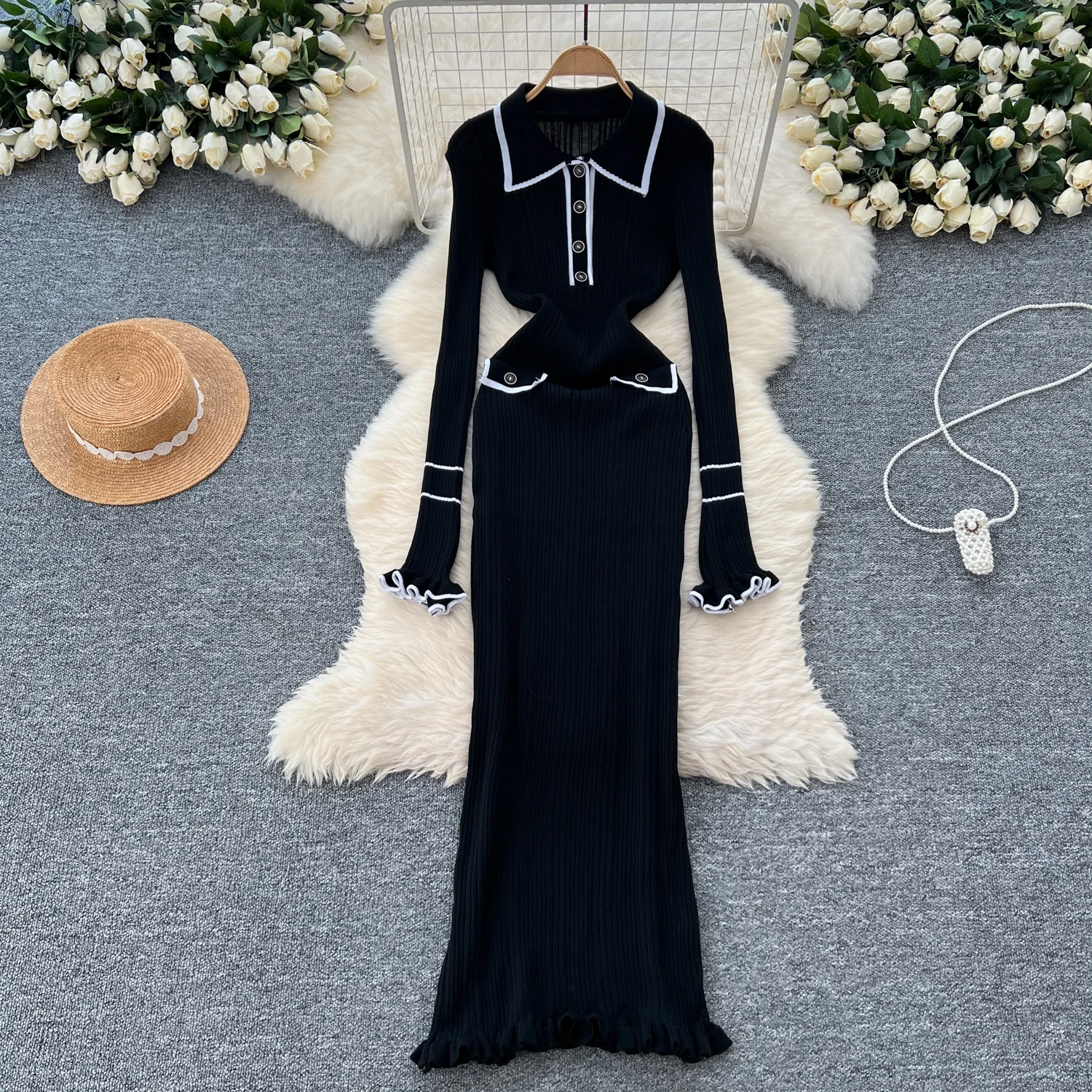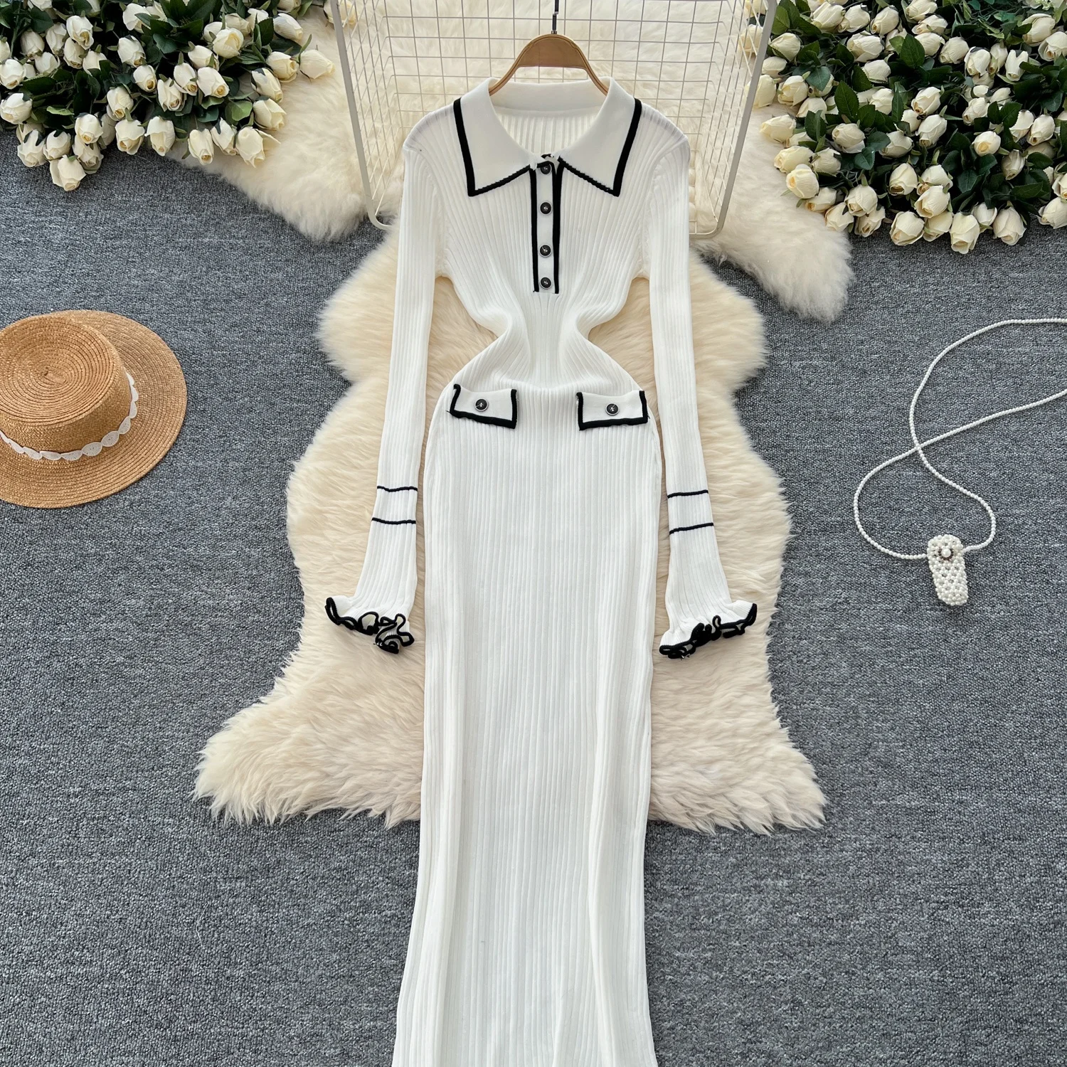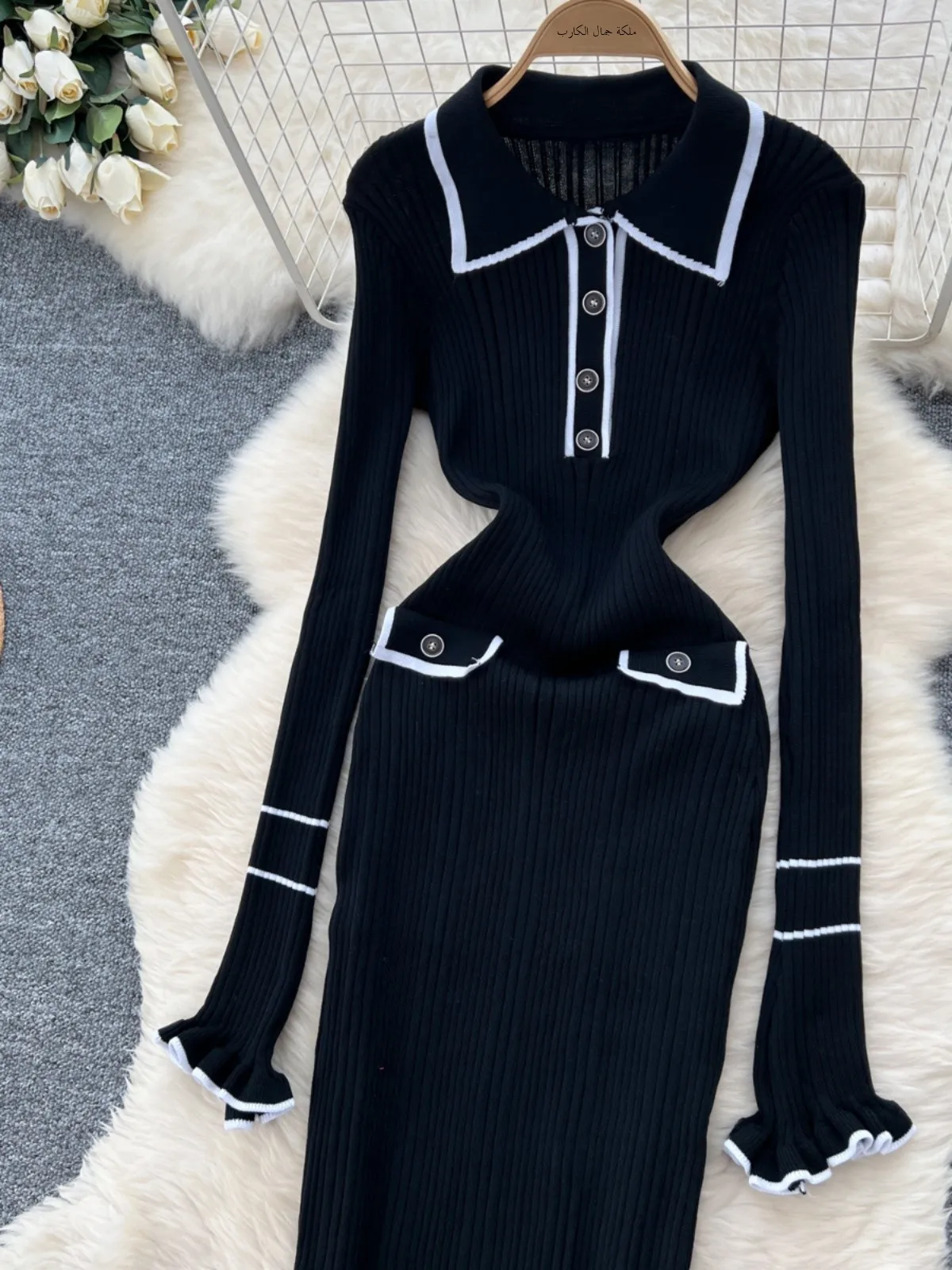 فستان محبوك بأكمام طويلة بتصميم عتيق، ياقة ملونة عصرية، فستان تنحيف بطول الركبة على شكل حرف a للنساء للخريف والشتاء بخصر عالٍ