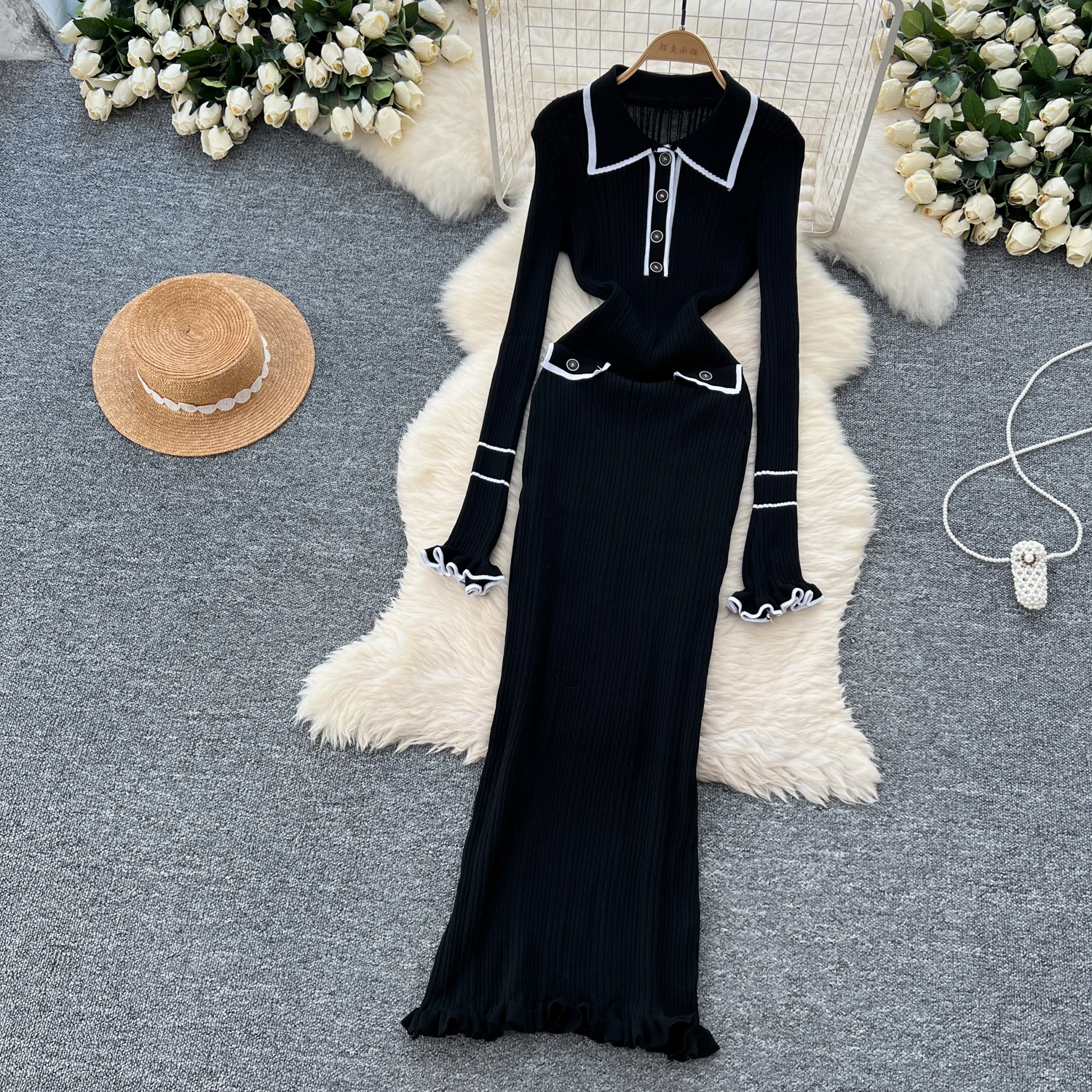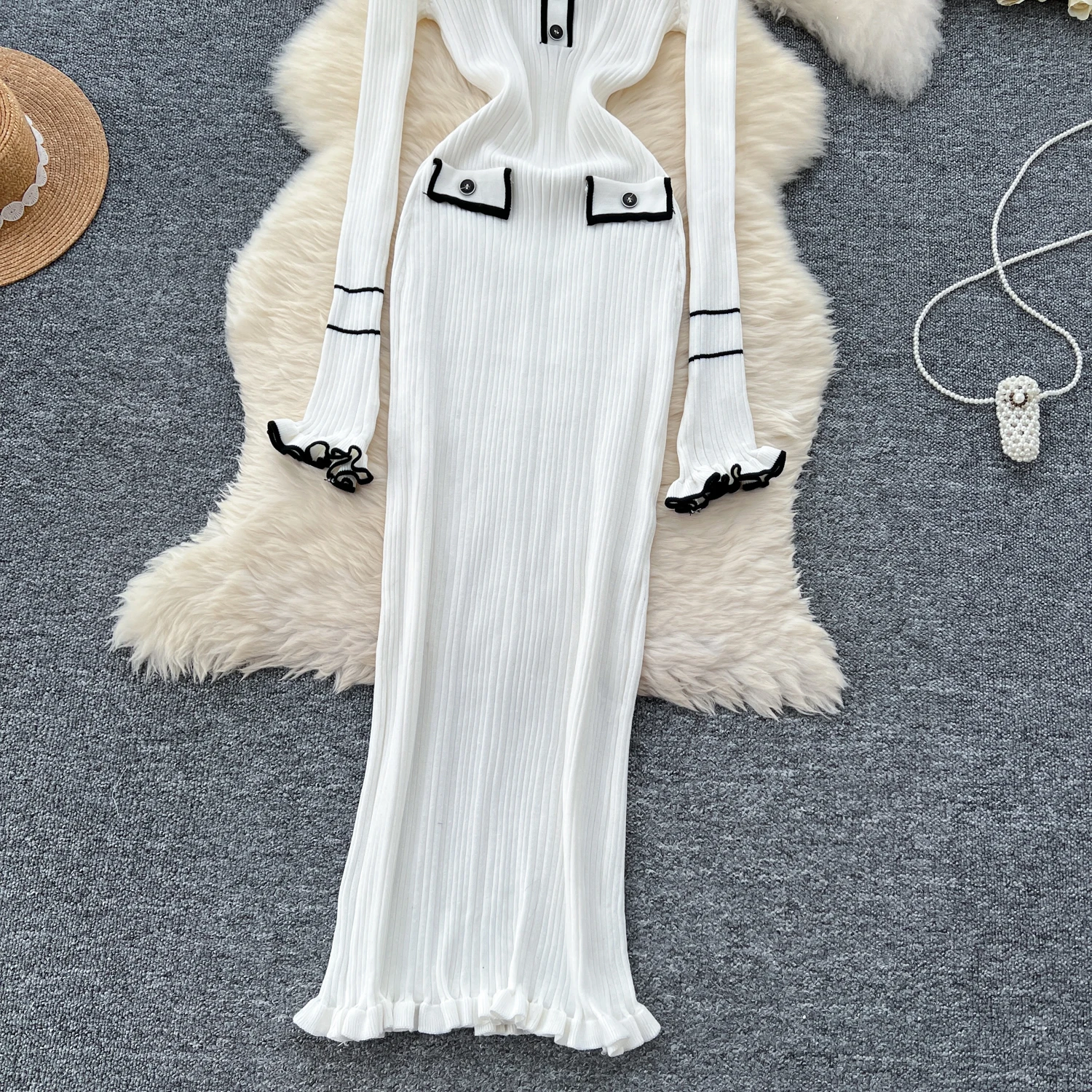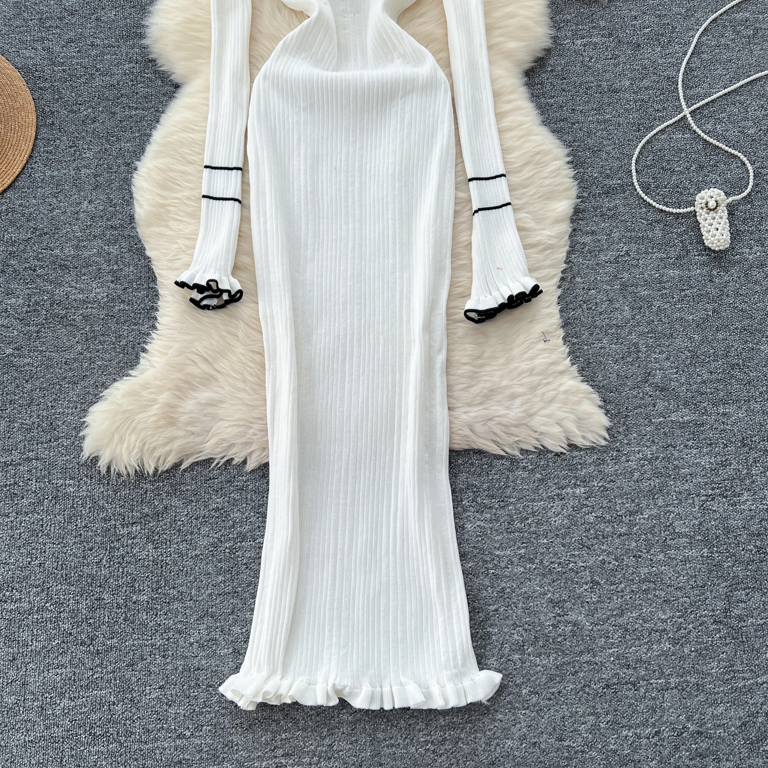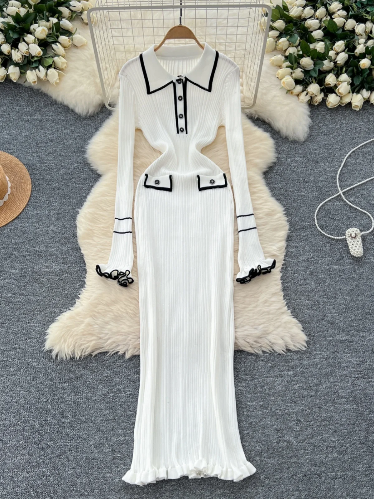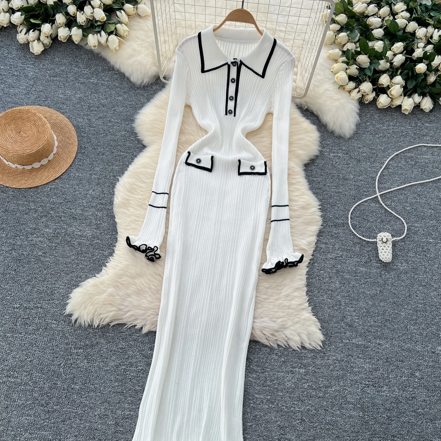 فستان محبوك بأكمام طويلة بتصميم عتيق، ياقة ملونة عصرية، فستان تنحيف بطول الركبة على شكل حرف a للنساء للخريف والشتاء بخصر عالٍ
