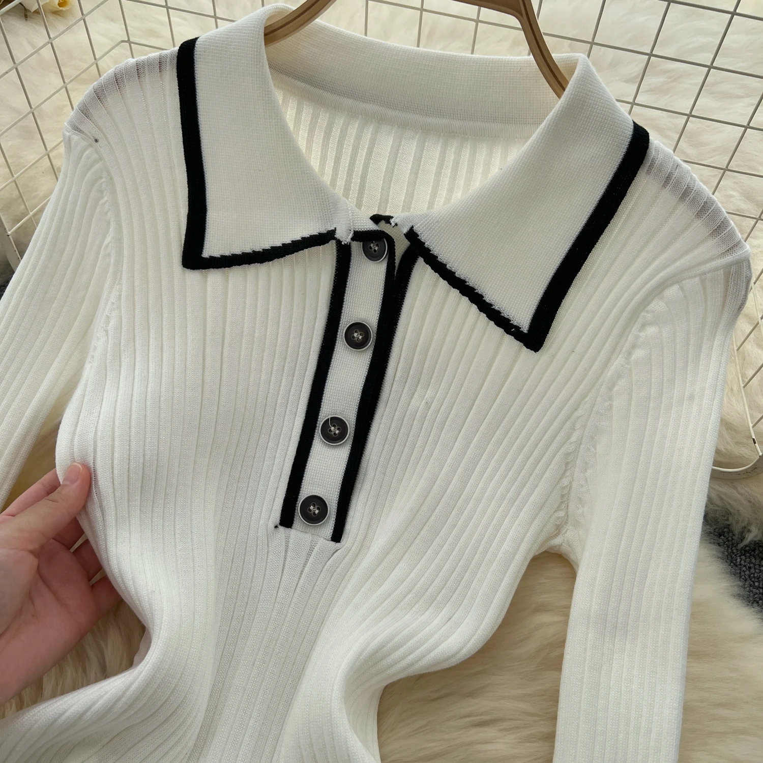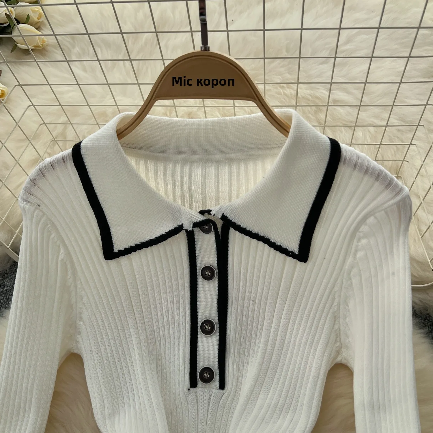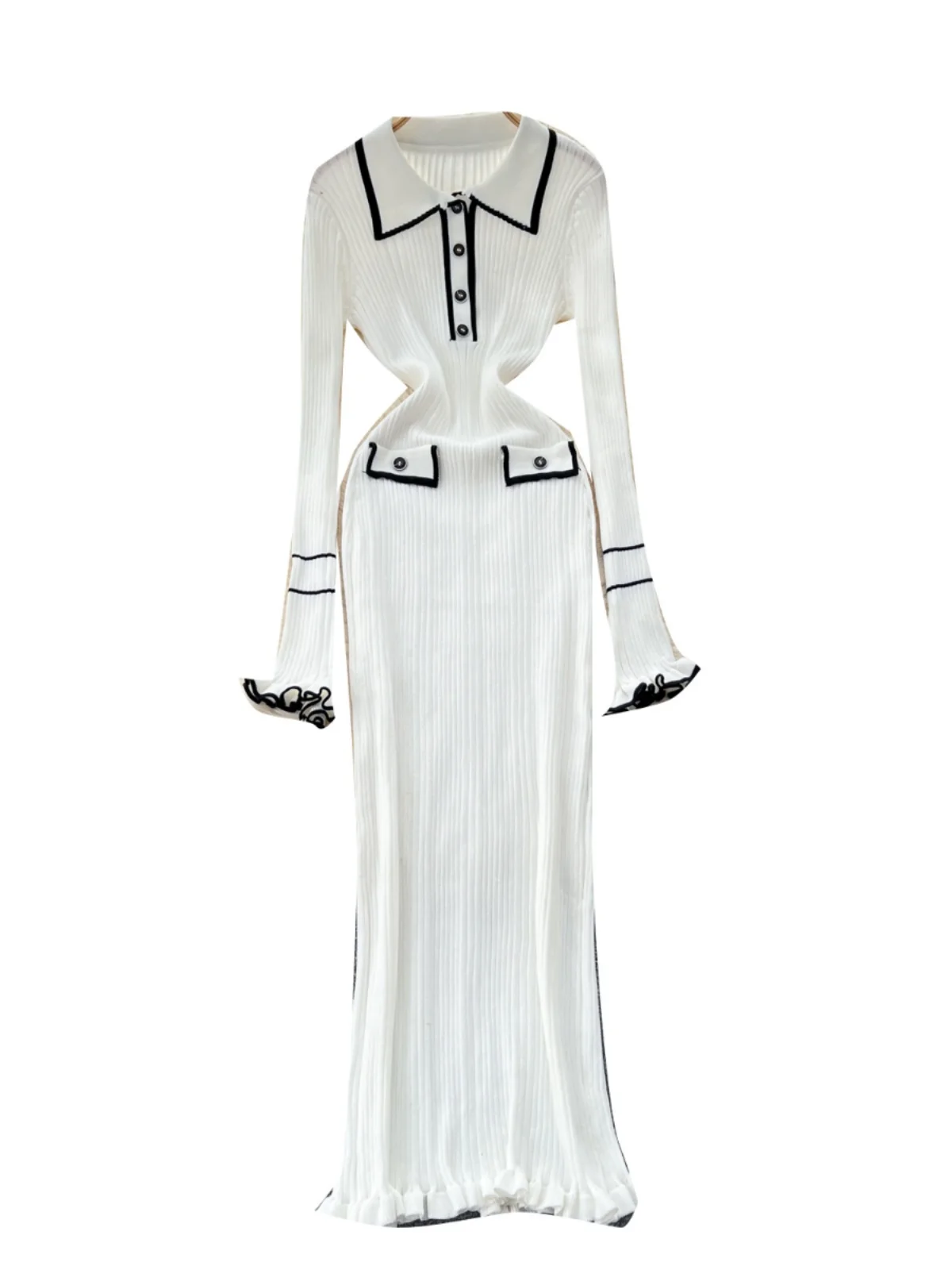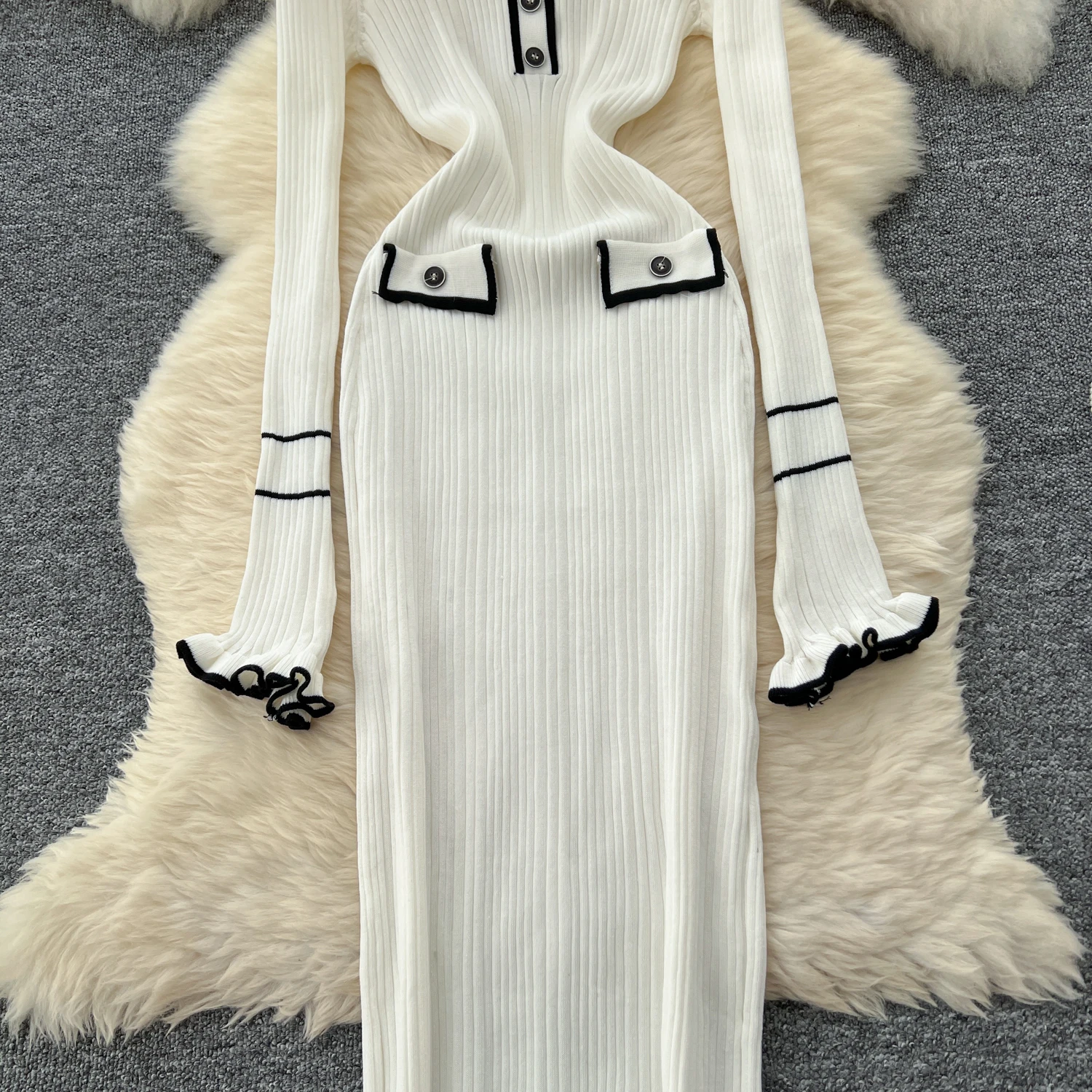 فستان محبوك بأكمام طويلة بتصميم عتيق، ياقة ملونة عصرية، فستان تنحيف بطول الركبة على شكل حرف a للنساء للخريف والشتاء بخصر عالٍ
