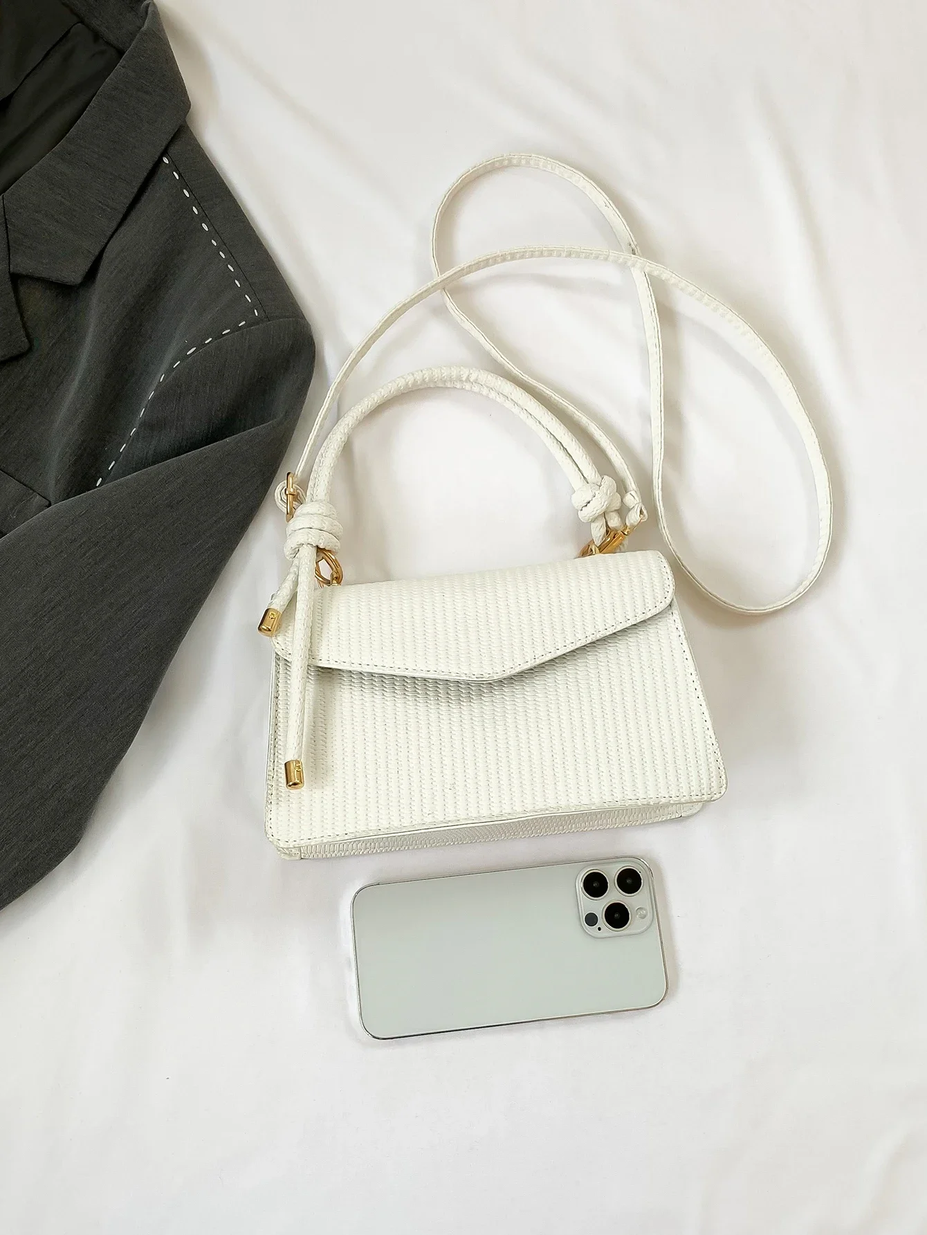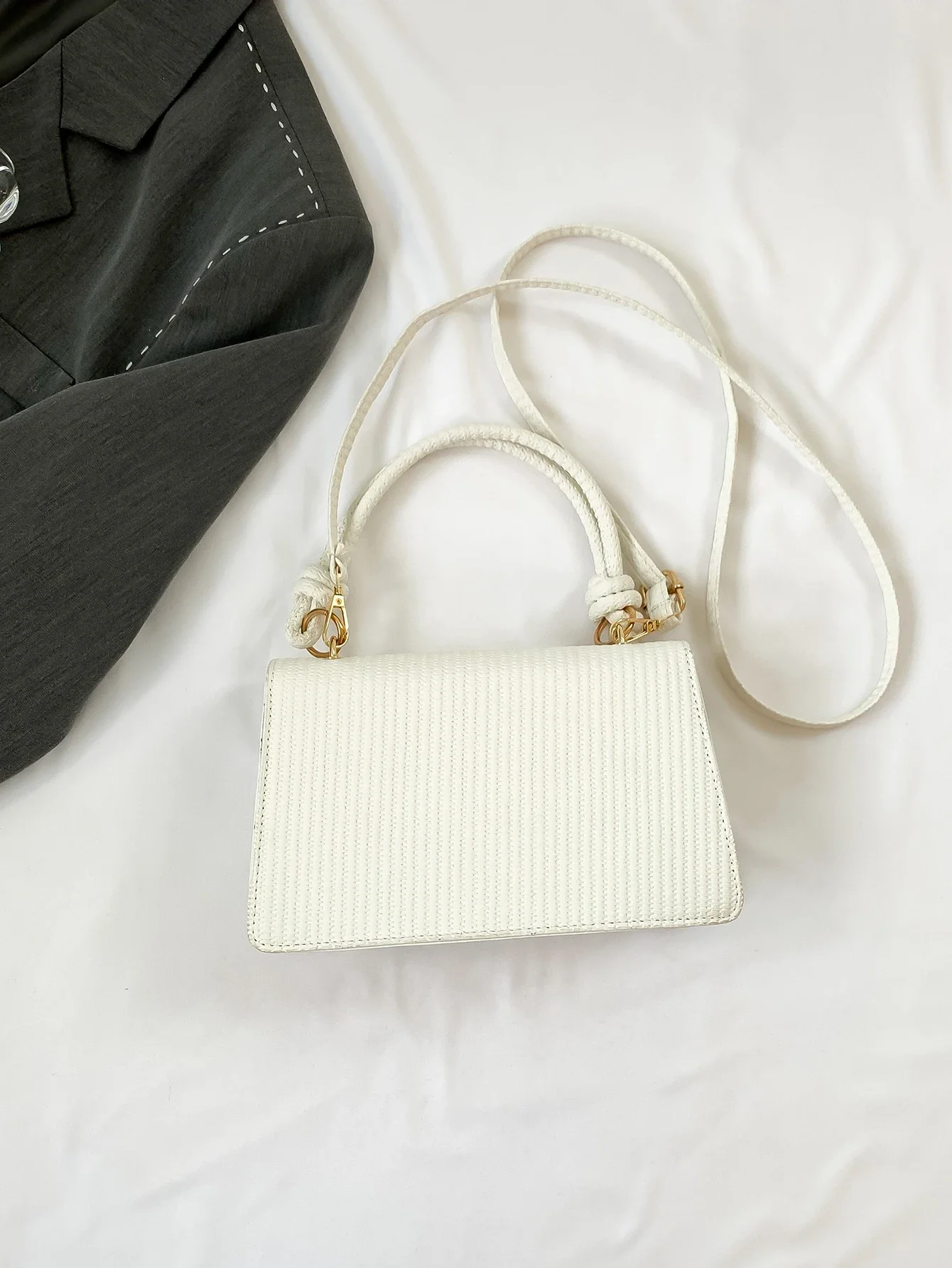 5.ارفع مجموعة الملحقات الخاصة بك مع حقيبة اليد المحبوكة باللون الأبيض.نمط الطباعة الشامل والأسلوب الساحر يجعلها قطعة مميزة، مثالية لإضافة لمسة من الرقي إلى أي ملابس.الحجم الصغير مثالي لحمل أغراضك الأساسية بأناقة.