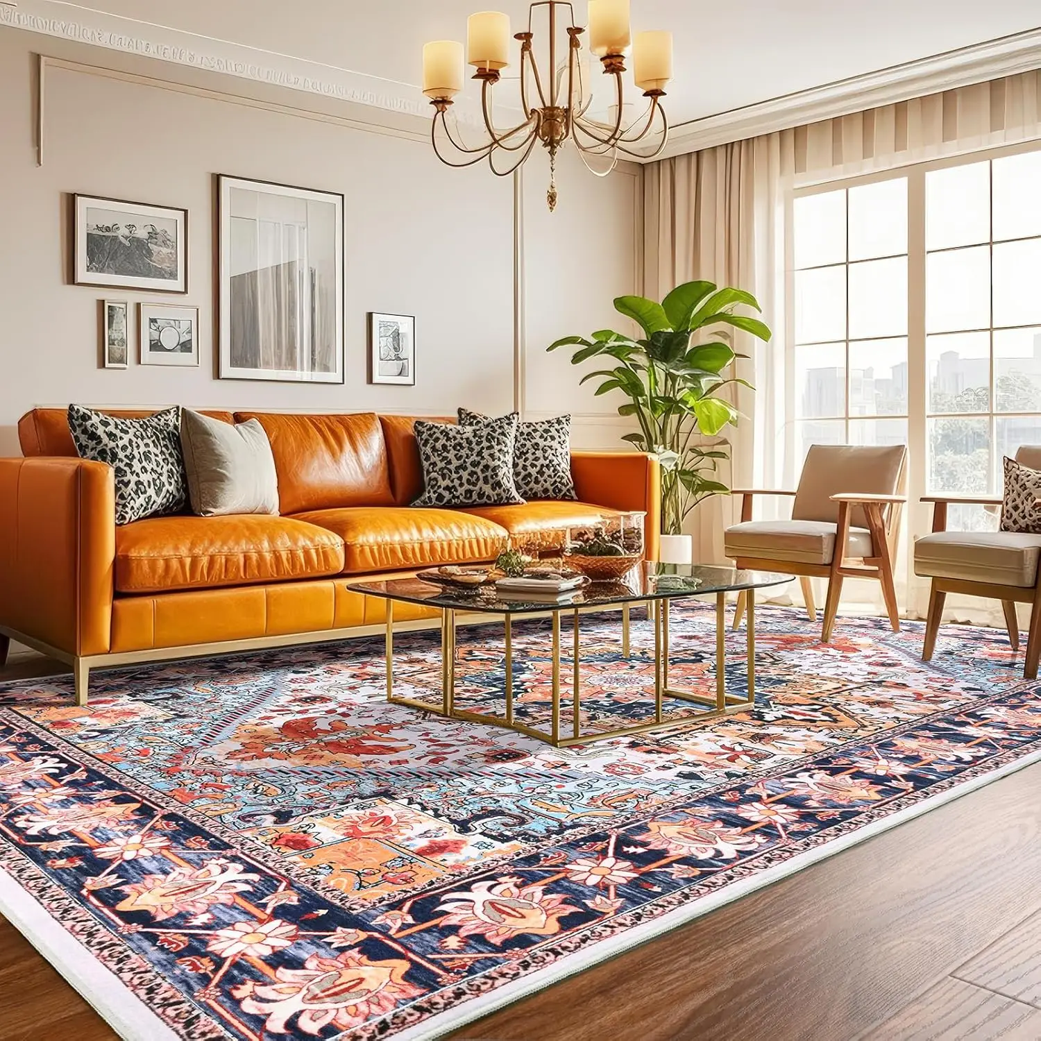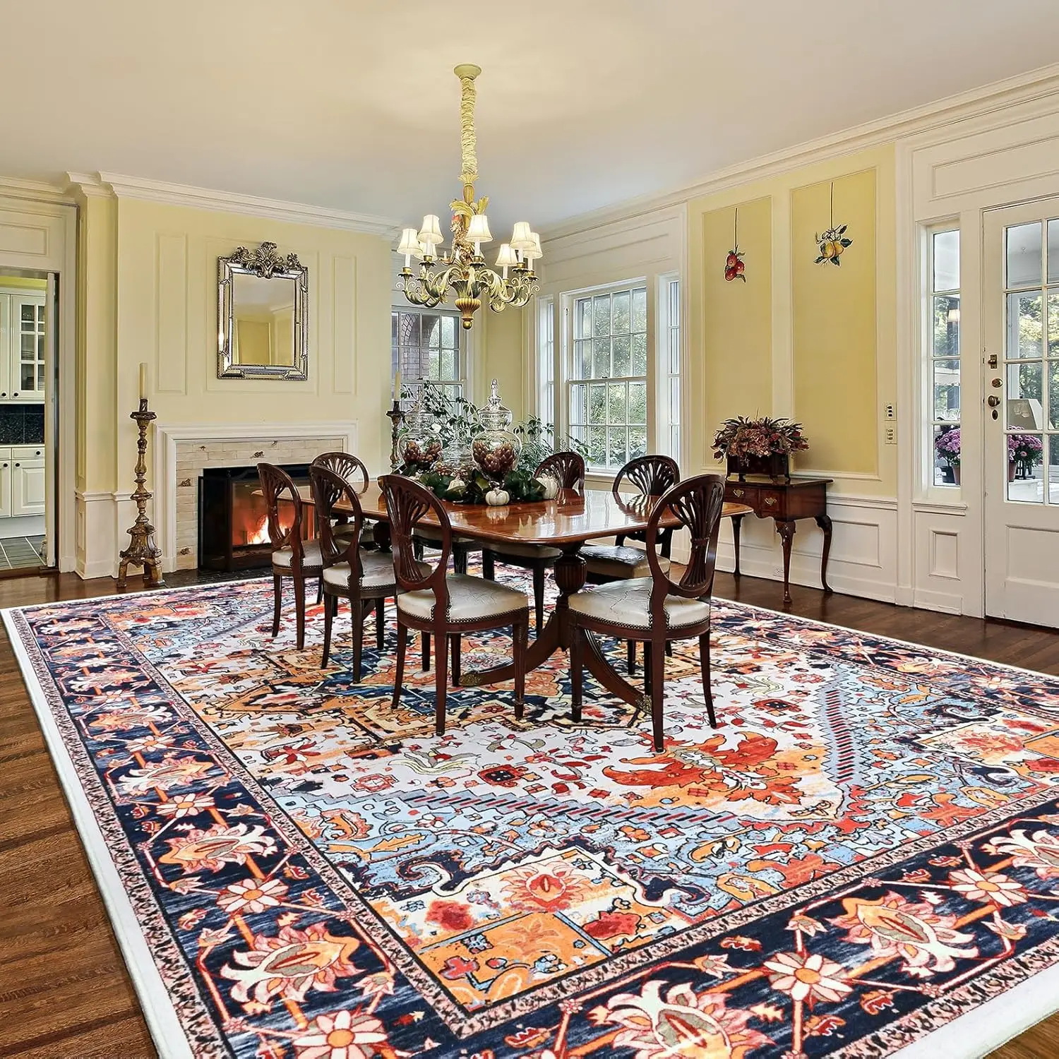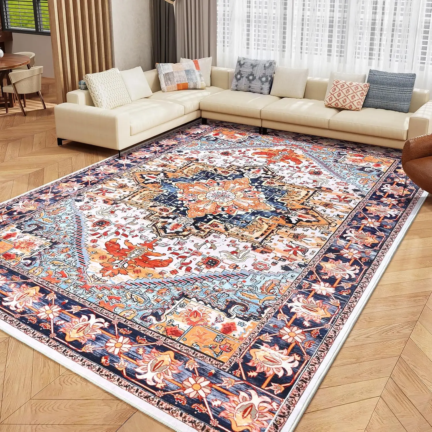 سجادة عتيقة لغرفة المعيشة باللون البيج/متعددة المناطق، سجادة منطقة كبيرة قابلة للغسل في الغسالة مع تصميم مانع للانزلاق وزهور حديثة