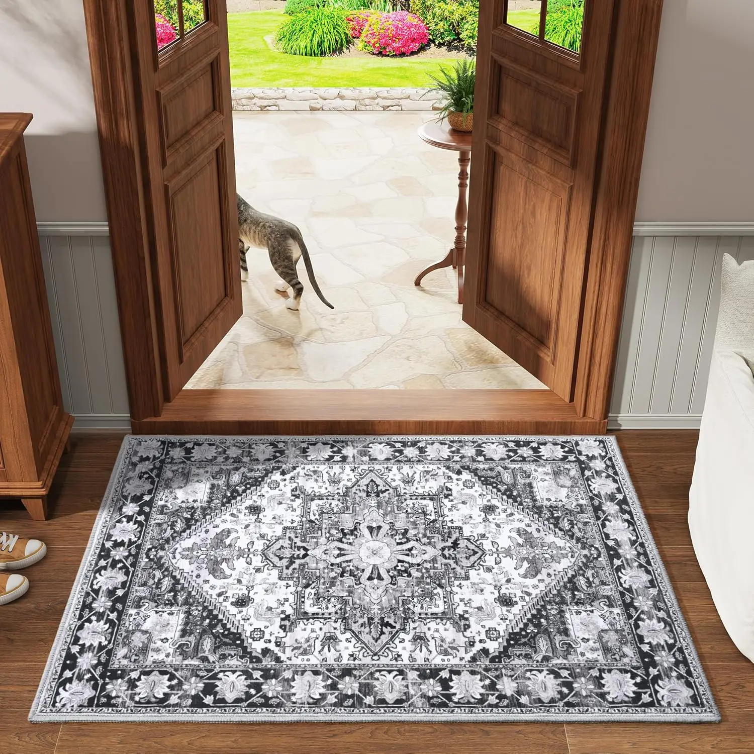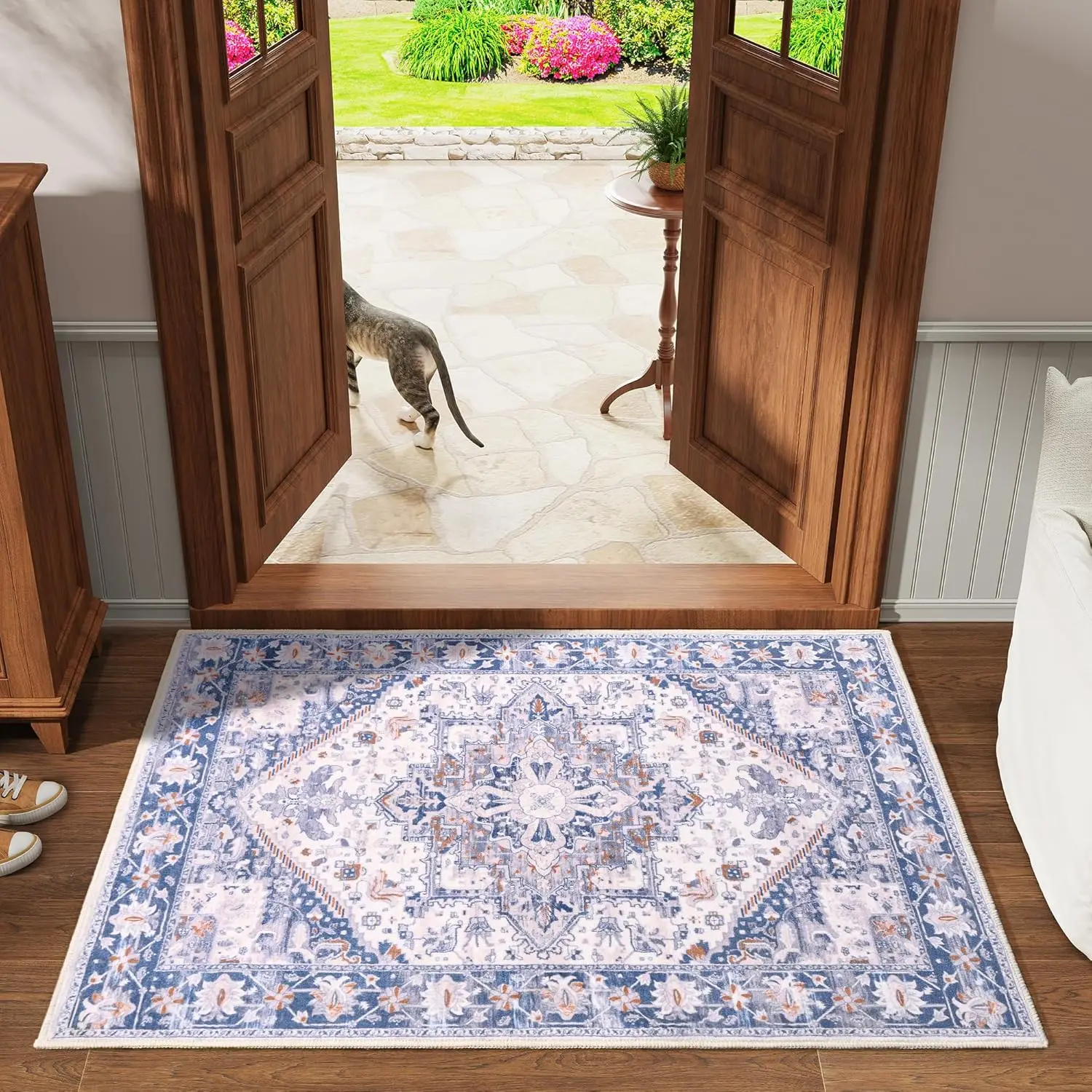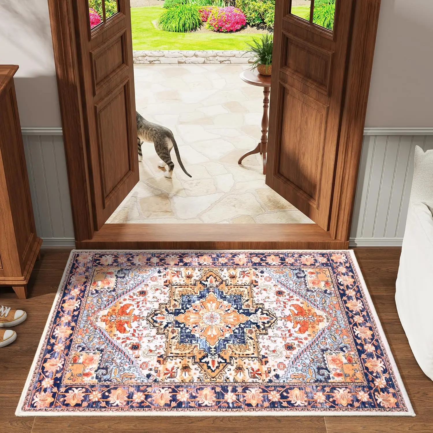 سجادة عتيقة لغرفة المعيشة باللون البيج/متعددة المناطق، سجادة منطقة كبيرة قابلة للغسل في الغسالة مع تصميم مانع للانزلاق وزهور حديثة