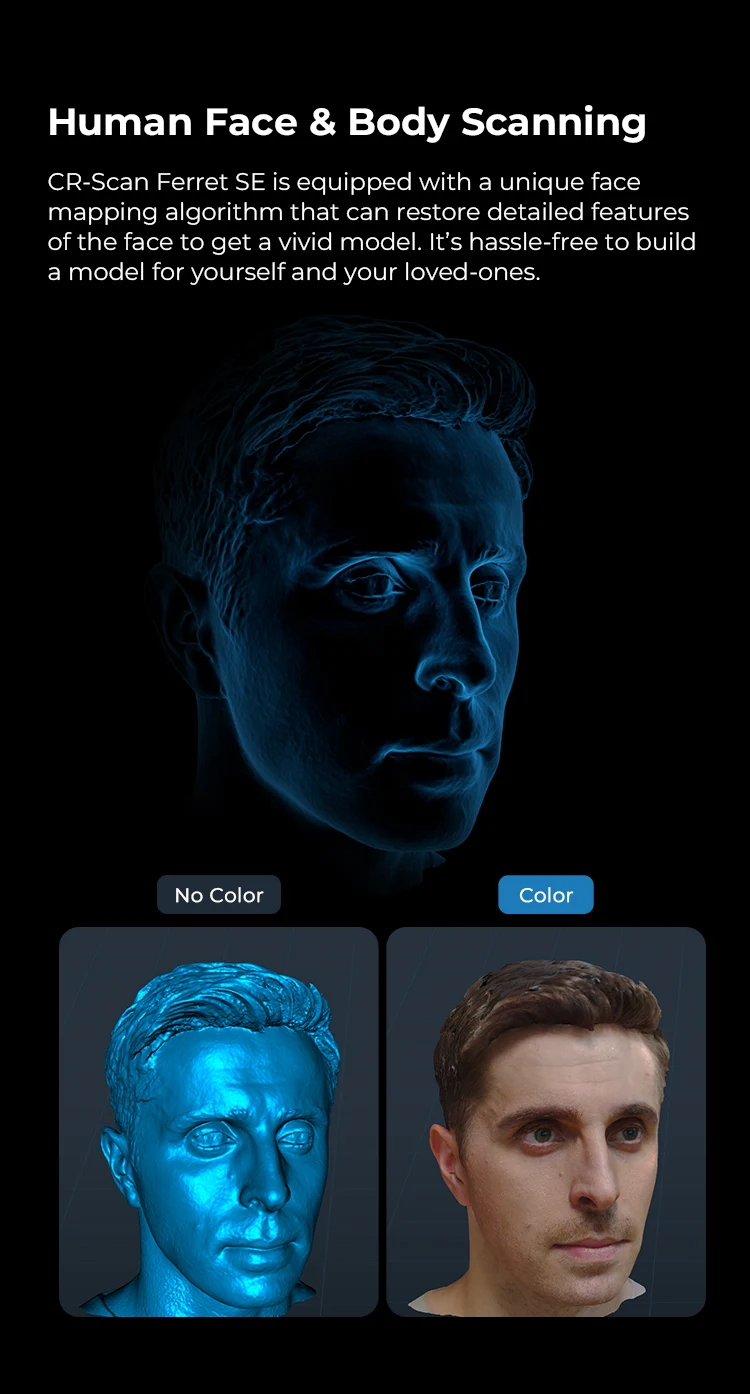 تم تجهيز CRScan Ferret SE بخوارزمية فريدة لتخطيط الوجه يمكنها استعادة الميزات التفصيلية للوجه للحصول على نموذج حيوي خالٍ من المتاعب لنموذج Builoa