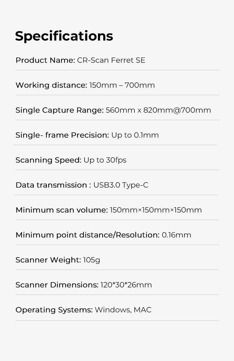 يتميز CR-Scan Ferret SE بدقة مذهلة تصل إلى 0.1 ملم.بالإضافة إلى ذلك، يمكن لدقتها التي تبلغ 0.16 مم التقاط بيانات أبعاد واسعة النطاق وتفاصيل معقدة لتشكيل نماذج واقعية للغاية.