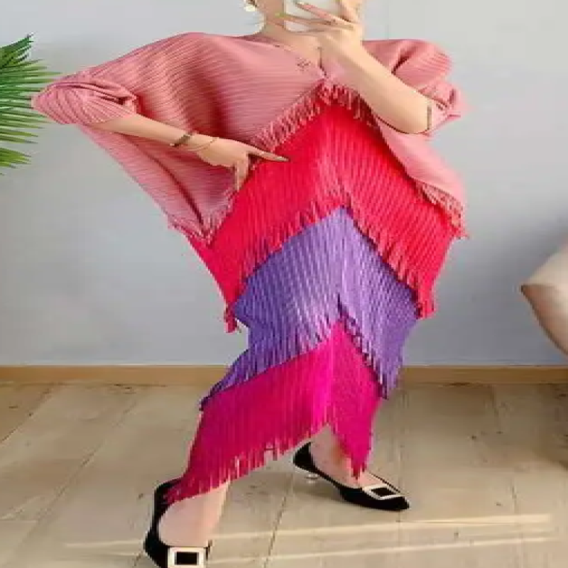 فستان مياكي (مناسب للجميع المقاسات) بطيات شرابة تدريجية لربيع وصيف 2025 فستان جديد متباين ملون وعصري ضيق ملفوف على الورك بخطوة واحدة