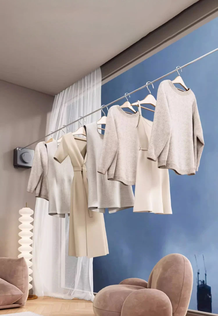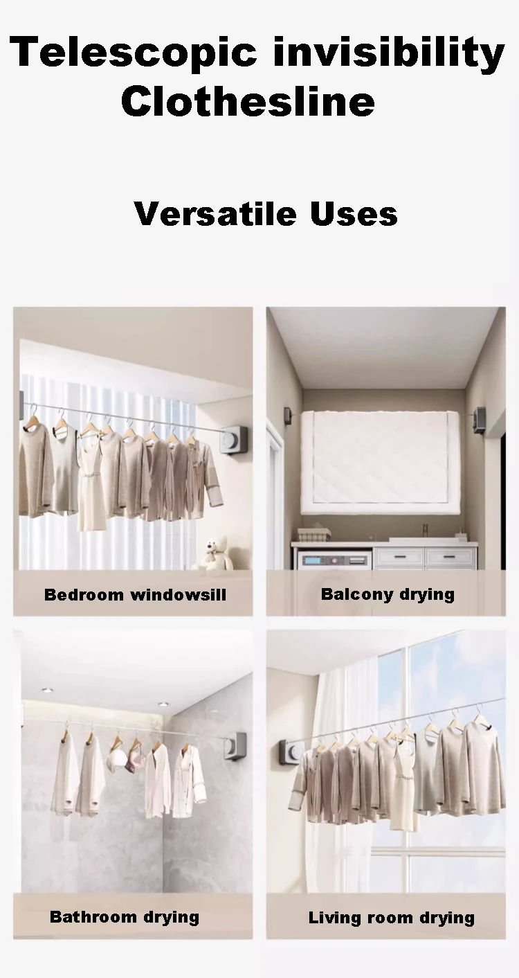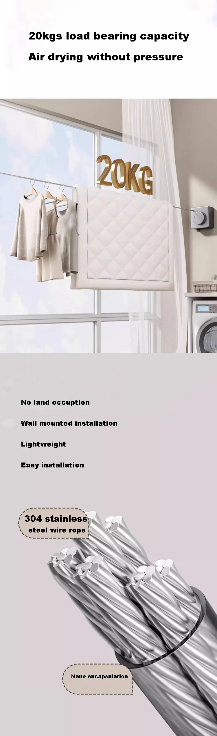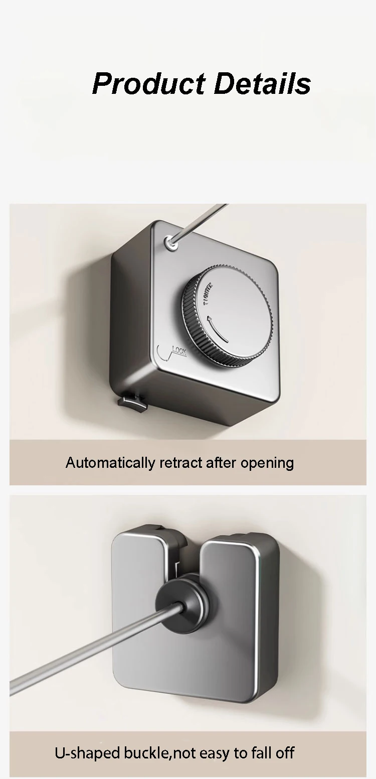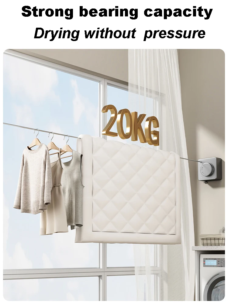 مرن: حبل غسيل مدمج قابل للسحب يمكن قفله بالطول المطلوب أو تمديده إلى القدمين (من من من من الداخل) بسعة تحميل قصوى تبلغ 20. يمكن سحبه بسهولة عند عدم الاستخدام.
