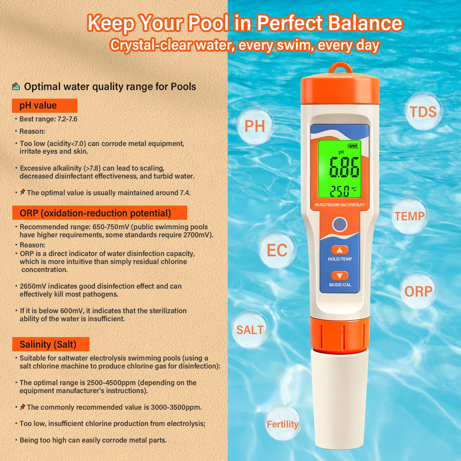 قلم اختبار رقمي لجودة المياه 7 في 1 لدرجة الحموضة وEC وTDS وORP والملوحة والسماد ودرجة الحرارة.يتميز بدقة ±0.05pH، و±2% FS لـ EC/TDS/الملح، و±0.5℃ دقة درجة الحرارة.مع تعويض درجة الحرارة التلقائي (0-60℃)، شاشة LCD بإضاءة خلفية، وتصميم مقاوم للماء IP67.معايرة بسيطة، ومسبار قابل للاستبدال، ونمط قلم محمول يجعلها مثالية للزراعة المائية، وحوض السمك، وحمام السباحة، ومياه الشرب، والزراعة، والاختبارات المعملية.
