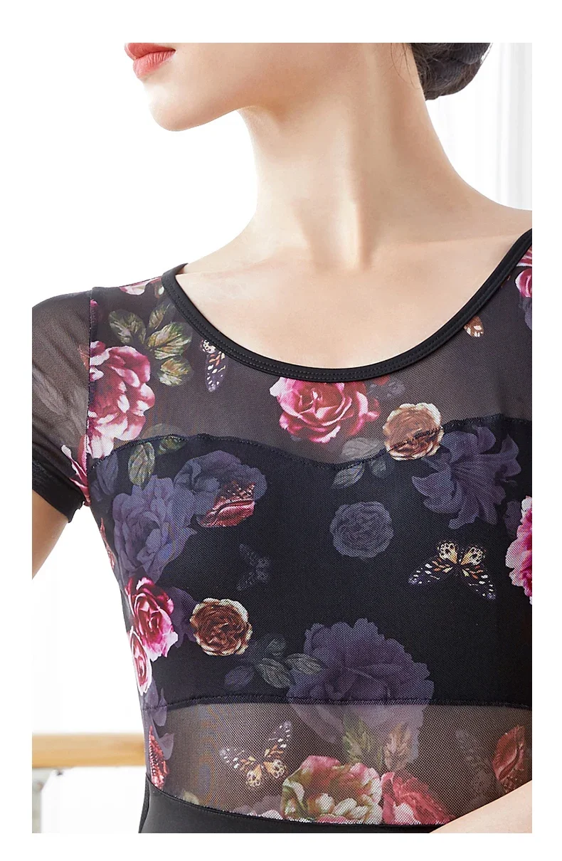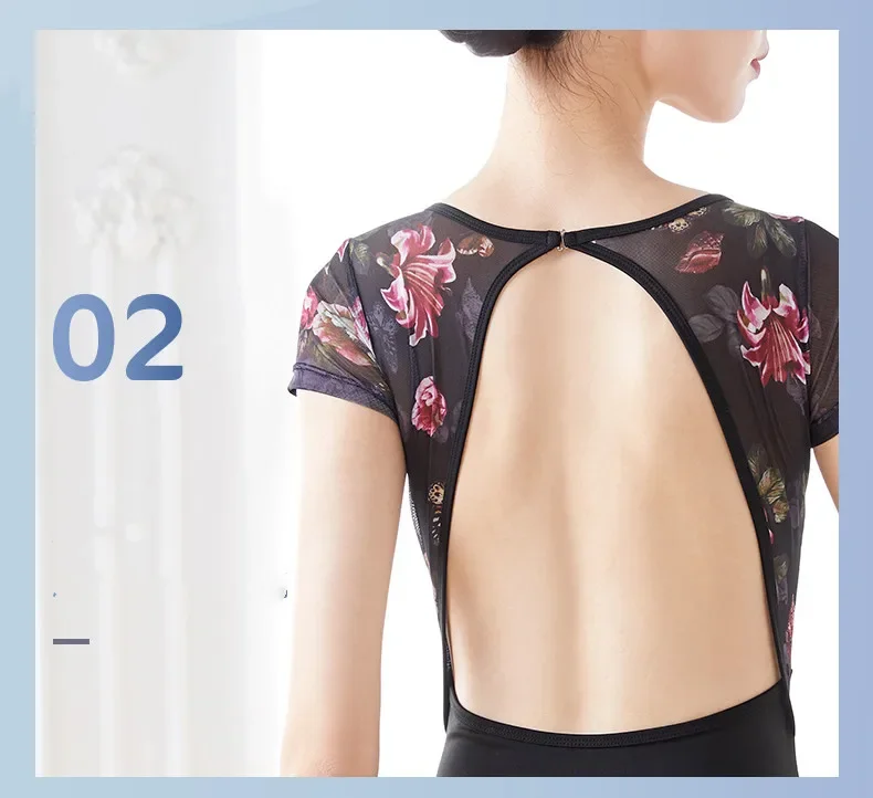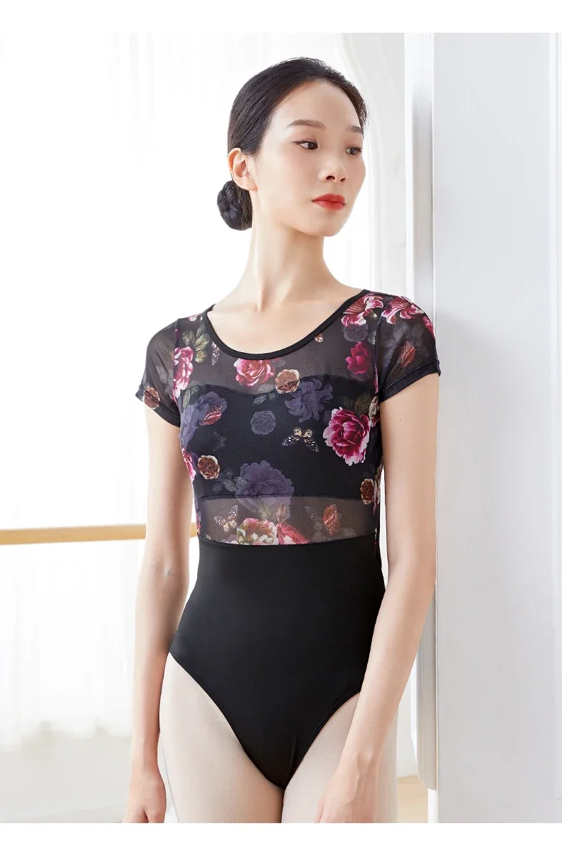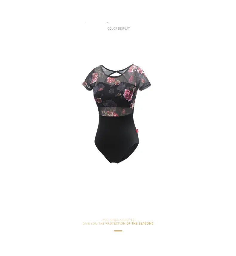 ملابس سباحة نسائية ثياب بدون ظهر بأكمام قصيرة وطباعة زهور مرقعة للفتيات البالغات بدلة تزلج باليه للرقص