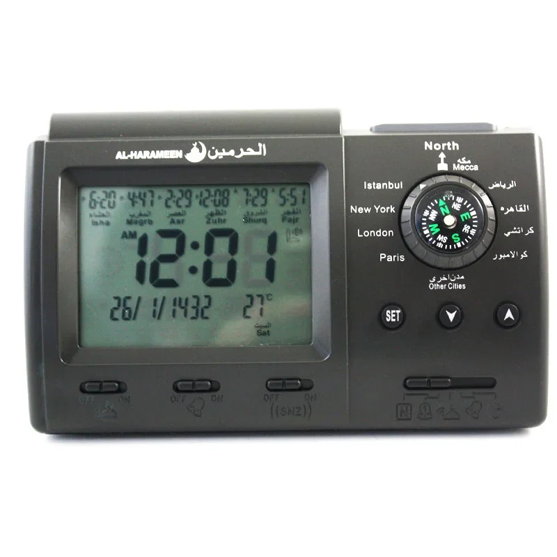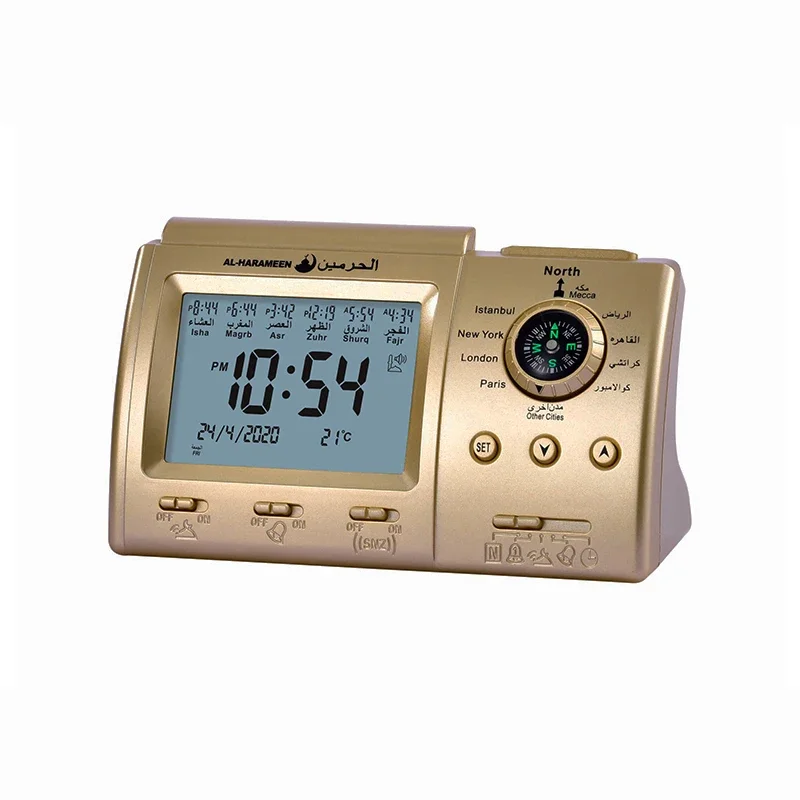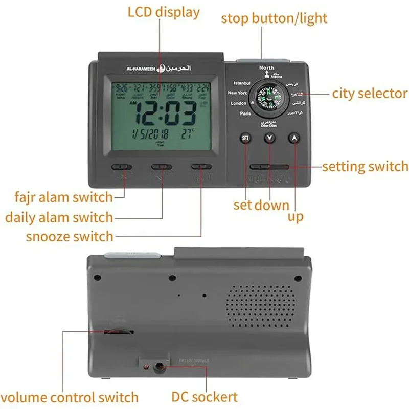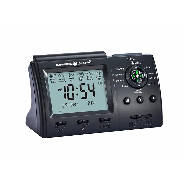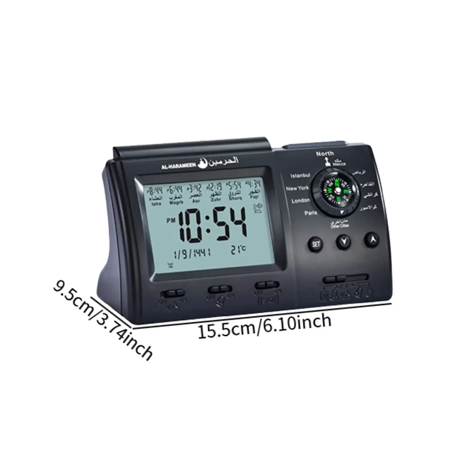 أذان المنبه ساعة هدية درجة الحرارة مسلم الوقت الإسلامي ساعة الطاولة مصباح ليد التقويمات للصلاة القبلة اتجاه عرض درجة الحرارة المميزات :