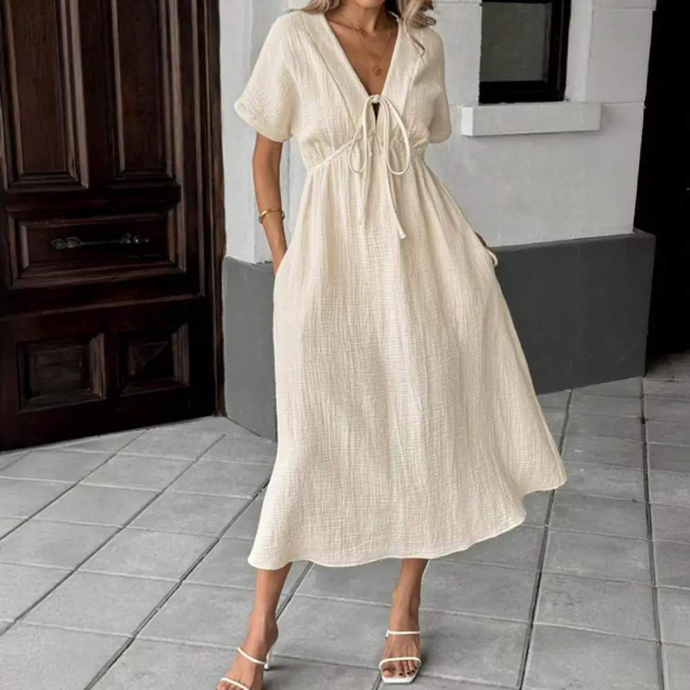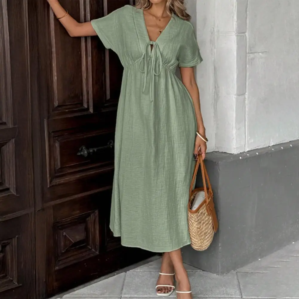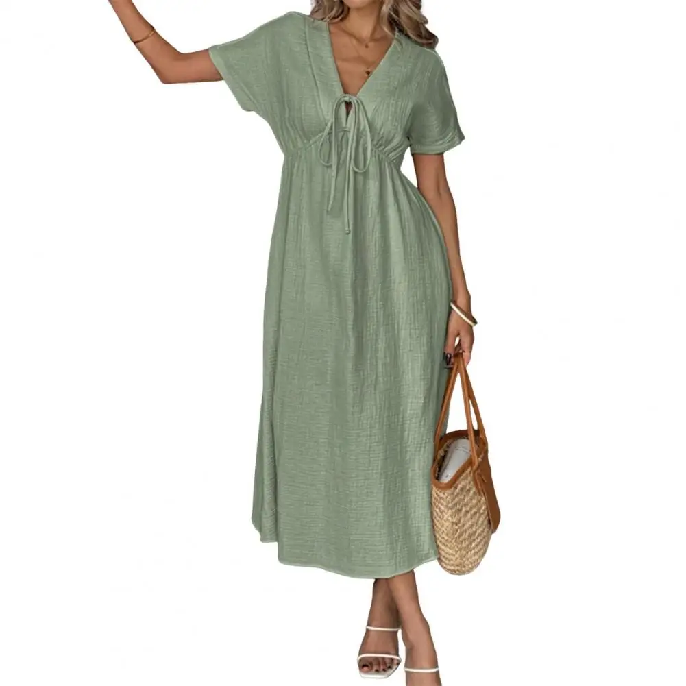 فستان نسائي برقبة على شكل حرف v وأكمام قصيرة وخصر عالٍ فستان ميدي بلون سادة وحاشية انسيابية فستان كاجوال ملابس يومية