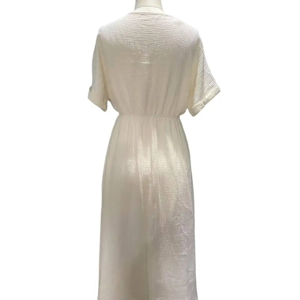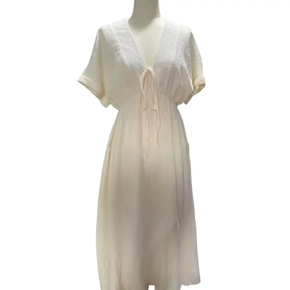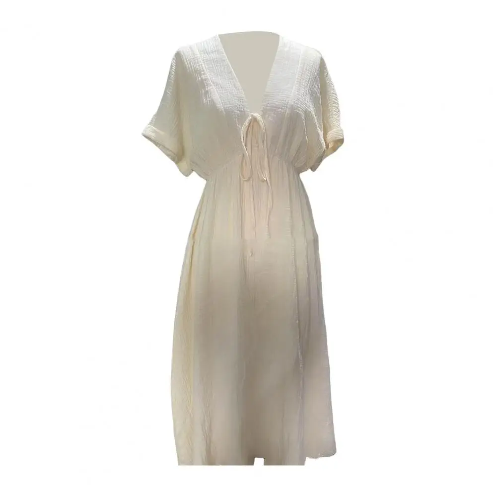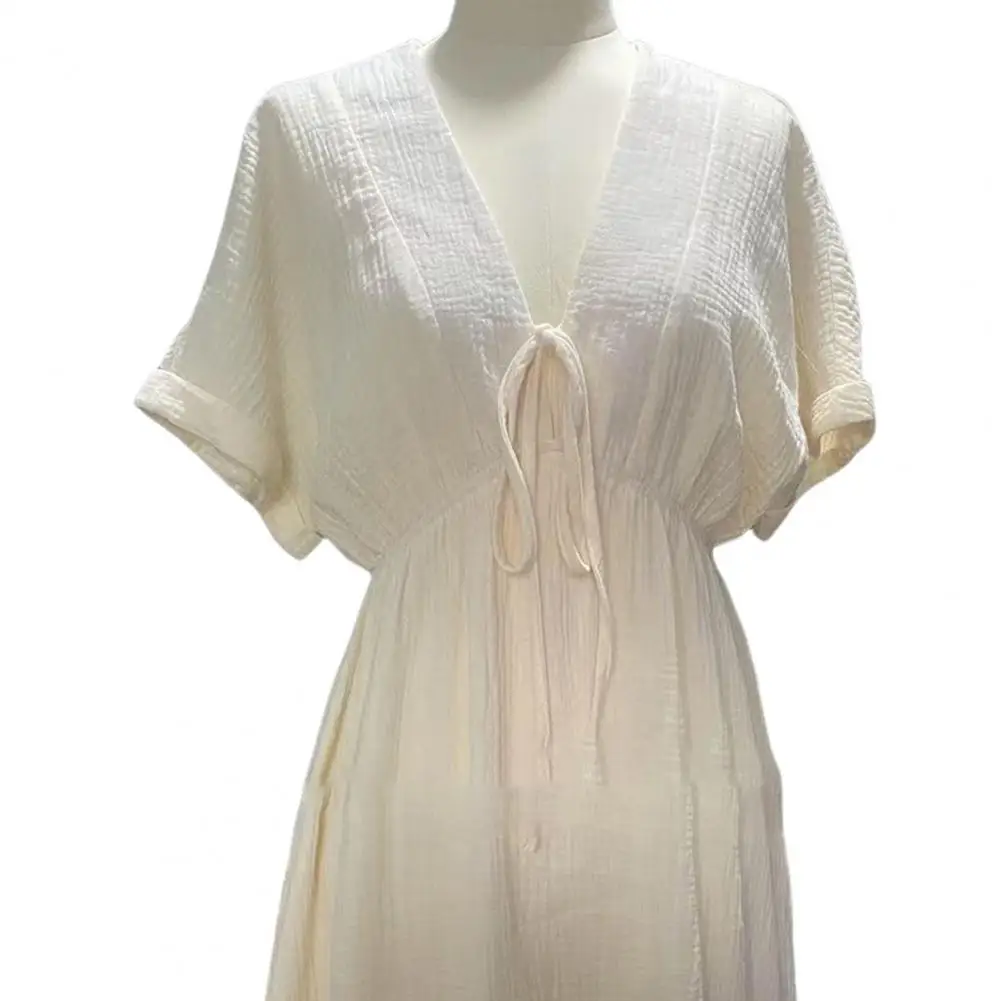 فستان نسائي برقبة على شكل حرف v وأكمام قصيرة وخصر عالٍ فستان ميدي بلون سادة وحاشية انسيابية فستان كاجوال ملابس يومية