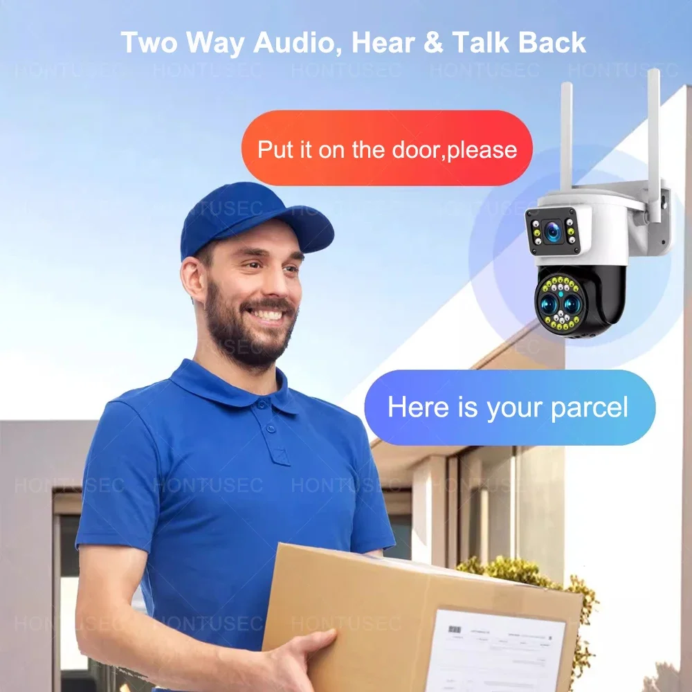 ميكروفون ومكبر صوت مدمجان / مكبرات صوت جديدة مخصصة بصوت عالٍ؛ يمكنك التحدث إلى أي شخص بالقرب من الكاميرا (تحذير شخص ما من مغادرة منزلك).