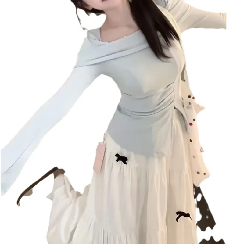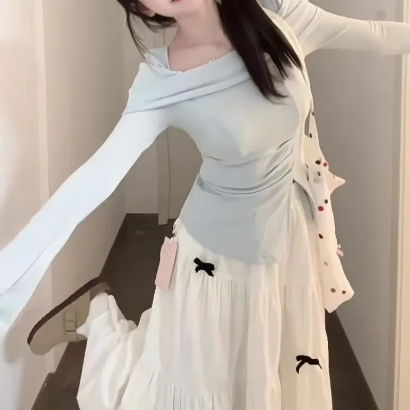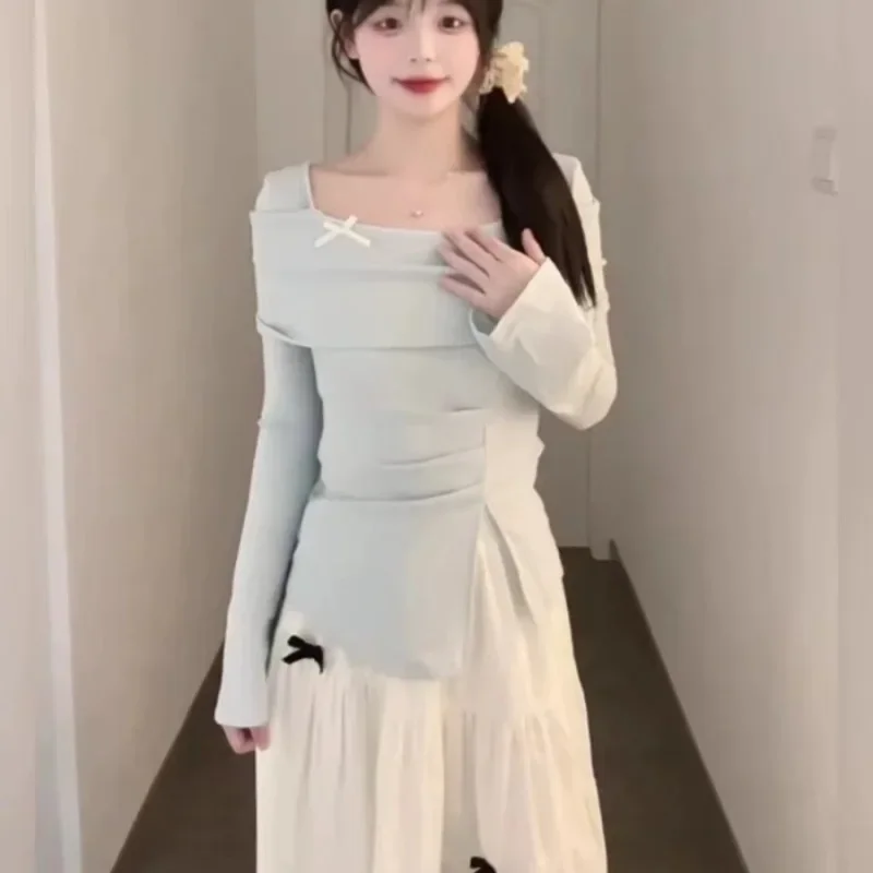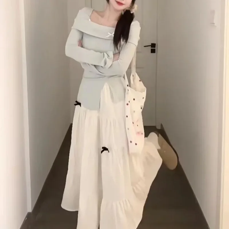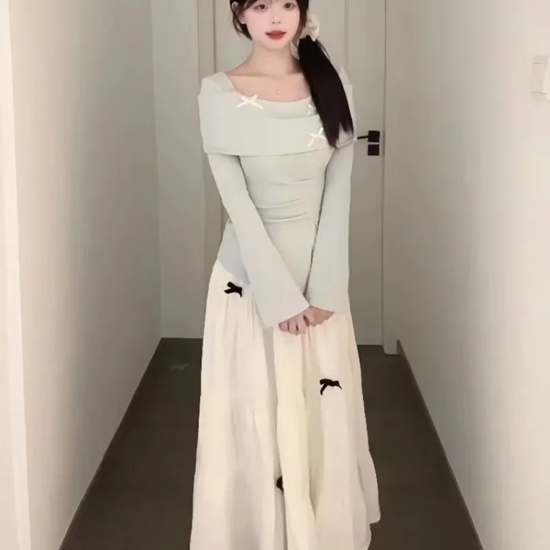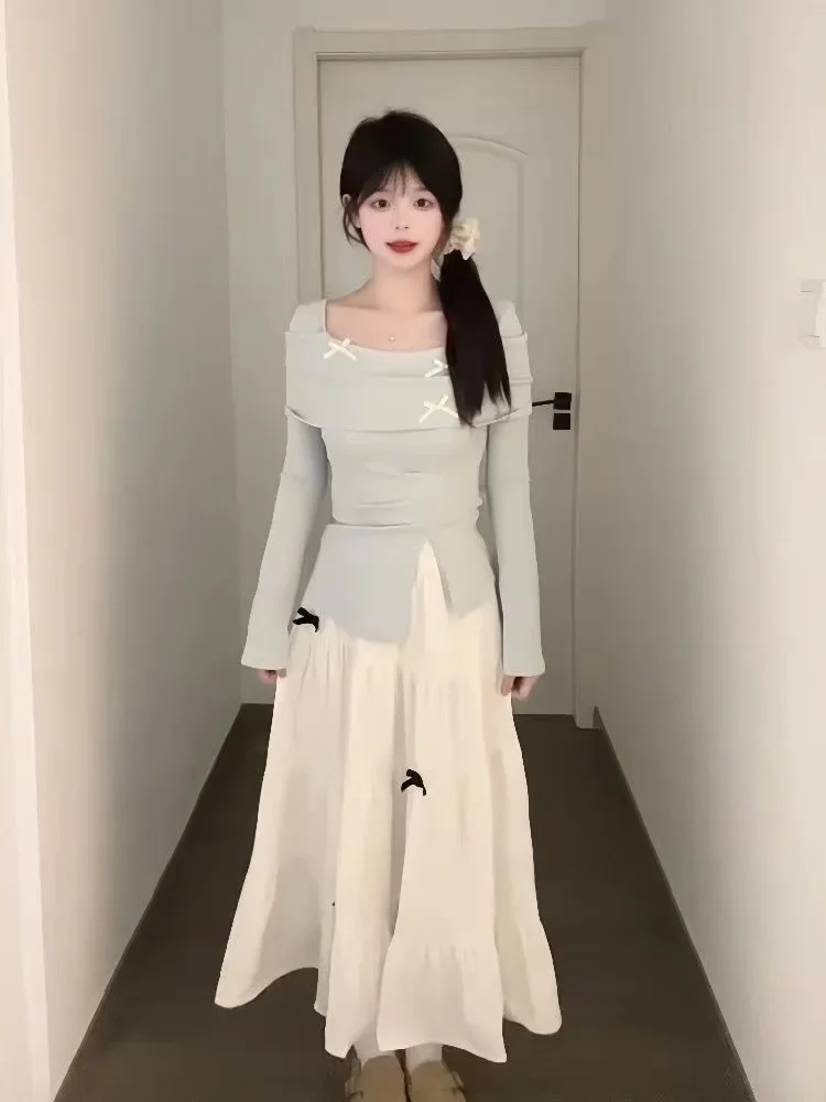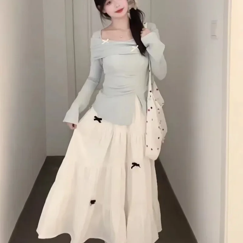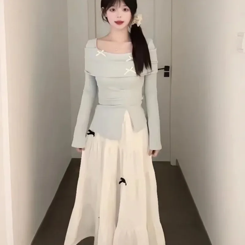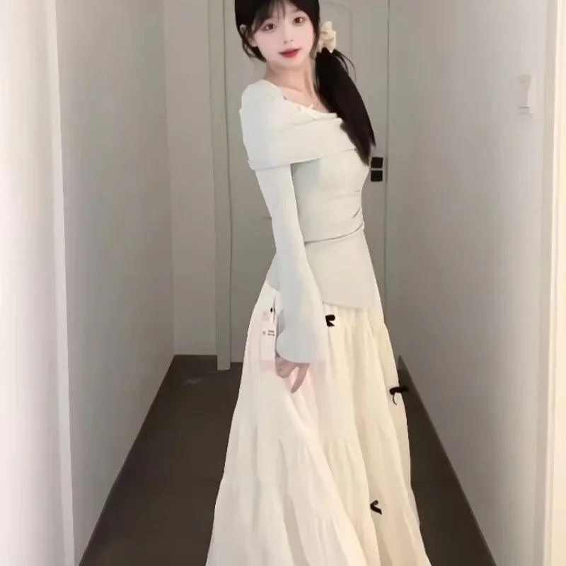 مجموعة محبوكة عصرية للنساء مع تصميم فيونكة، تنورة تنحيف عالية الخصر مكونة من قطعتين، نمط الخريف والشتاء، رغبة نقية