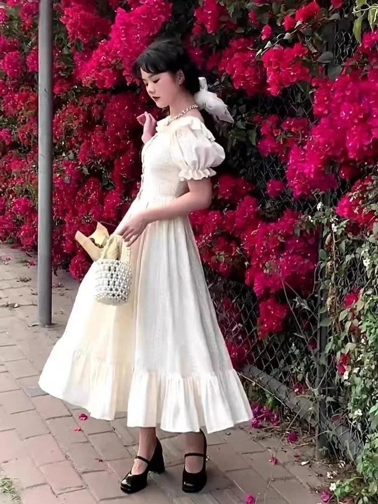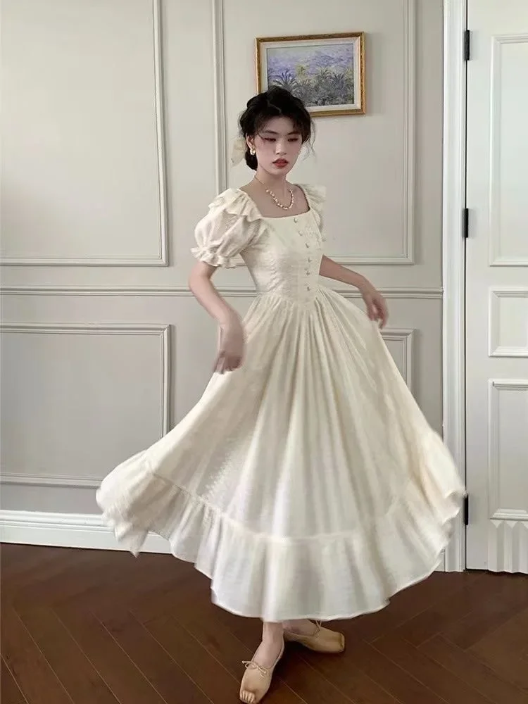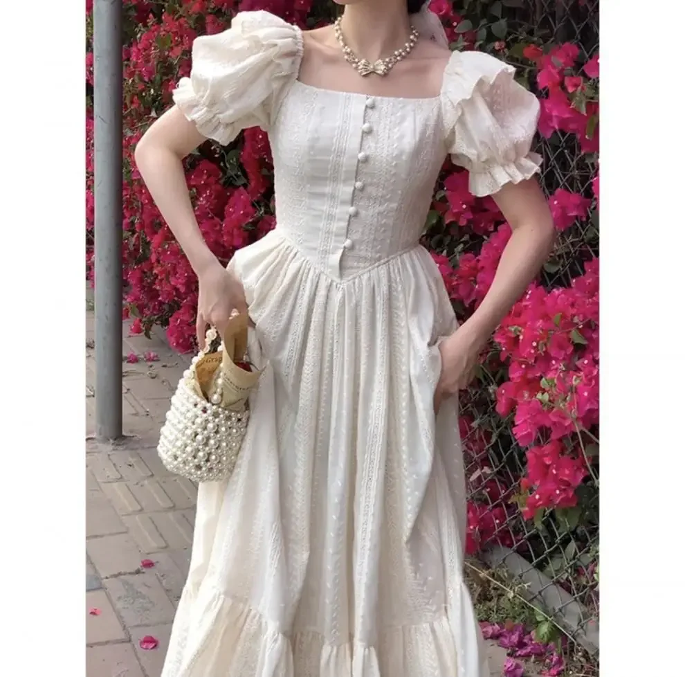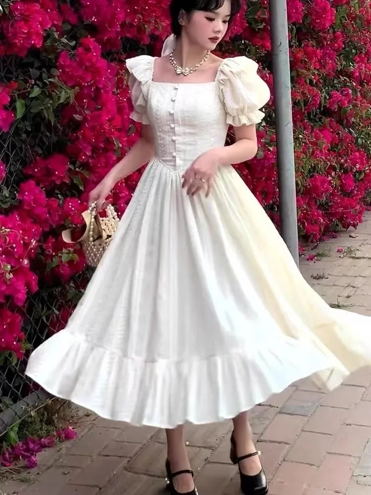 فستان Sweetpuff على الطراز الفرنسي بدون أكمام وياقة مربعة فستان أنيق للخصر مناسب للتخسيس فستان الأميرة للنساء صيفي