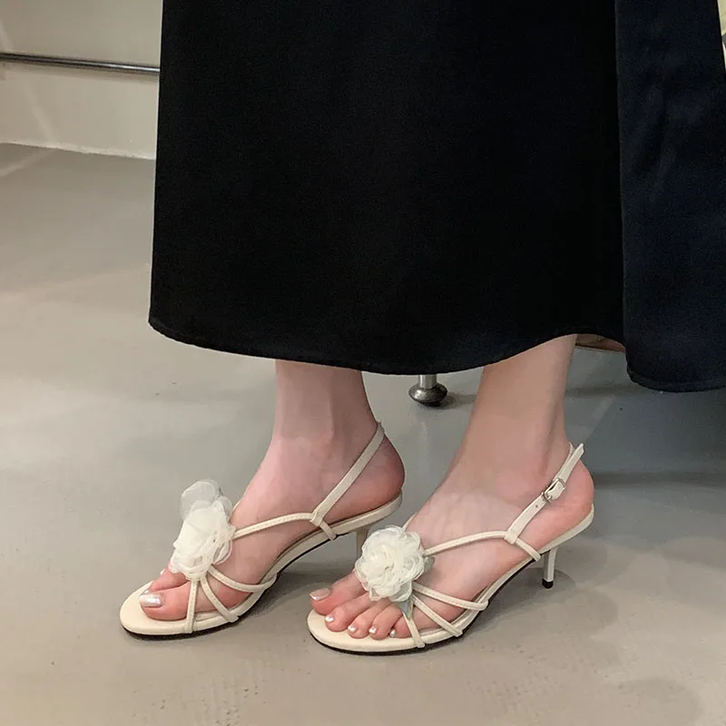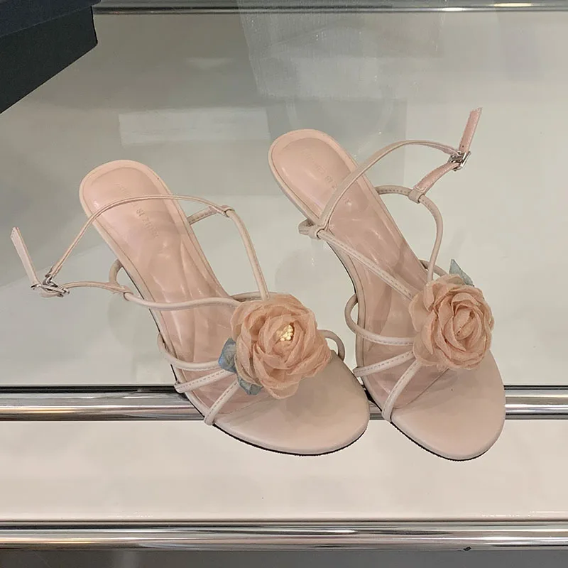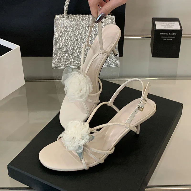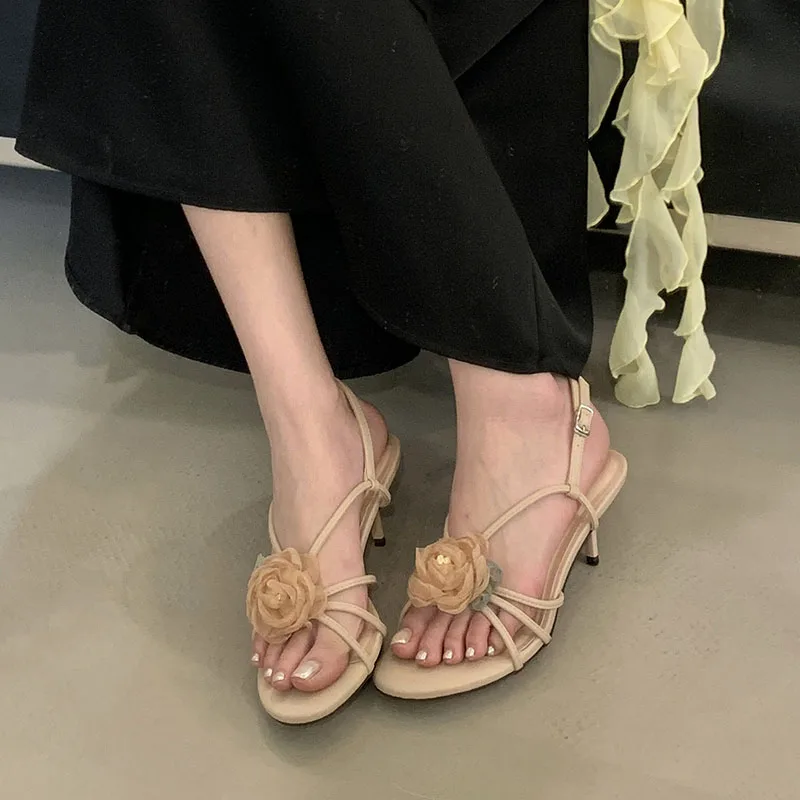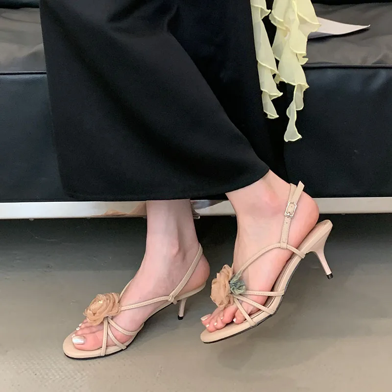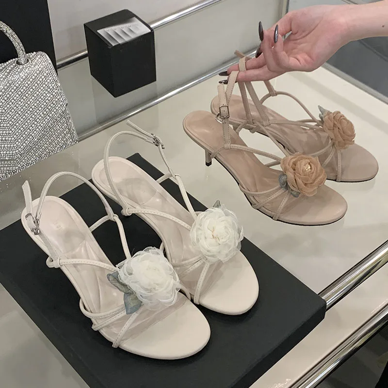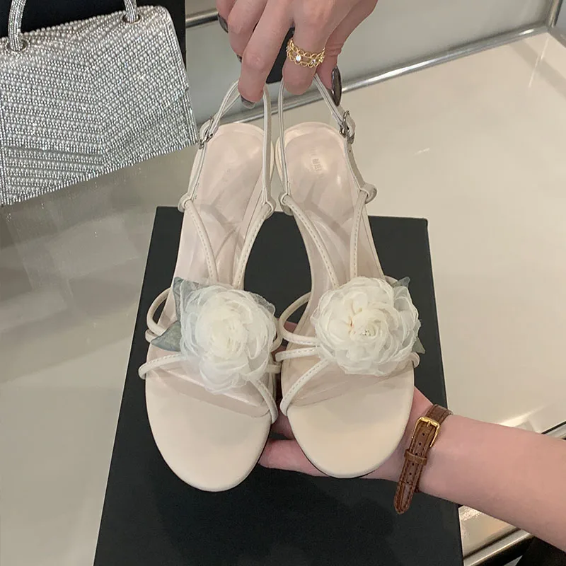 أحذية نسائية بمقدمة مستديرة صنادل بكعب للسيدات على شكل زهرة أحذية للربيع والصيف بحزام بإبزيم أحذية نسائية بكعب متوسط