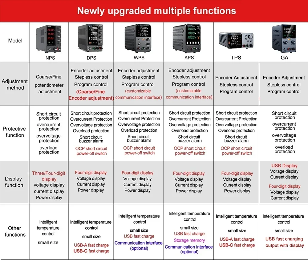 Wanptek's new series products. This model is a miniature switching DC power supply. The output voltage and current can be controlled and adjusted Encoder adjustment, so it provides more convenience and accuracy in the adjustment of voltage and current. The panel also provides high-precision two/three-window digital tube display of voltage, current and power(optional), so that users can intuitively see the current use status and various parameters of the machine