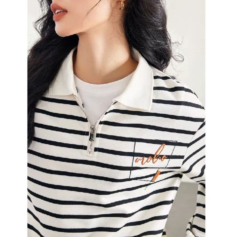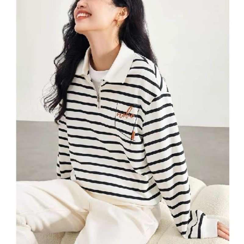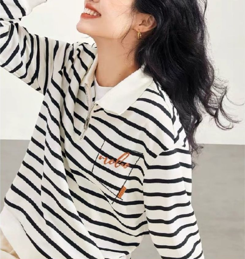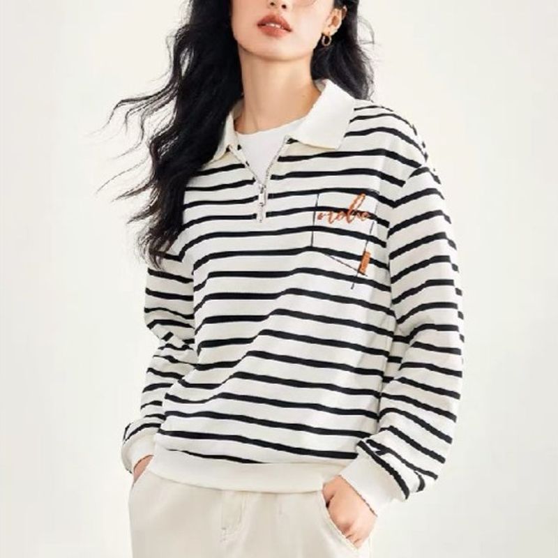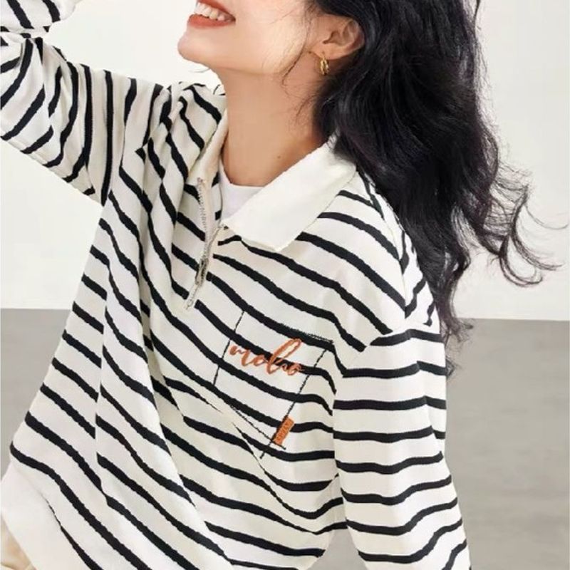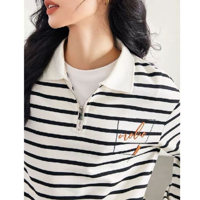 قميص بولو مخطط، تصميم جديد لخريف 2023، فضفاض وكاجوال، سويت شيرت بنقشة زippers لاسية للنساء.