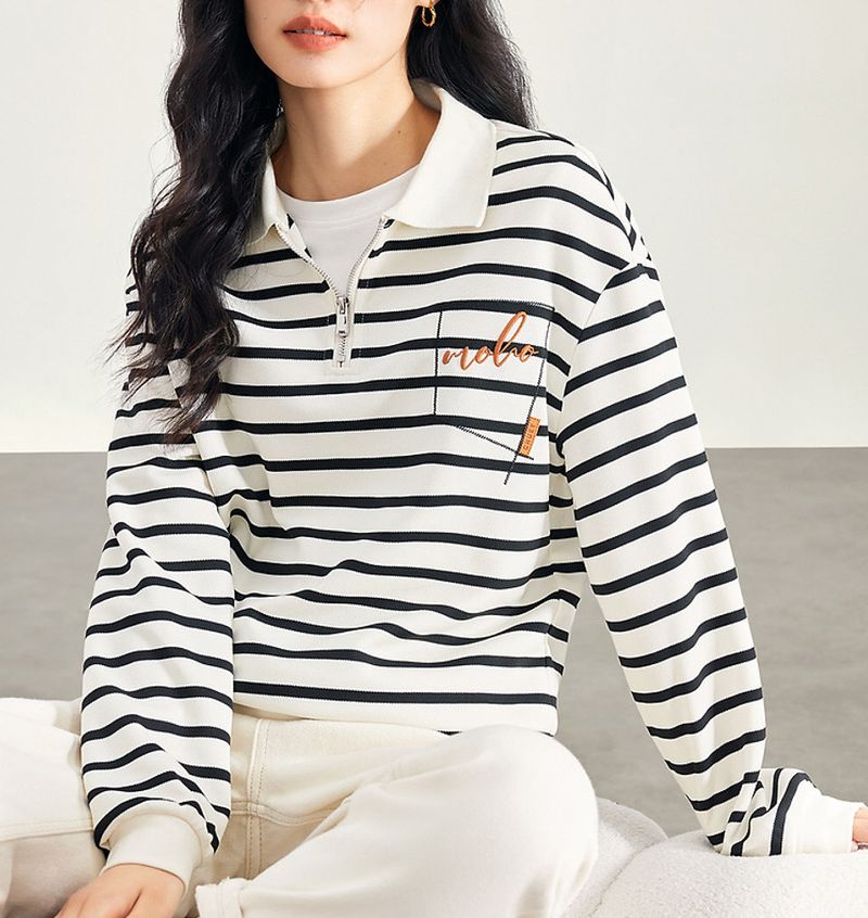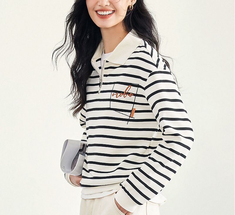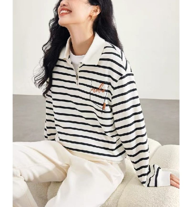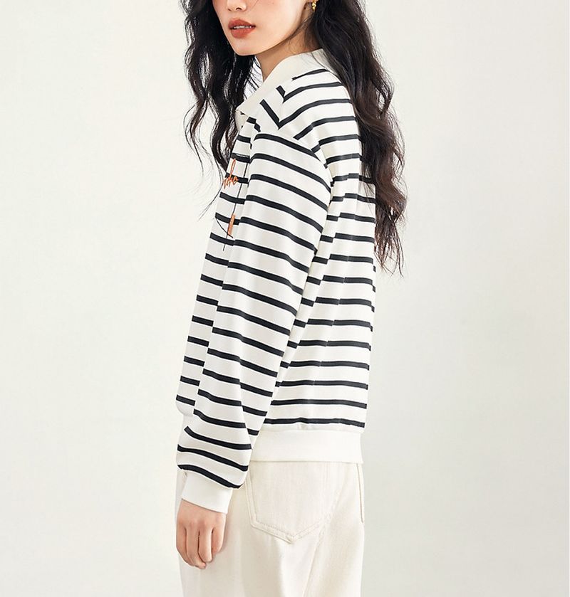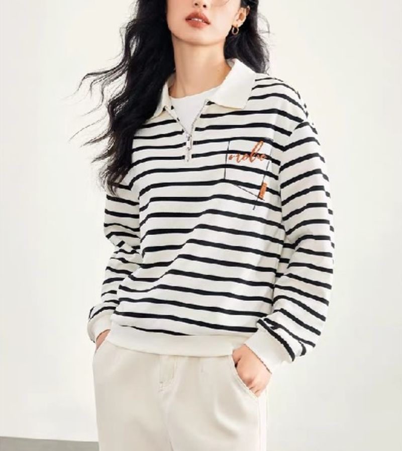 قميص بولو مخطط، تصميم جديد لخريف 2023، فضفاض وكاجوال، سويت شيرت بنقشة زippers لاسية للنساء.
